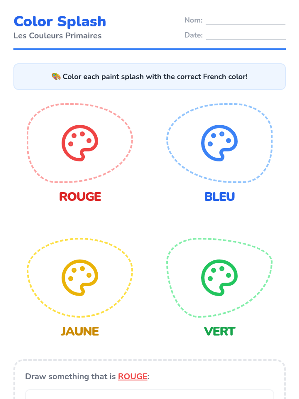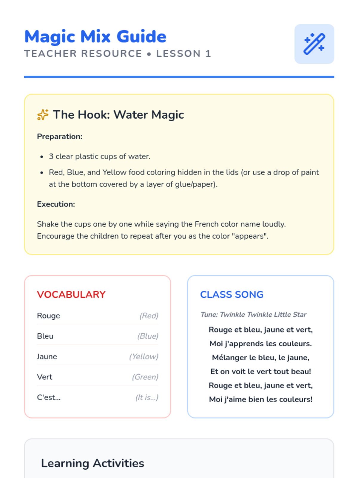 Students are introduced to Rouge, Bleu, Jaune, and Vert through color mixing experiments and songs. They sort objects into colored buckets while chanting the color names.