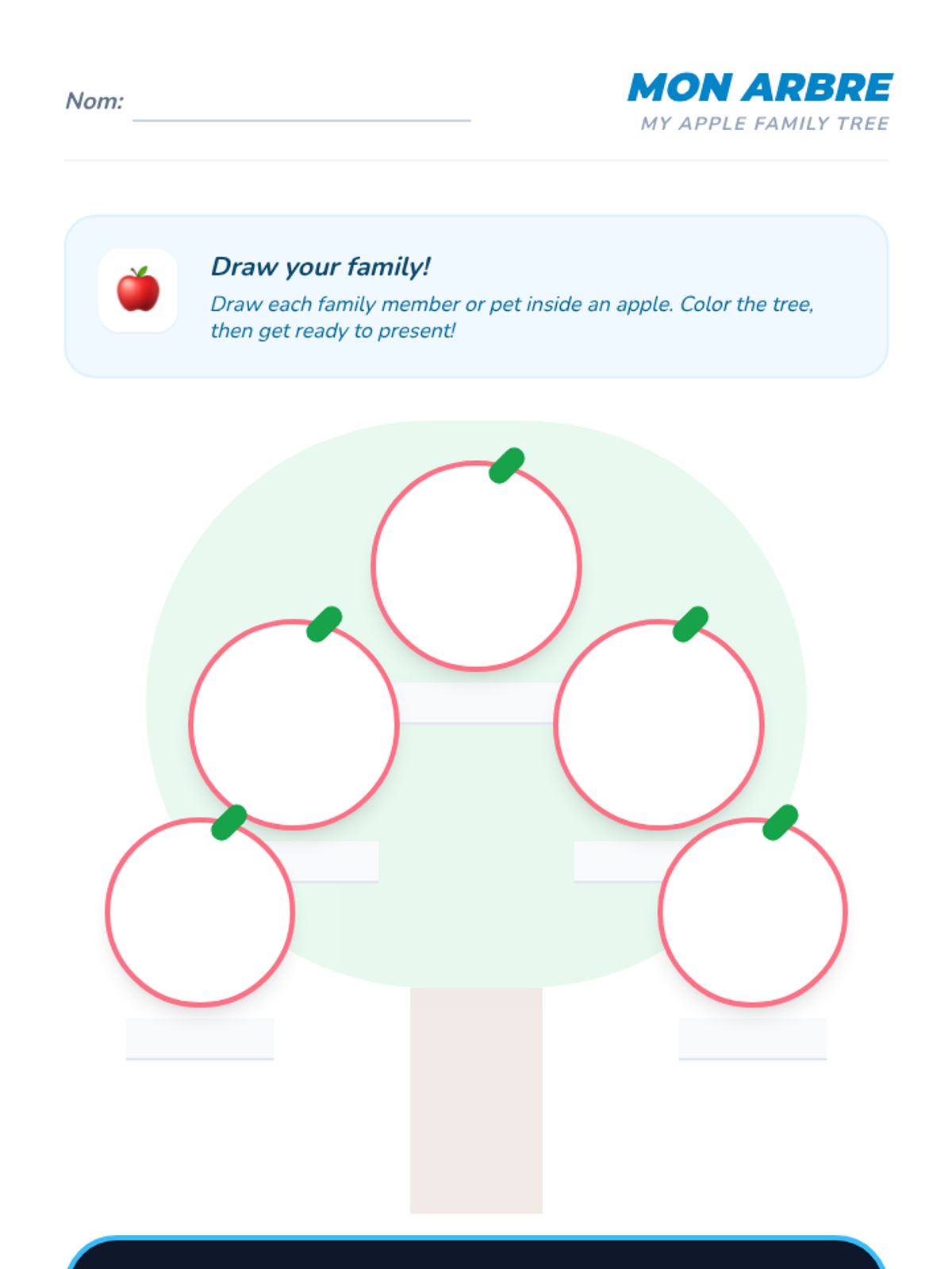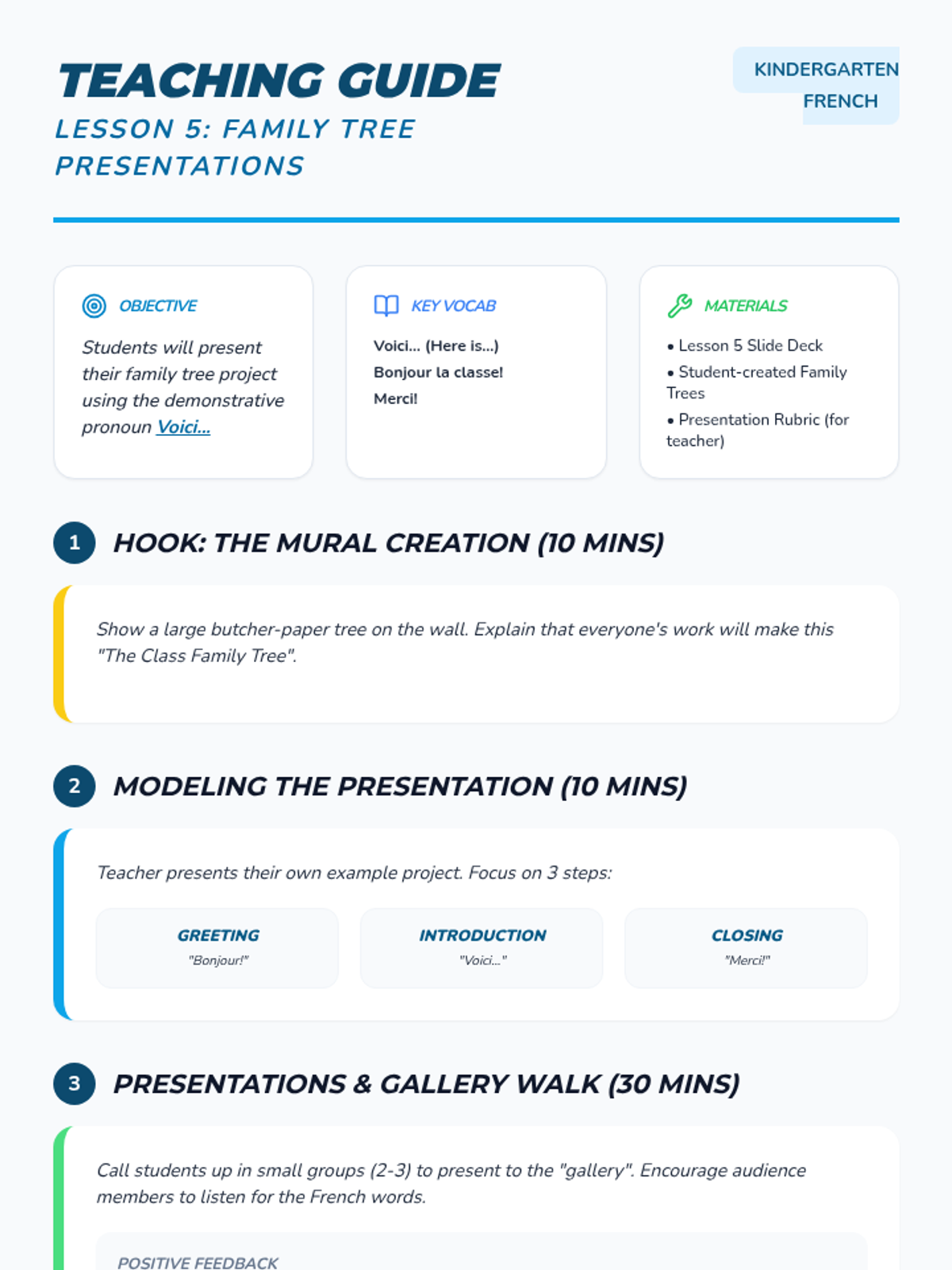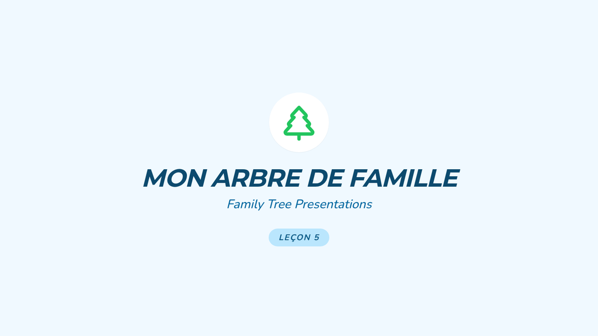 Students present a simple 'Family Tree' using the sentence starter 'Voici...' to introduce their family members and pets.