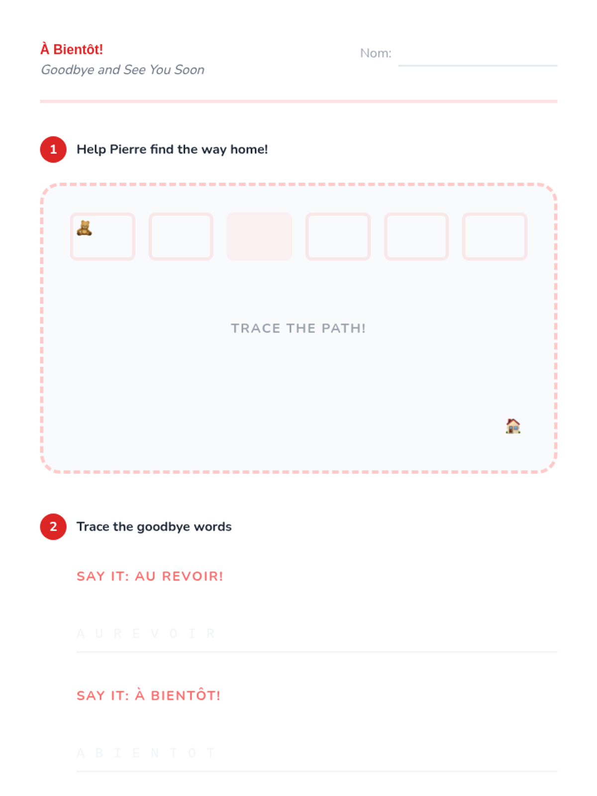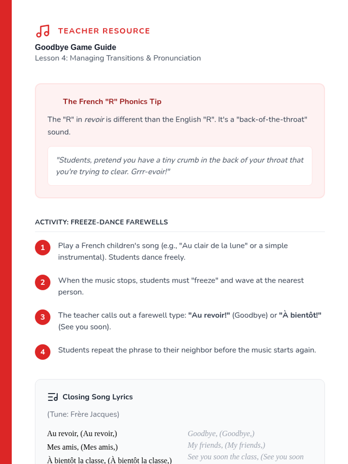 Students focus on 'Au revoir' and 'À bientôt' through a freeze-dance game where music stops and they must find a partner to properly say goodbye to.