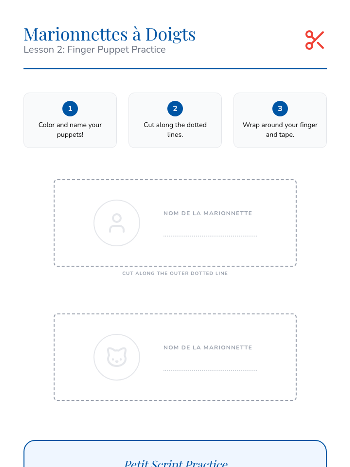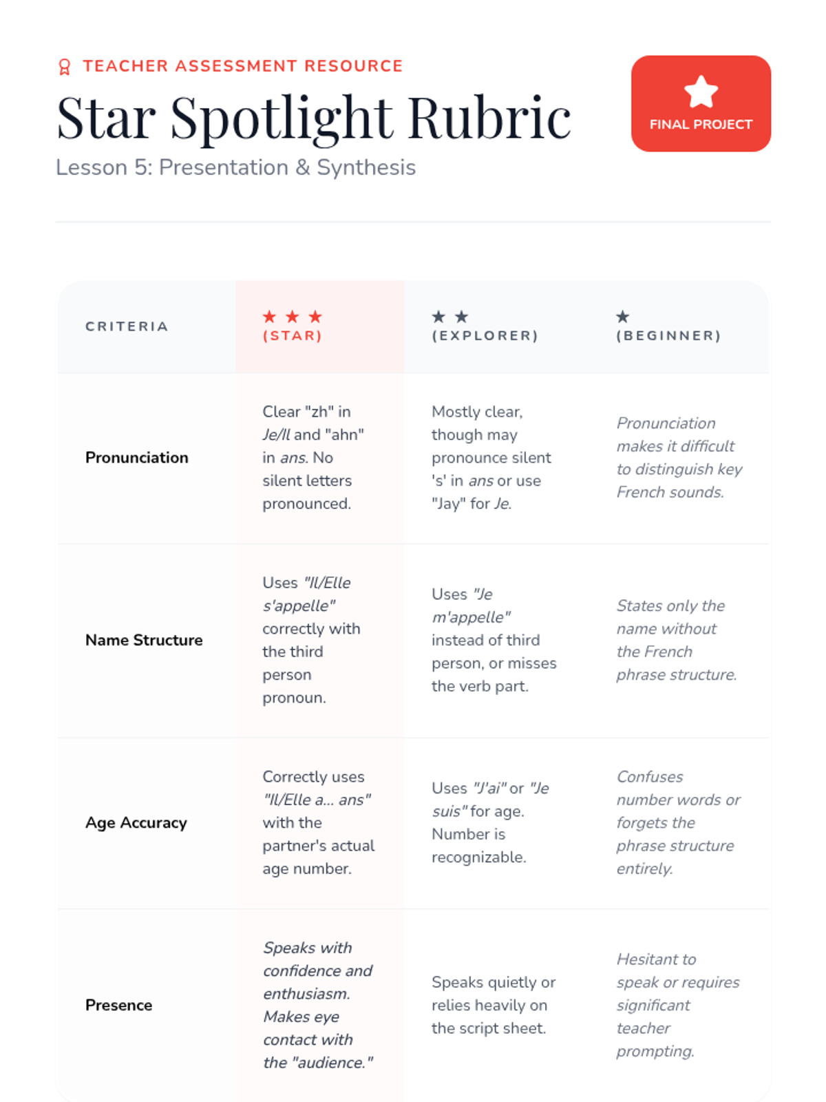 Students learn to ask 'Comment t'appelles-tu?' and practice the question-and-answer flow using secret identities and puppets.