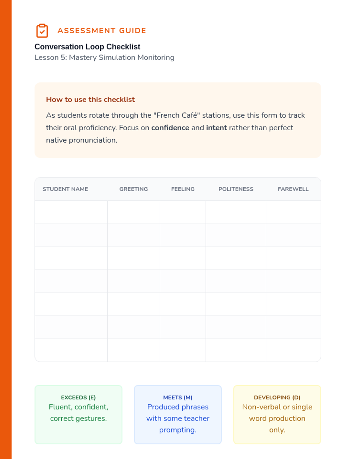 Students combine all previous skills to perform a full 'Greeting Loop': Hello, How are you, Good/Bad, Thank you, Goodbye. They rotate through 'talking stations' to practice with different peers.