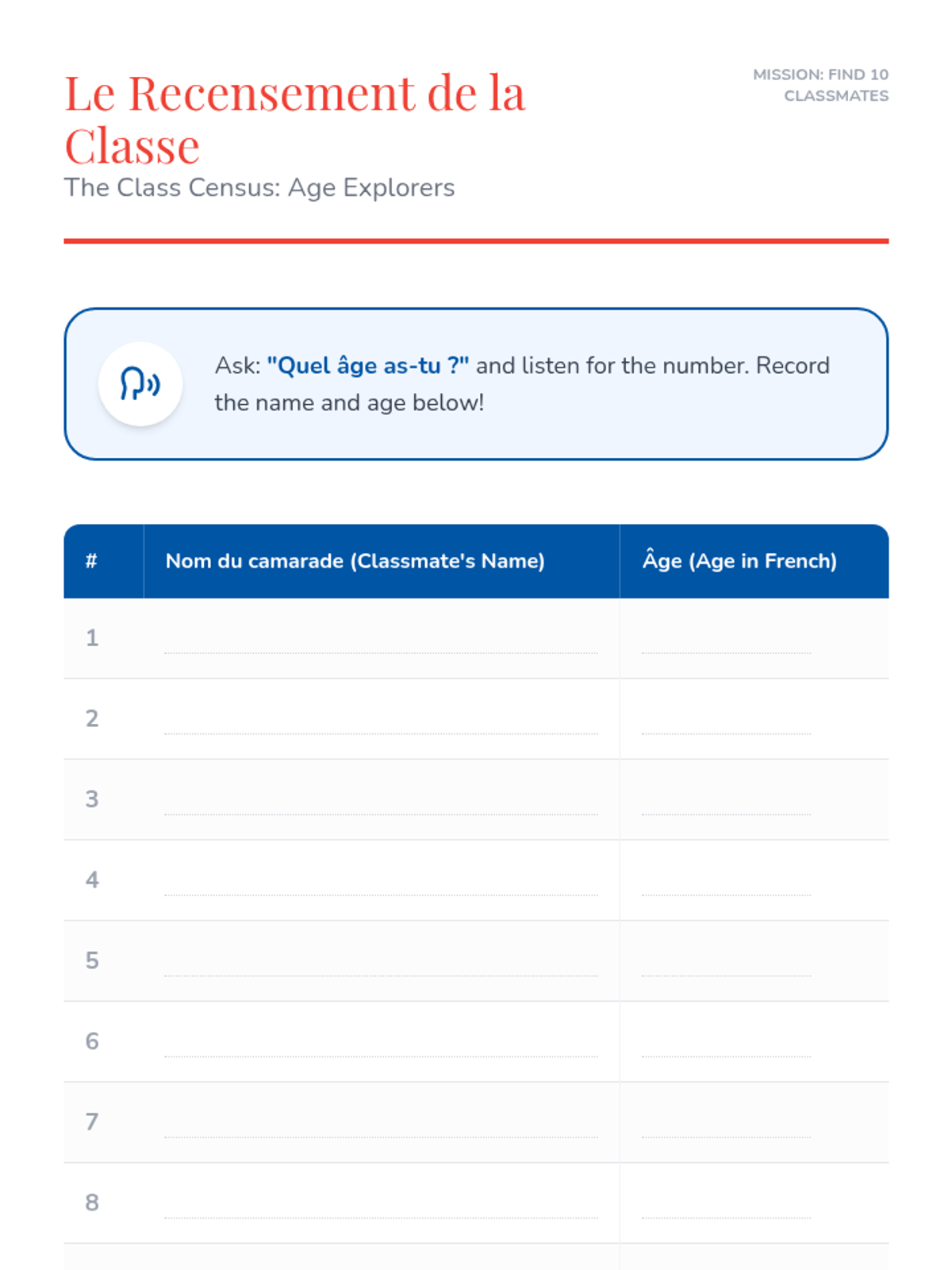 Students master counting from 1 to 12 in French using rhythmic chanting and games to prepare for discussing age.