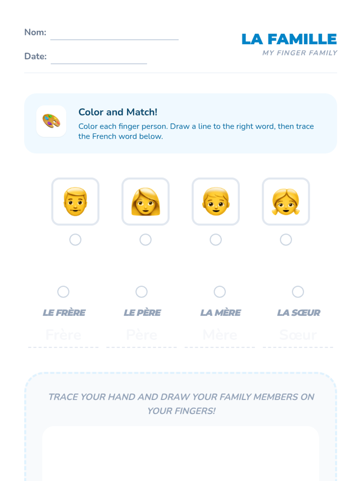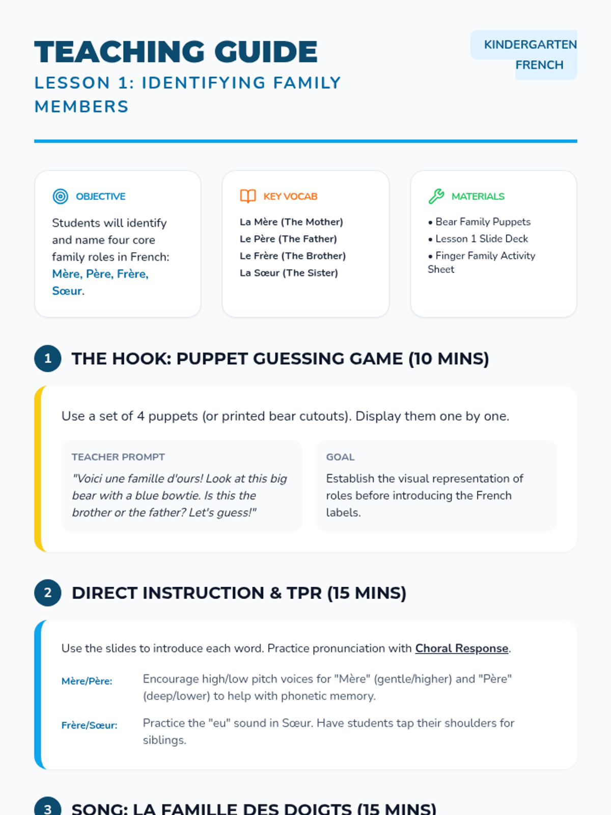 Students learn 'Mère', 'Père', 'Frère', and 'Sœur' using a finger family song and puppets. They practice identifying these roles in storybook illustrations.
