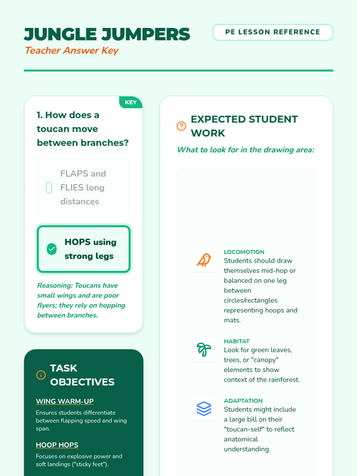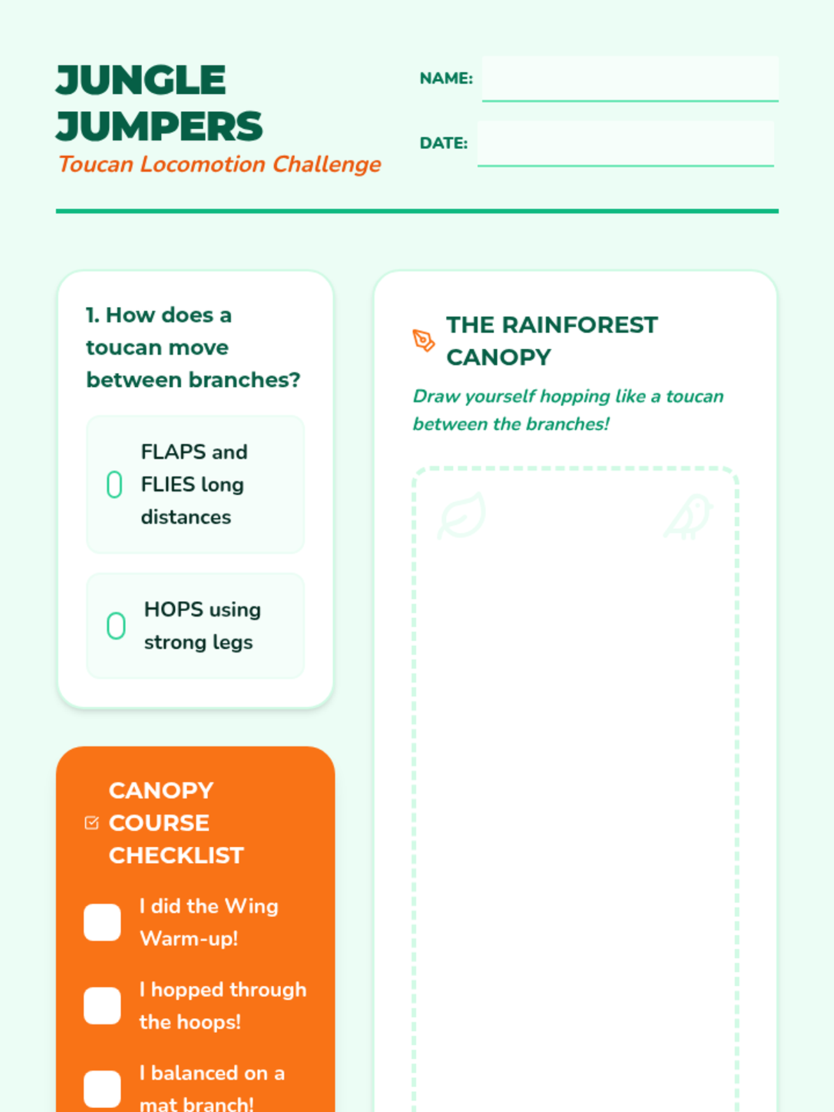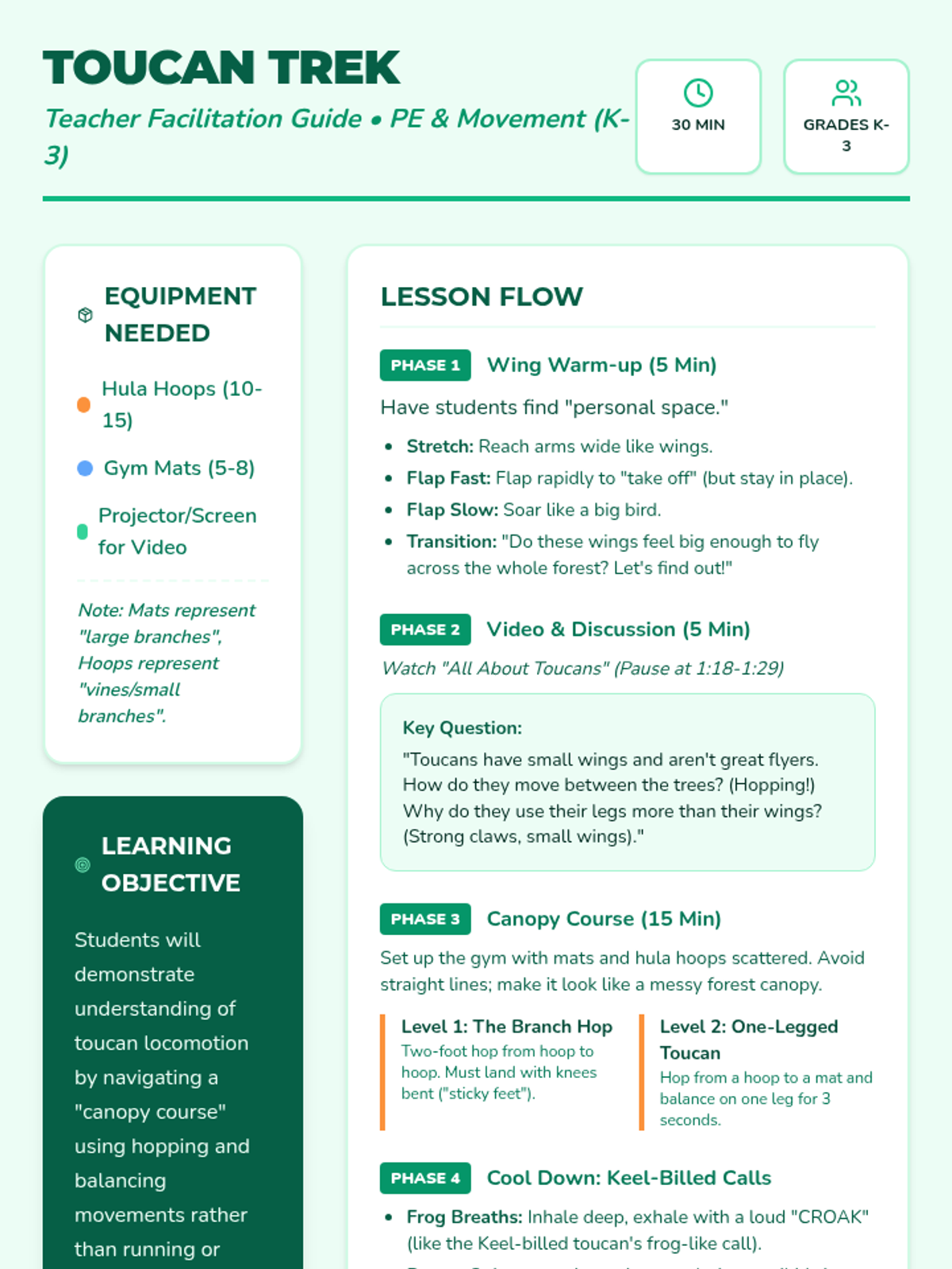 A high-energy PE lesson where students explore the unique locomotion of toucans. Through video observation and a themed 'Canopy Course' obstacle, students learn why these birds hop instead of fly and practice balance and coordination.