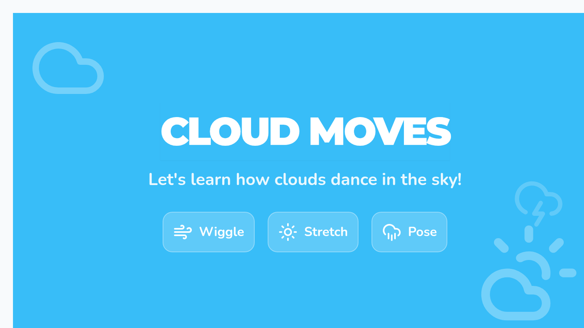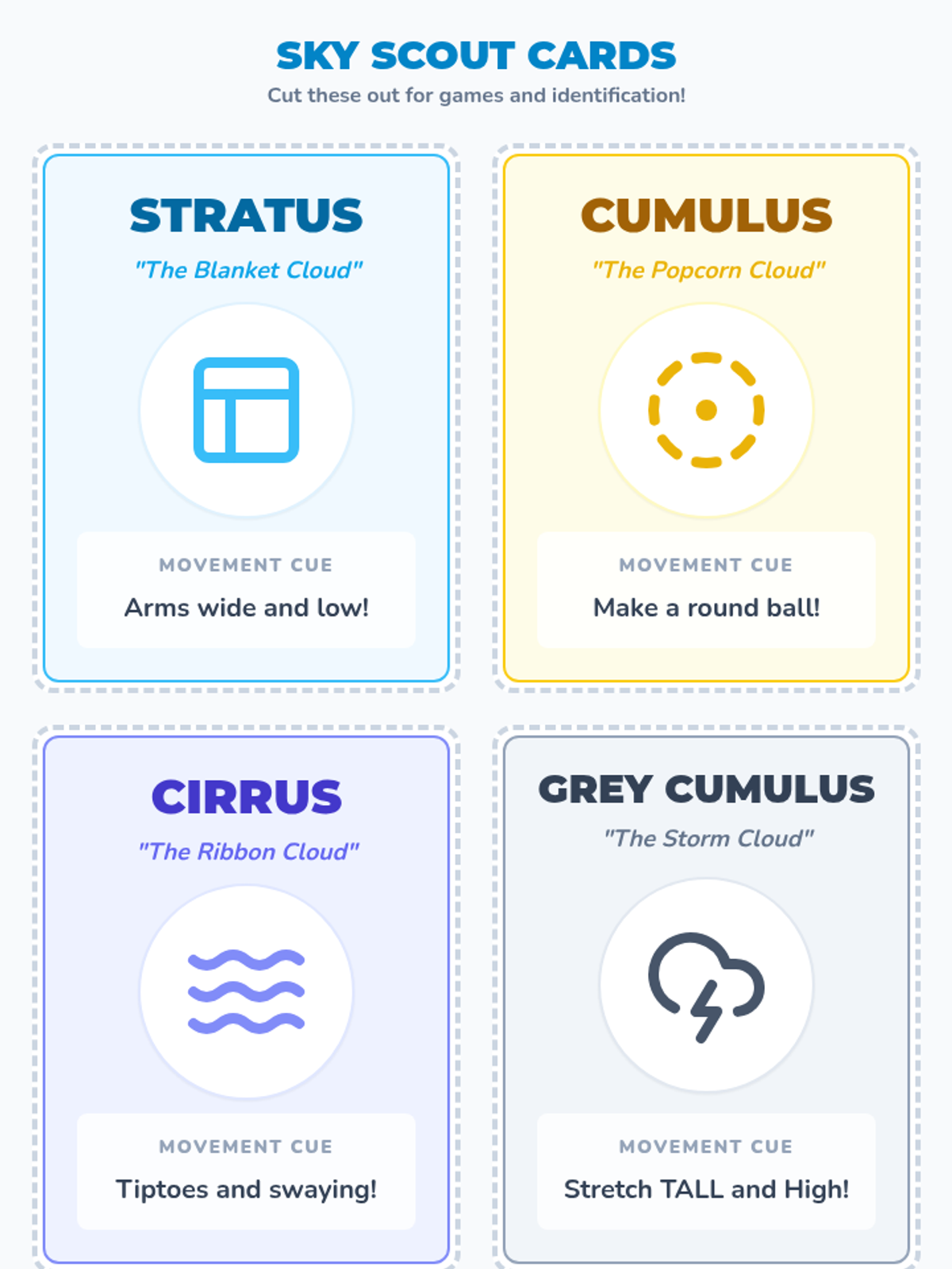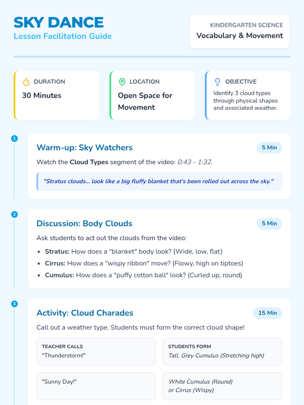 A movement-focused Kindergarten lesson that uses physical association to teach three main cloud types: Stratus, Cumulus, and Cirrus. Students watch a video, engage in a movement-based warm-up, play a cloud identification game, and finish with a cooling stretch.