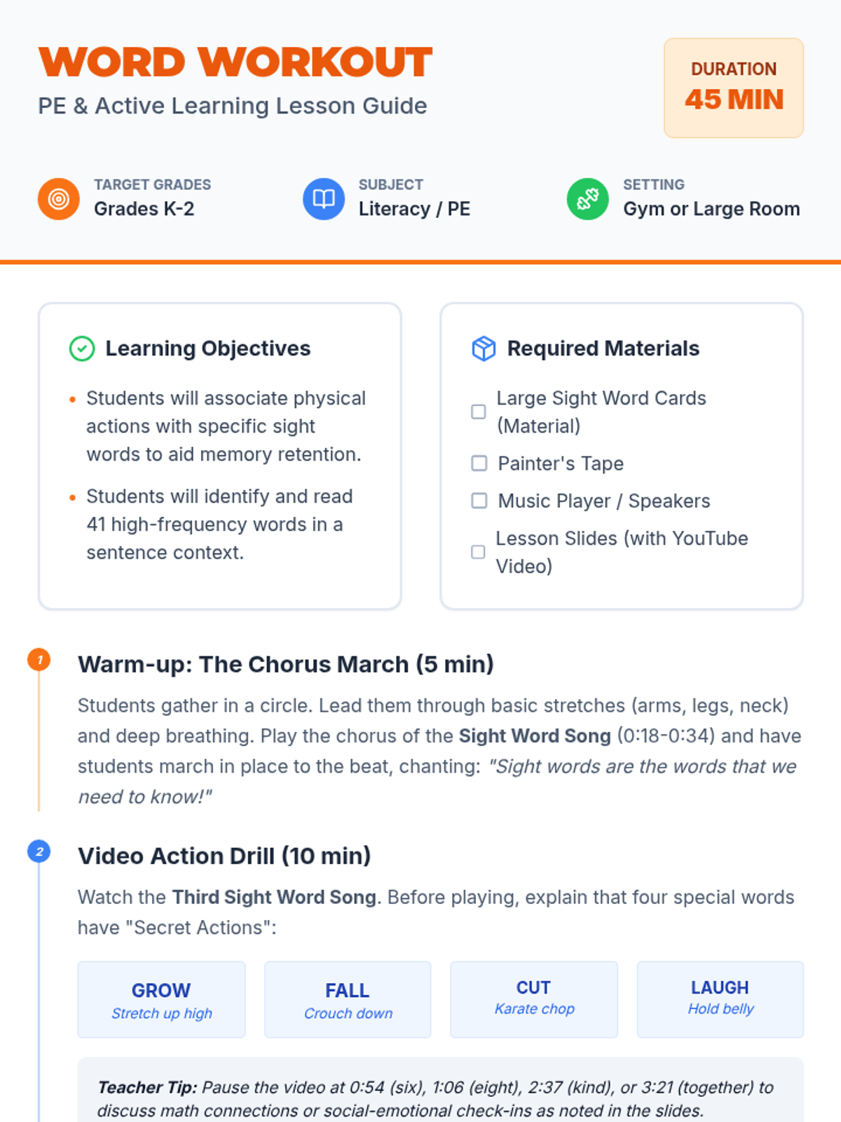 Students combine physical activity with literacy by associating specific sight words with movements. This active learning lesson uses a rhythmic song and a high-energy gym game to reinforce 41 high-frequency words.