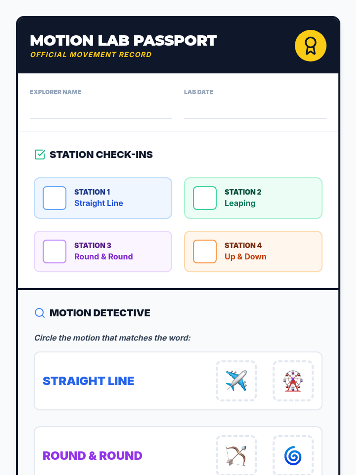 Fundamental movement patterns including locomotor actions, non-locomotor stability, and spatial awareness. Develops body control through fine motor precision and manipulative skills such as throwing and catching.