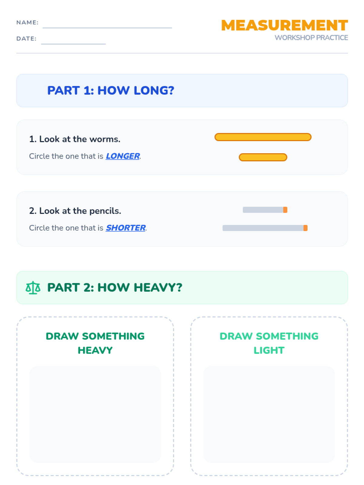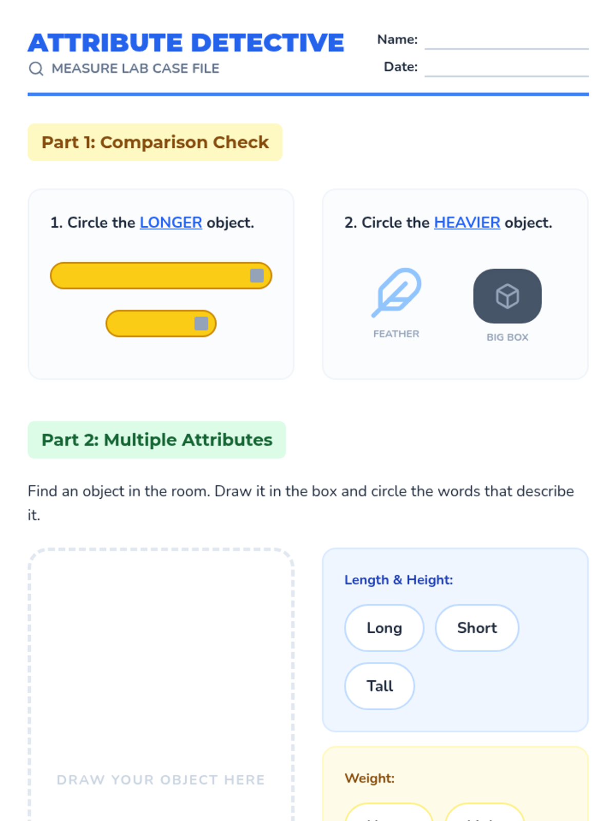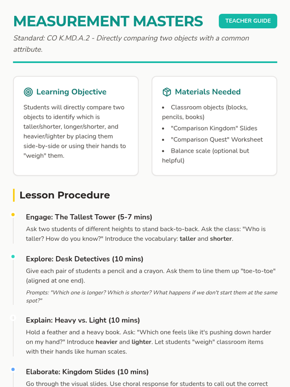 A Kindergarten lesson focused on directly comparing the height, length, and weight of two objects using descriptive language like taller/shorter, longer/shorter, and heavier/lighter.