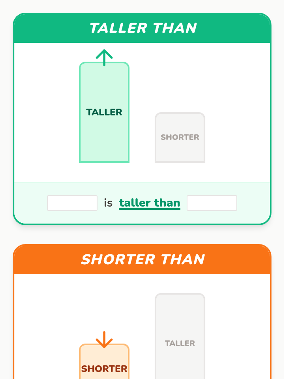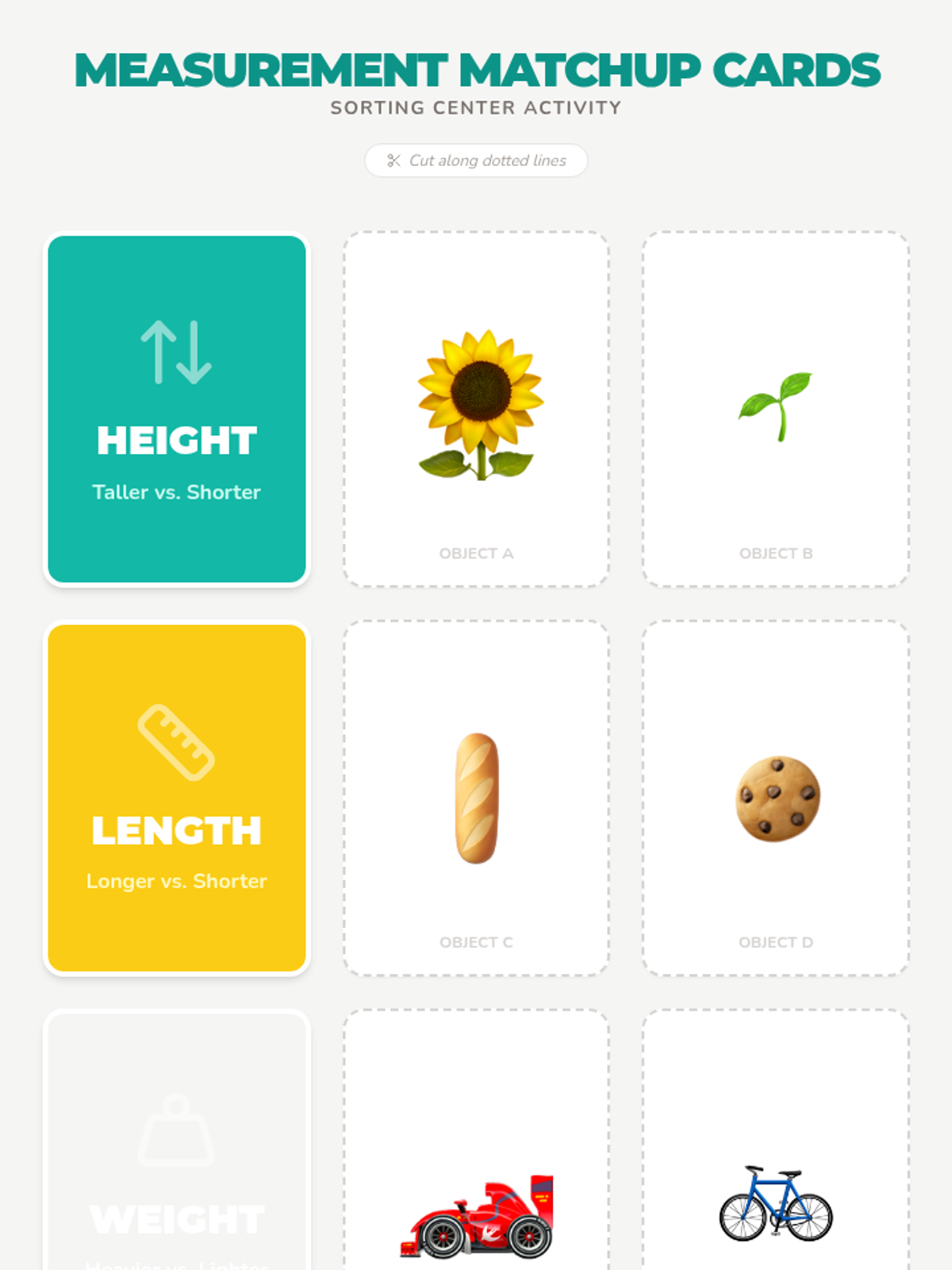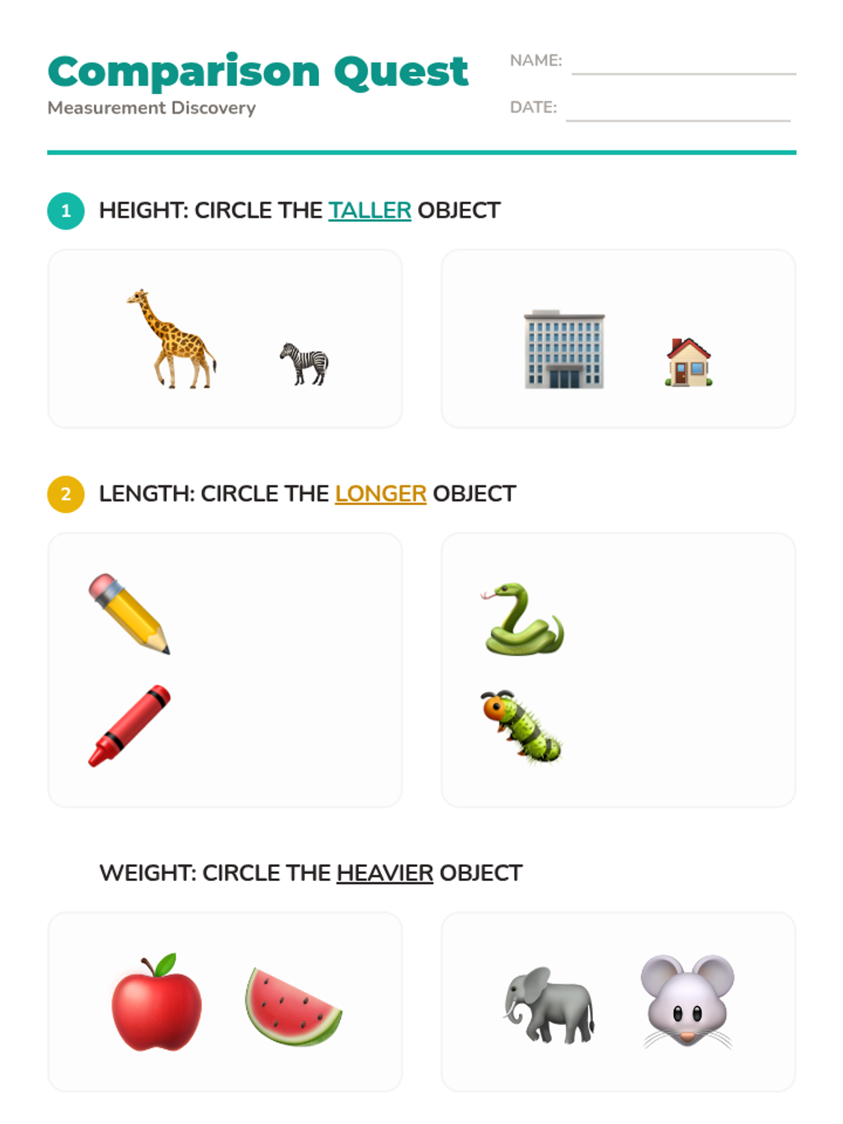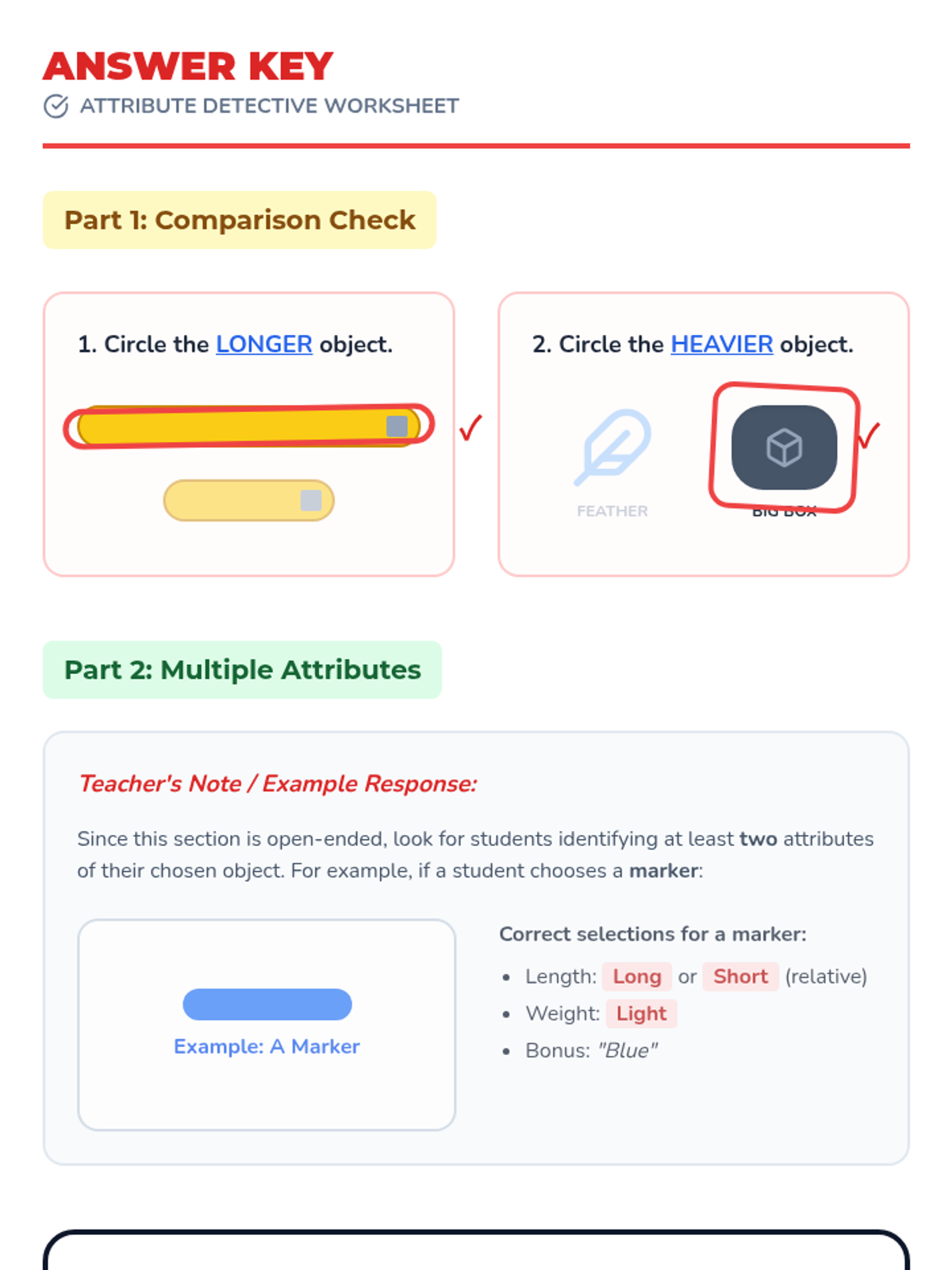 A Kindergarten lesson focused on directly comparing the height, length, and weight of two objects using descriptive language like taller/shorter, longer/shorter, and heavier/lighter.