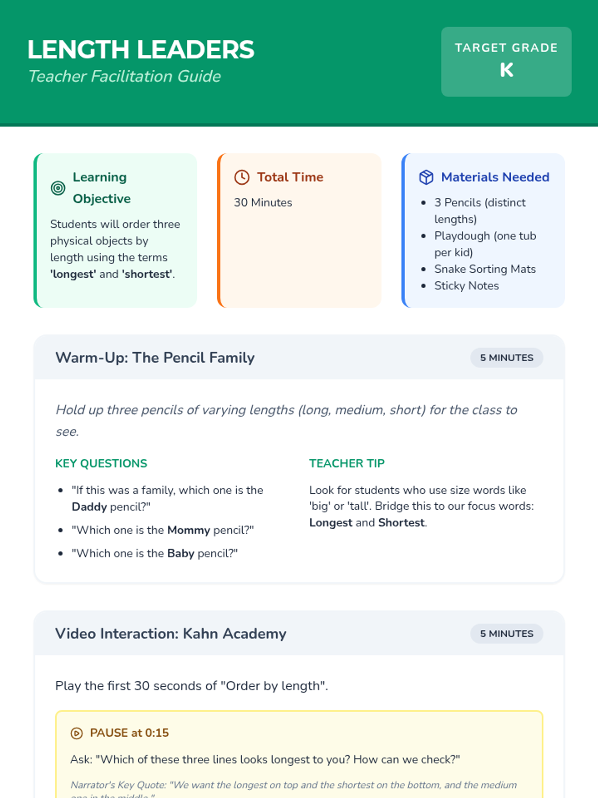 A Kindergarten lesson focused on ordering three objects by length using the terms 'longest' and 'shortest'. Includes a warm-up with pencils, a video analysis, and a hands-on playdough activity.