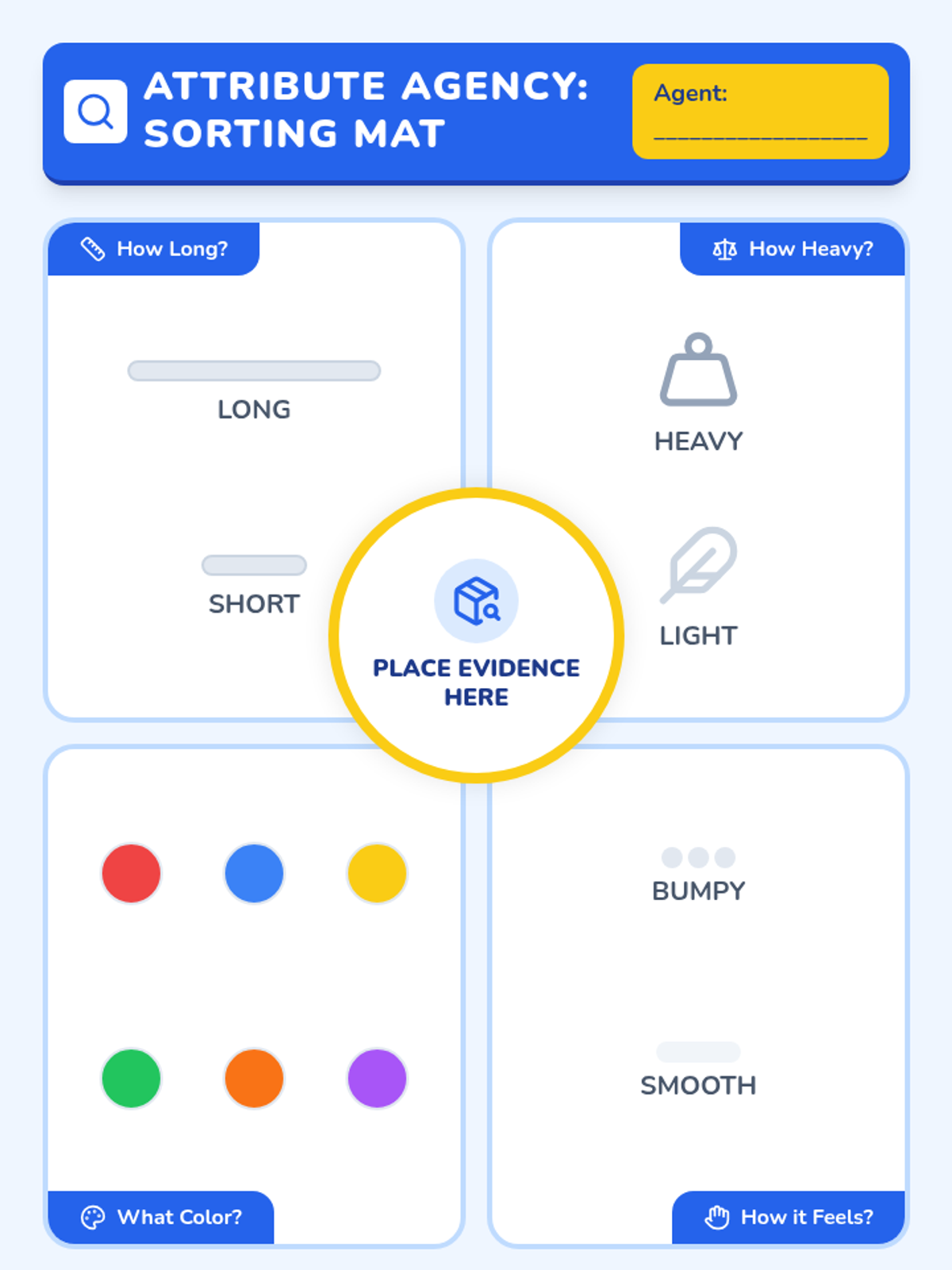 A Tier 2 intervention lesson focused on identifying multiple measurable attributes of objects using the 'Attribute Agency' detective theme. Students use a structured sorting mat and visual cues to describe length, weight, color, and texture.