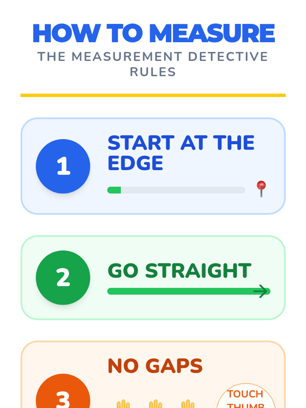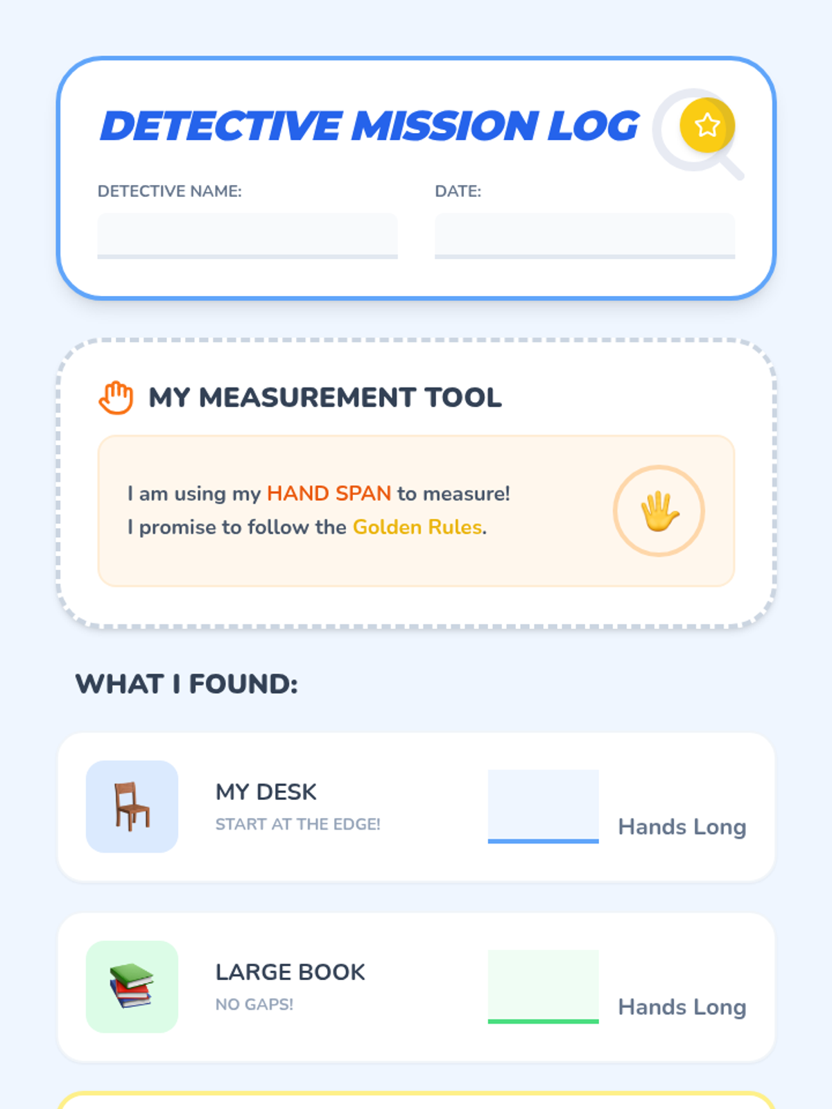 A hands-on Kindergarten lesson introducing the fundamental rules of measurement (start at the edge, keep it straight, no gaps) using hand spans as non-standard units.