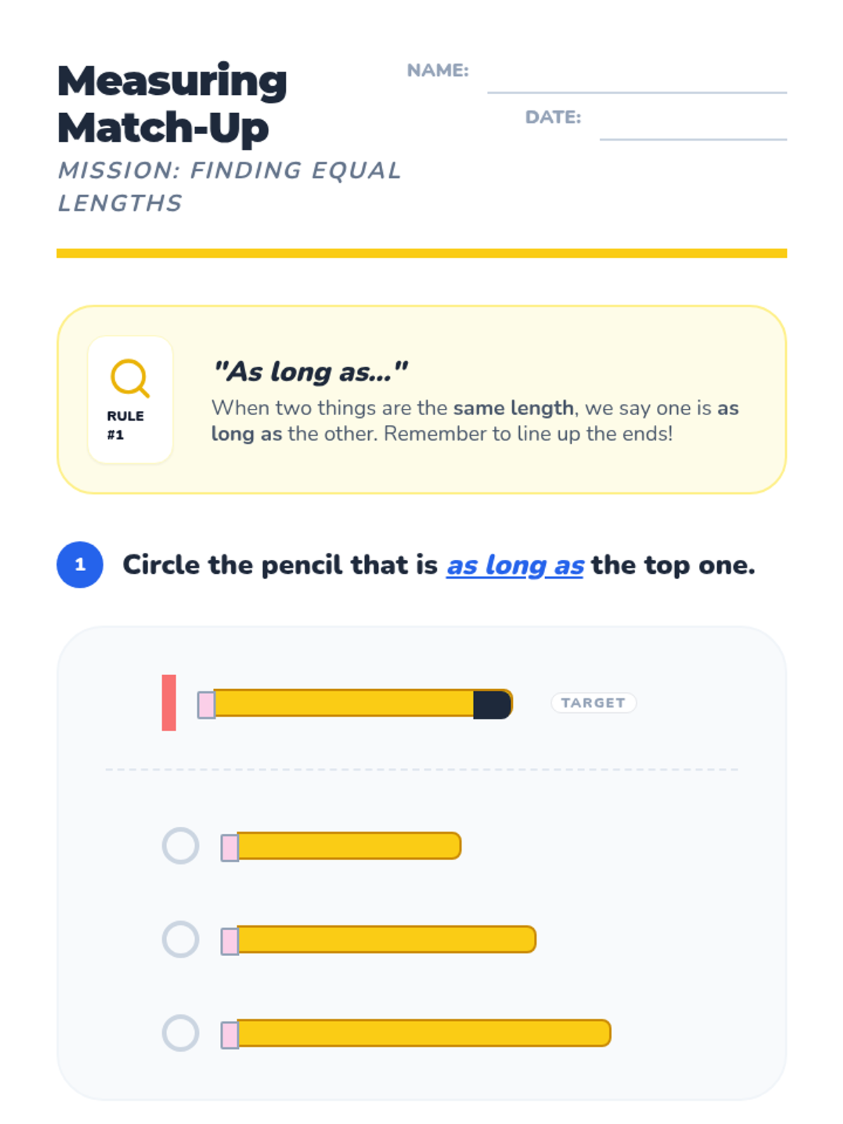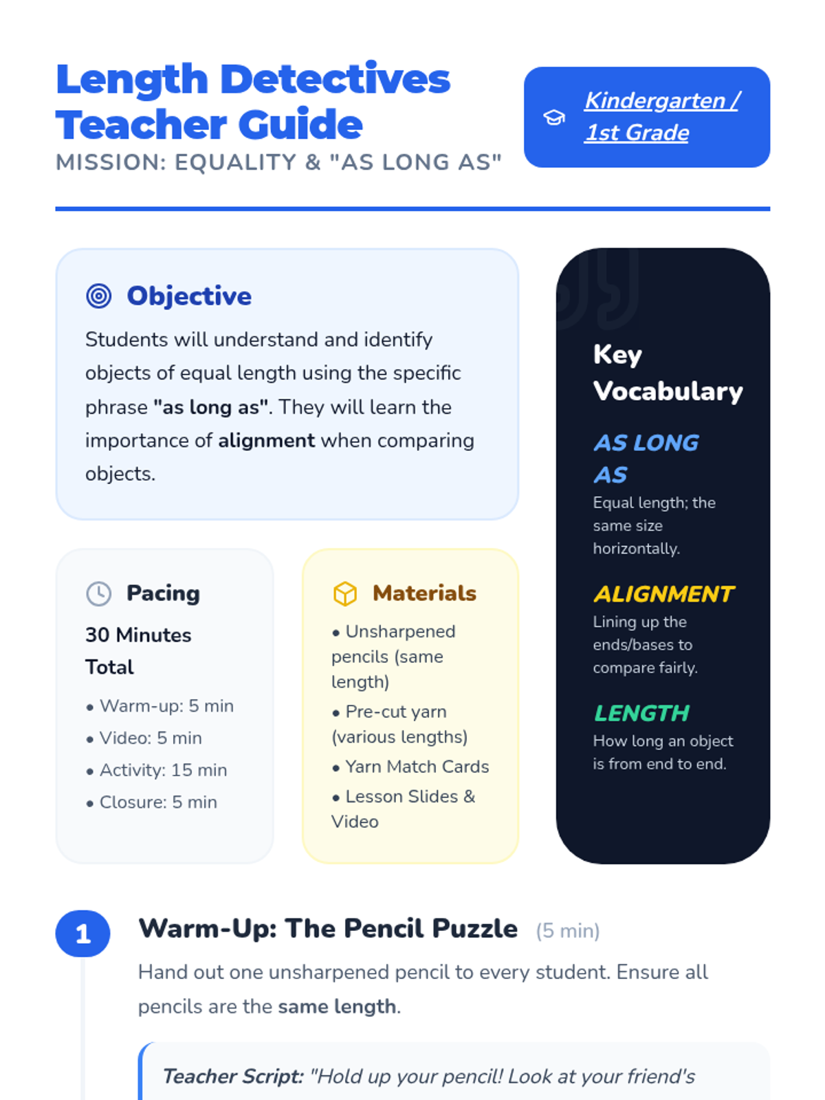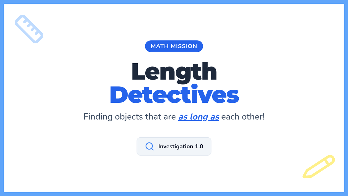 A hands-on introduction to comparing lengths for Kindergarten and 1st Grade students, focusing on the concept of equality using the phrase 'as long as'. Students will use physical tools like pencils and yarn to explore alignment and measurement.