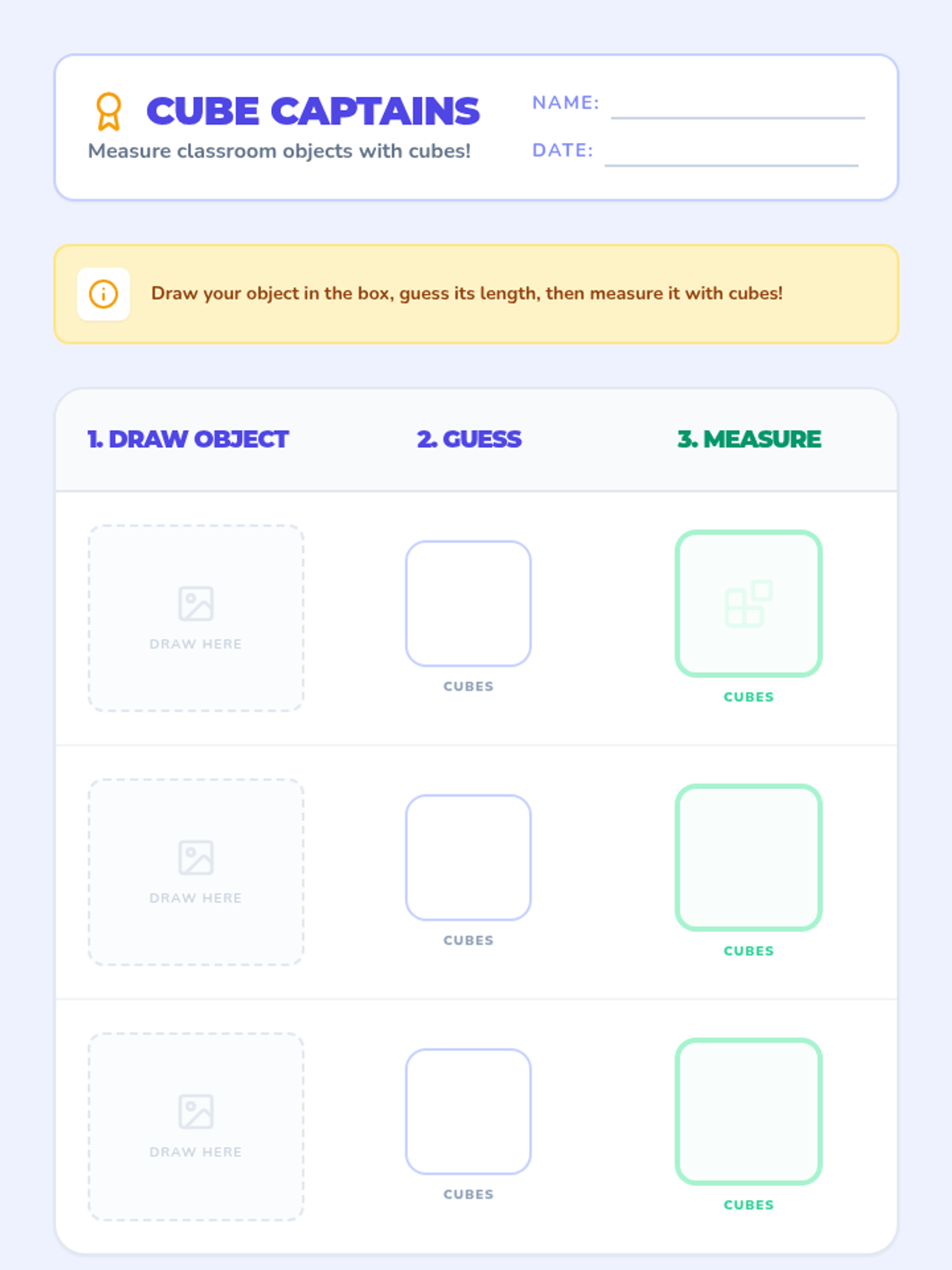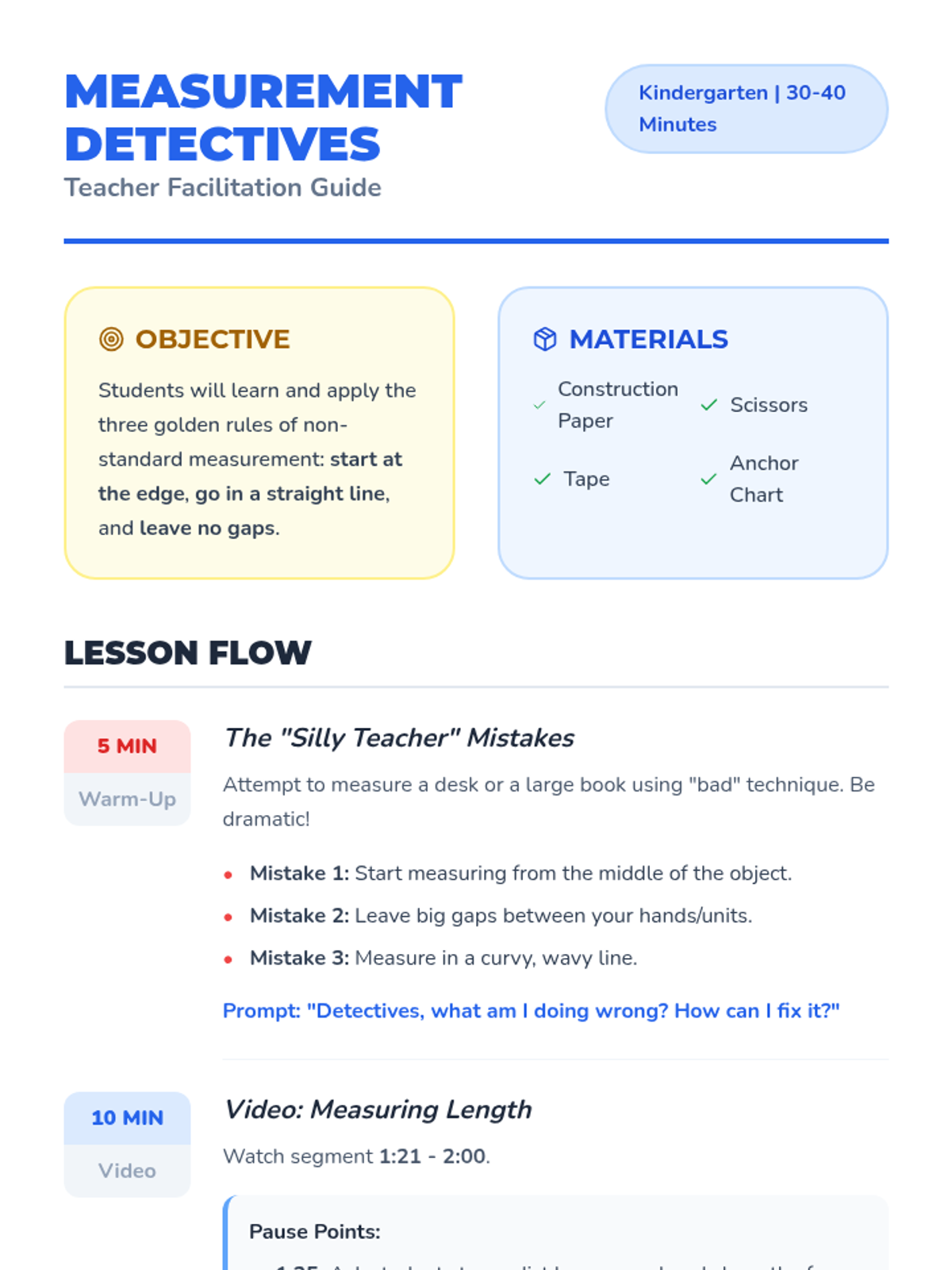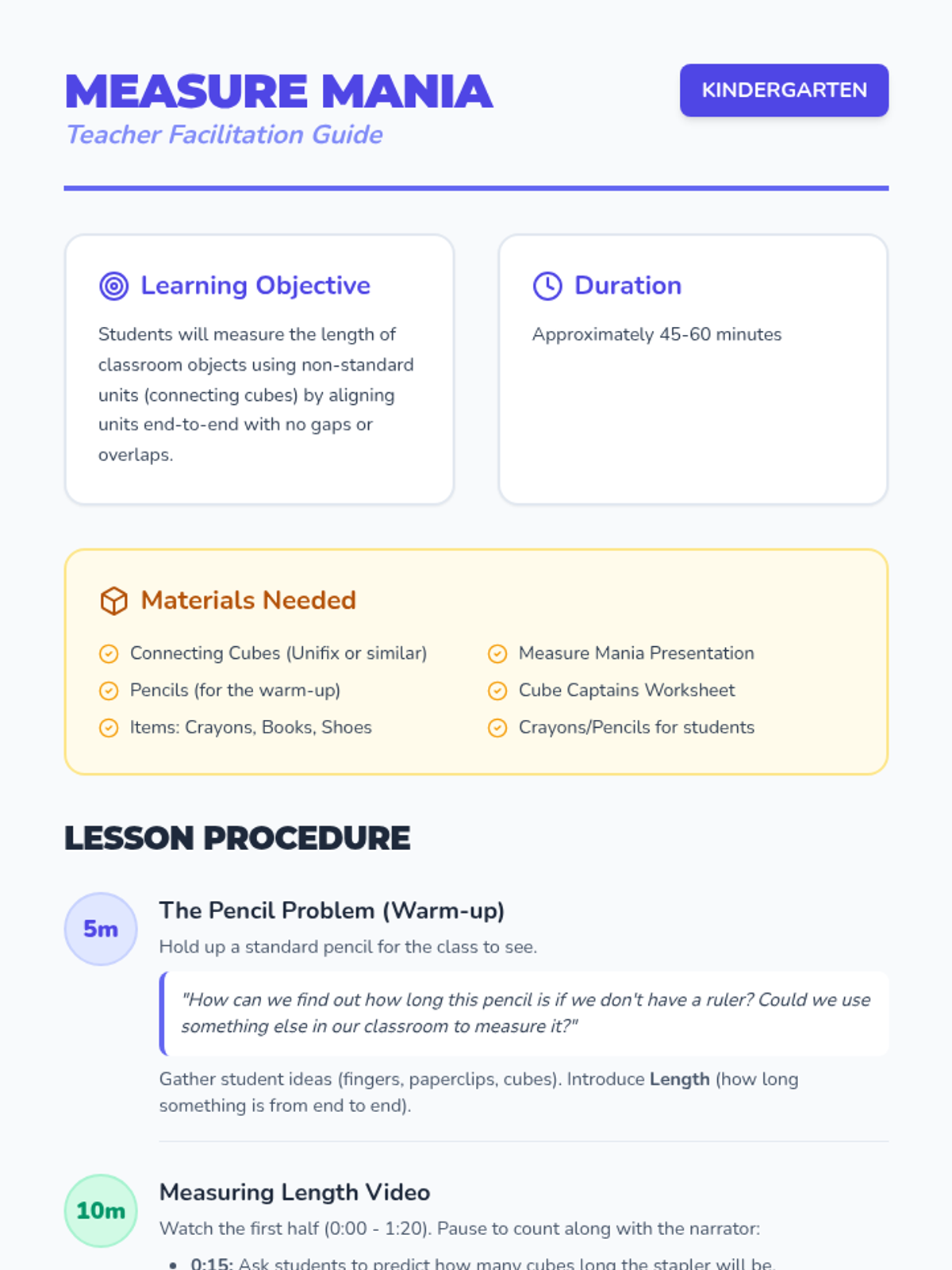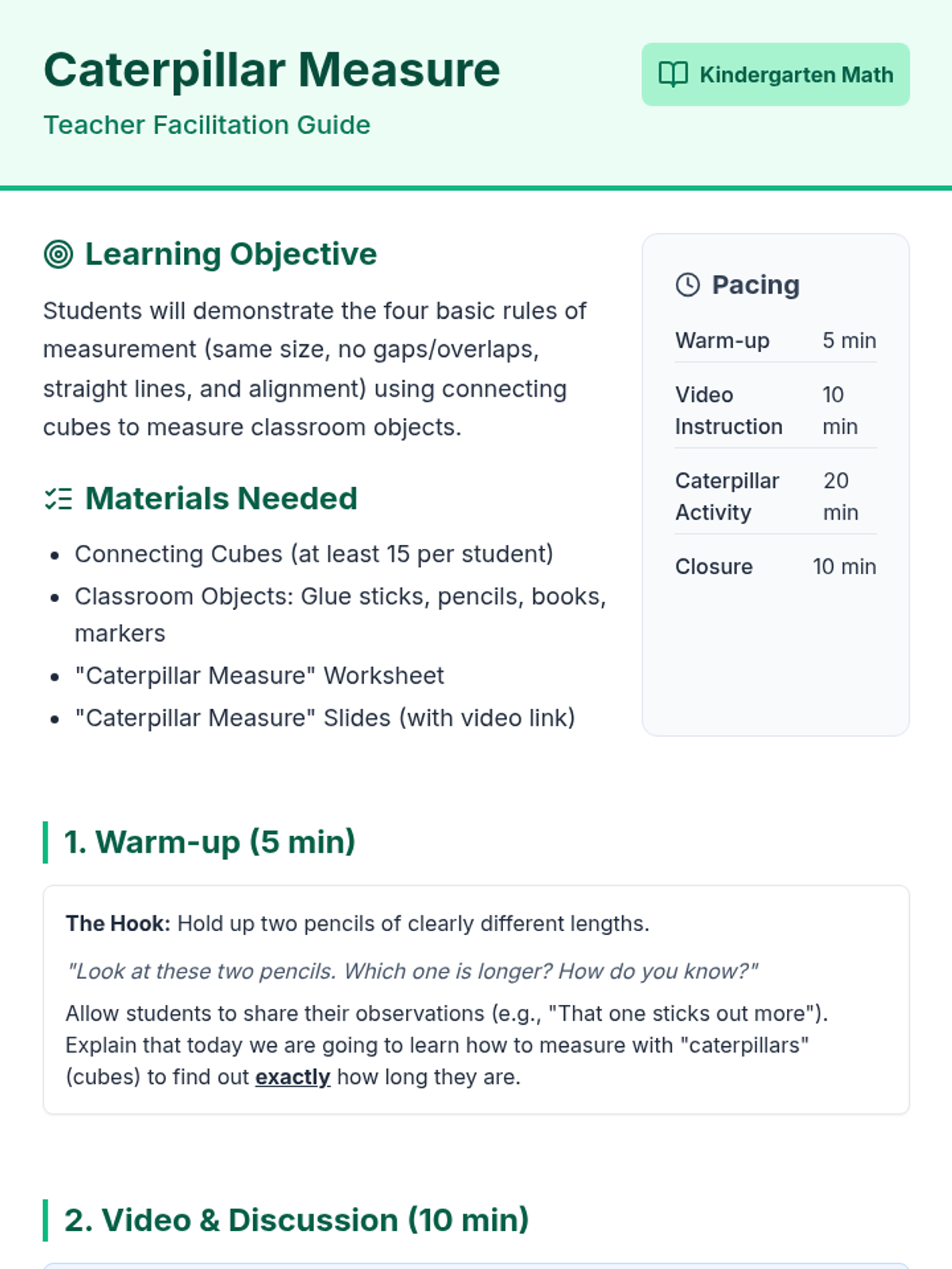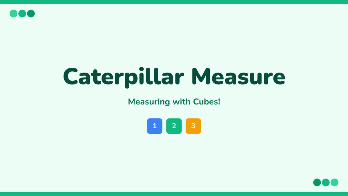 A fun, hands-on introduction to non-standard measurement for Kindergarten students. Students use connecting cubes (their 'caterpillars') to measure classroom objects while learning the four golden rules of measurement: same size, no gaps or overlaps, straight lines, and starting at the edge.
