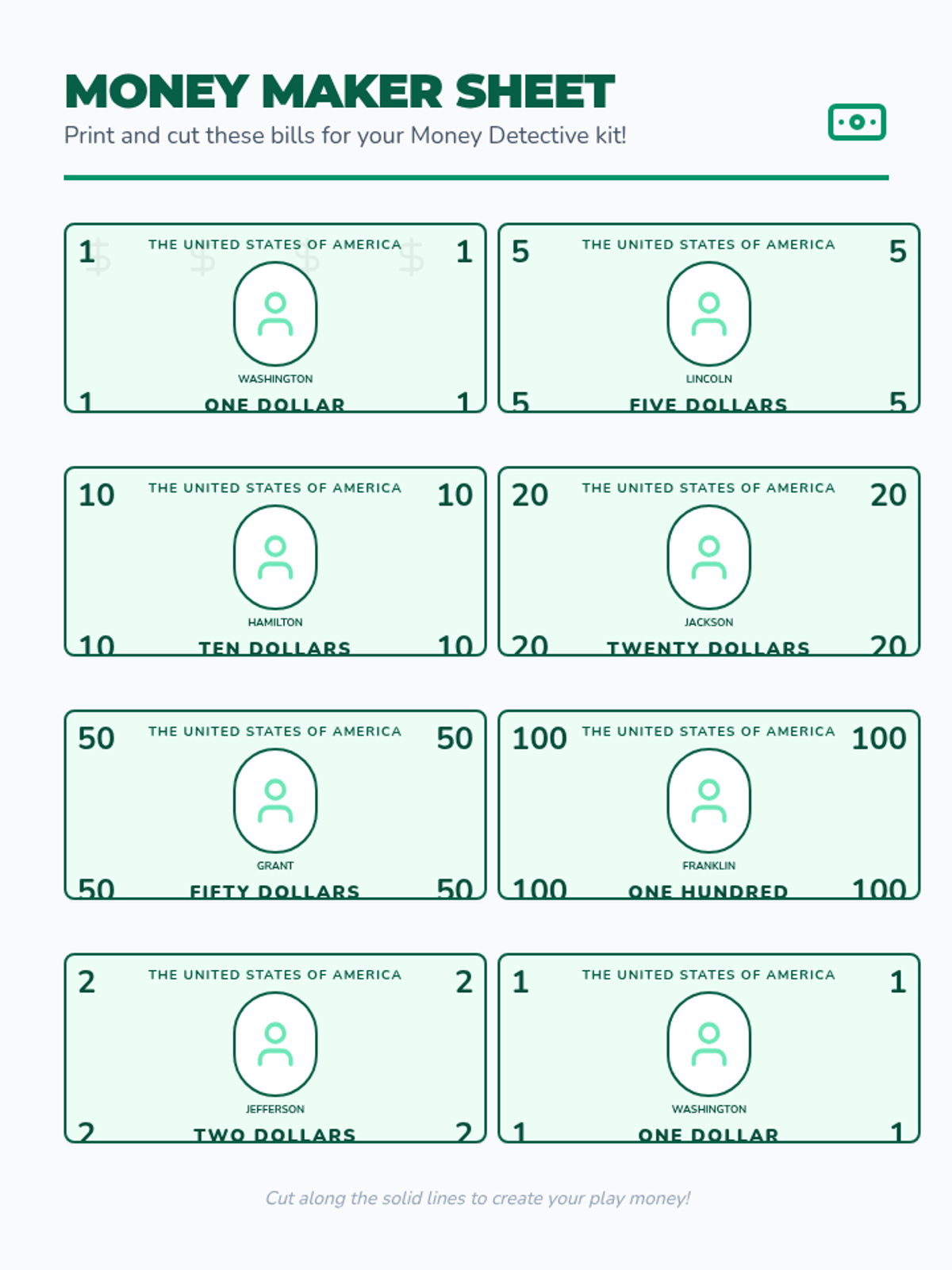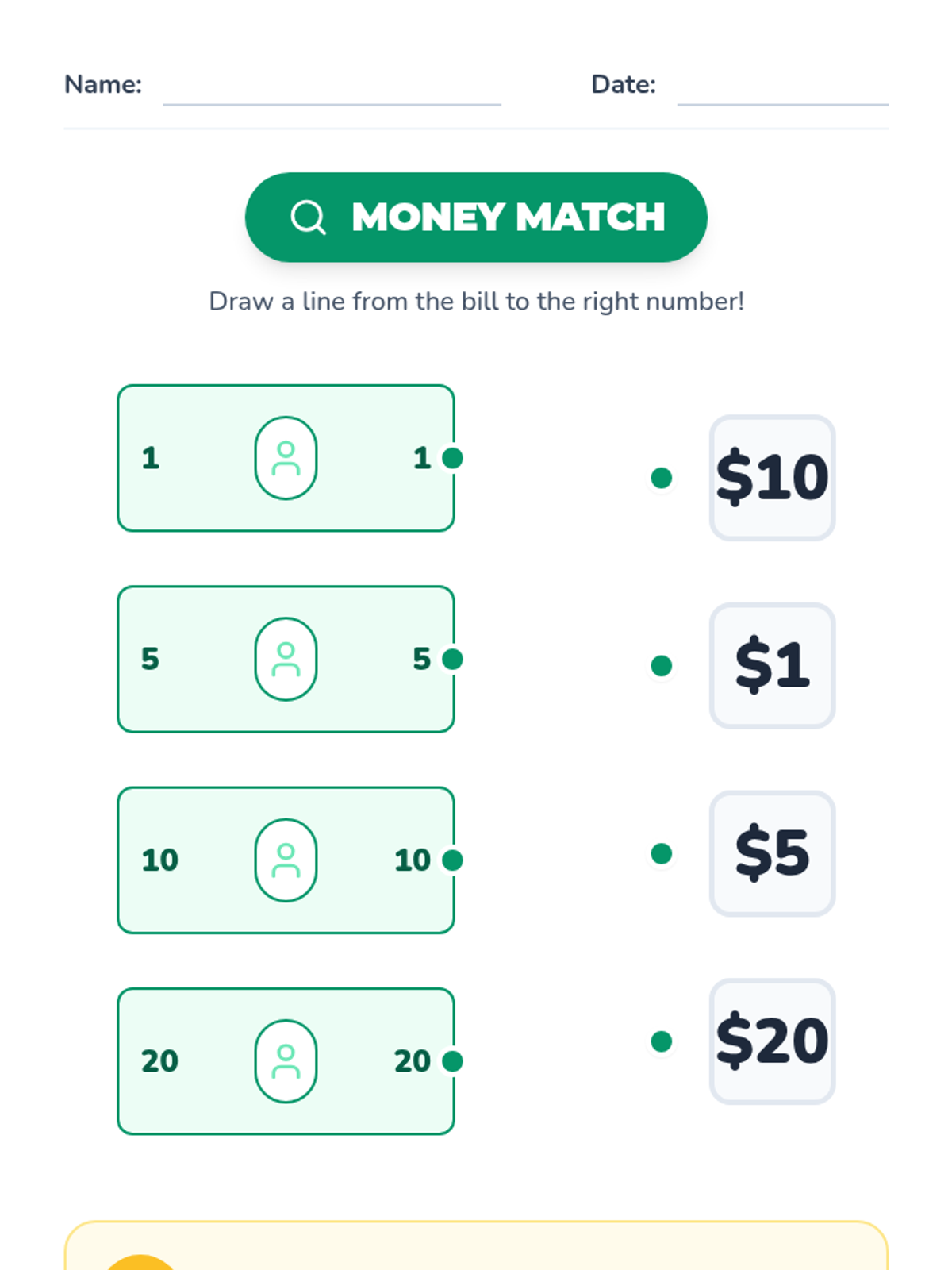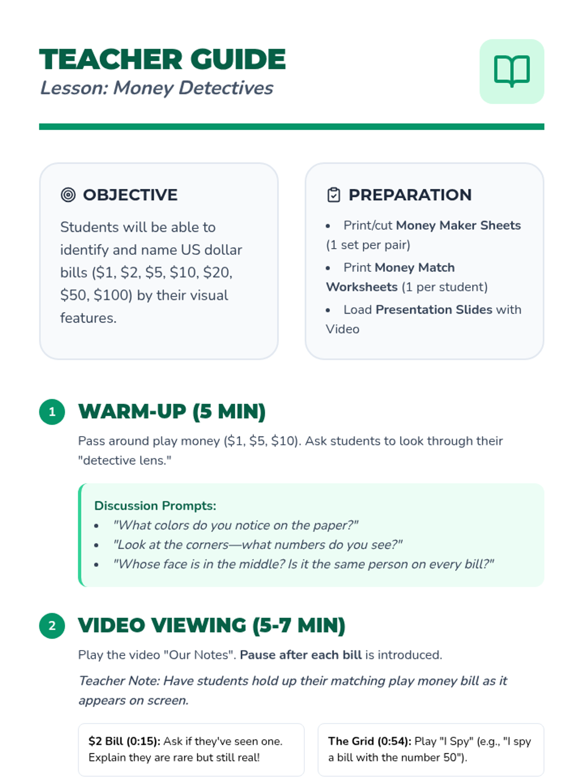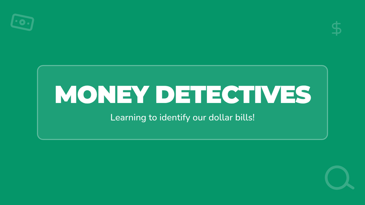 A Kindergarten lesson focused on identifying US dollar bills ($1, $2, $5, $10, $20, $50, $100) by their visual features through video observation, hands-on sorting, and matching activities.
