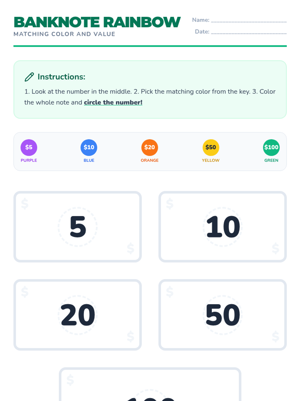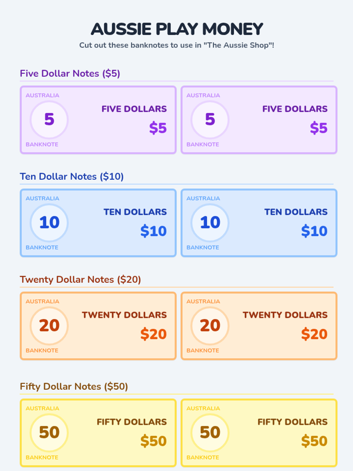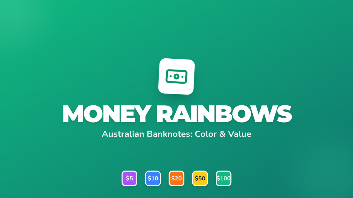 A Kindergarten to 1st Grade introduction to Australian currency, focusing on color recognition and numerical value of $5, $10, $20, $50, and $100 banknotes.