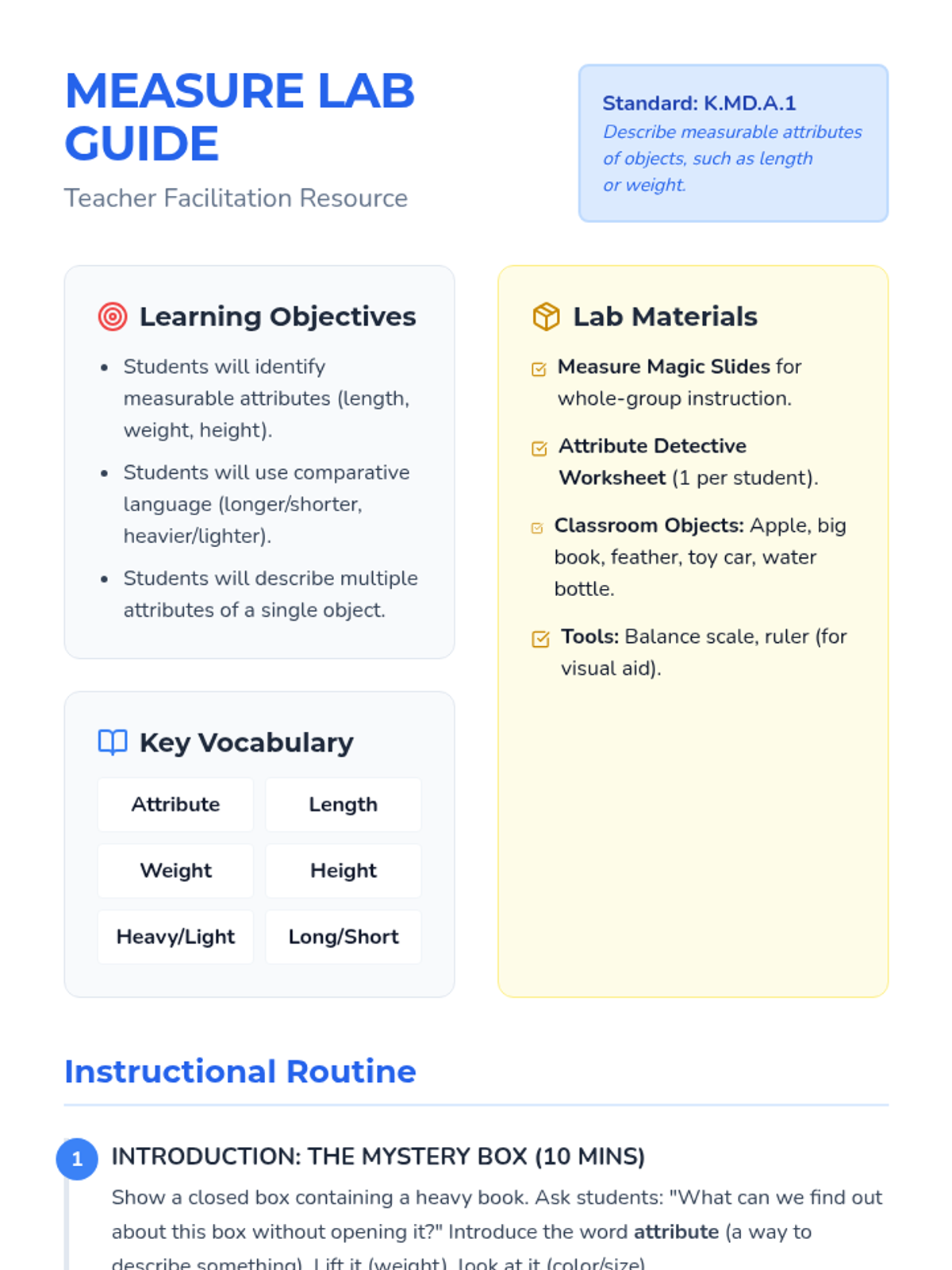 A Tier 2 intervention lesson for Kindergarten students focusing on describing and comparing measurable attributes like length and weight through hands-on exploration.