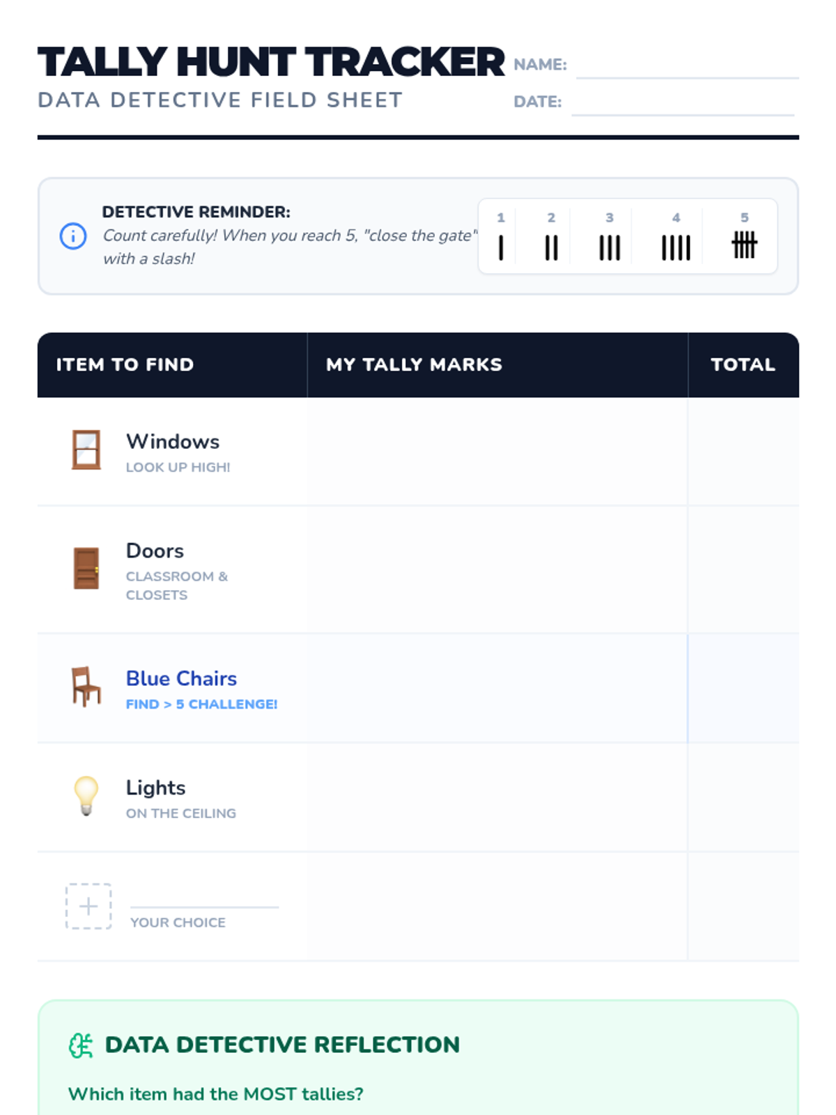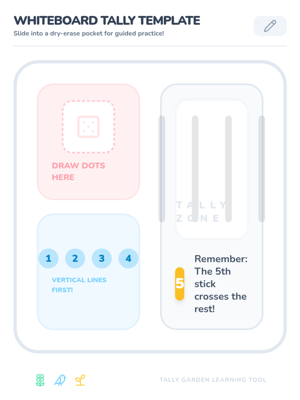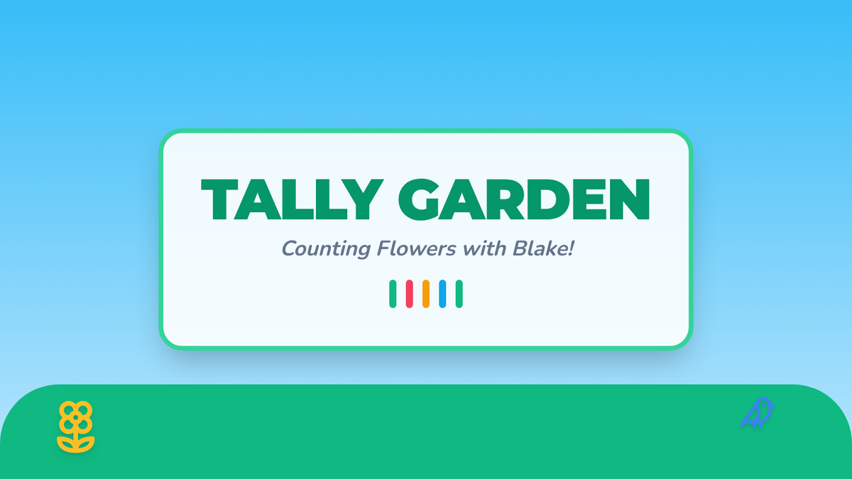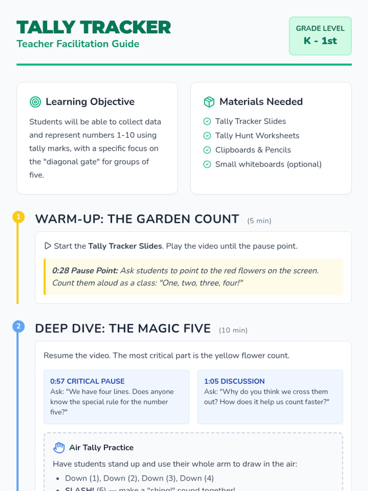 A Kindergarten to 1st Grade lesson introducing tally marks through a flower-themed video and a hands-on classroom scavenger hunt. Students learn the "diagonal gate" rule for groups of five and practice collecting real-world data.