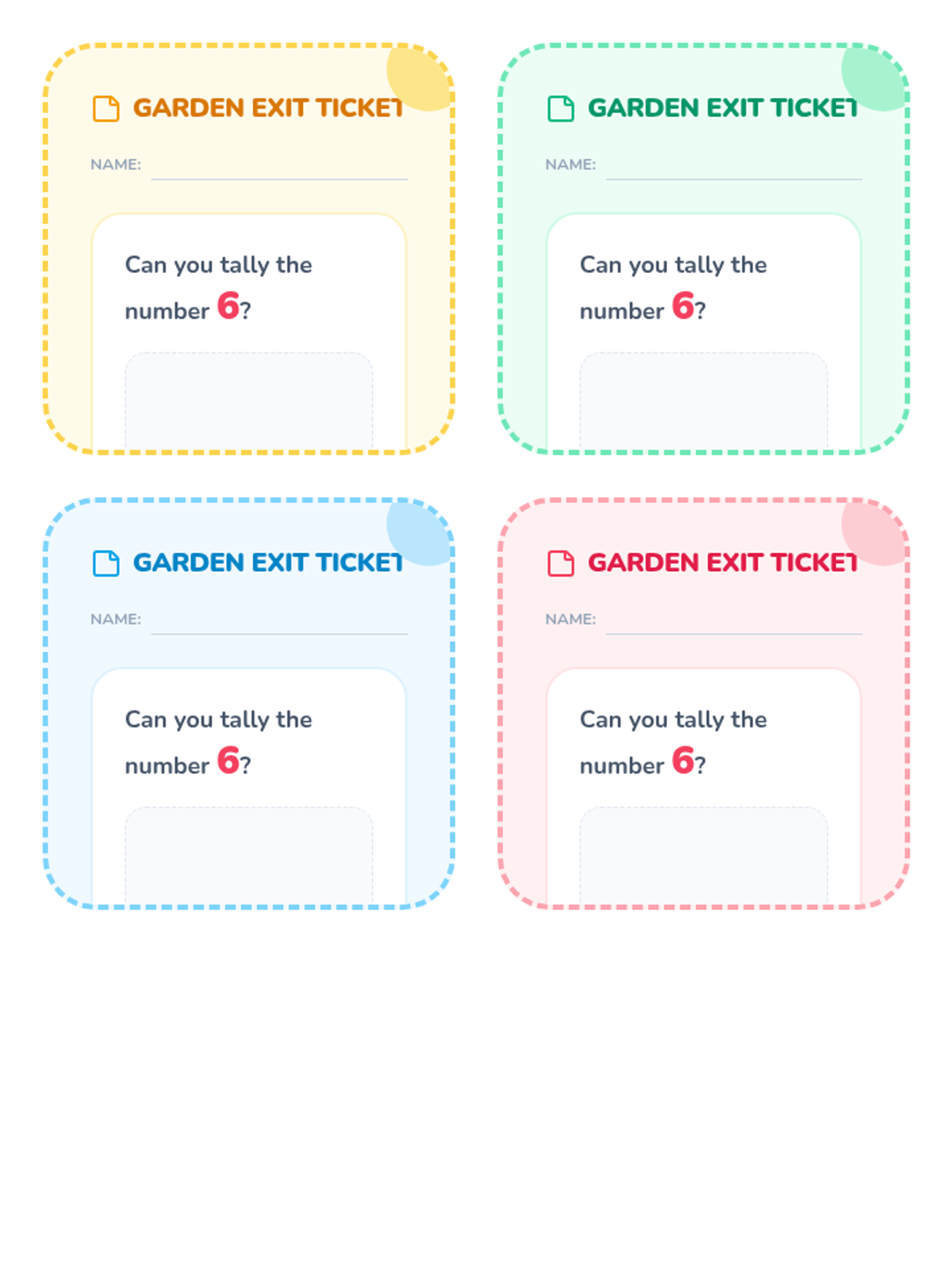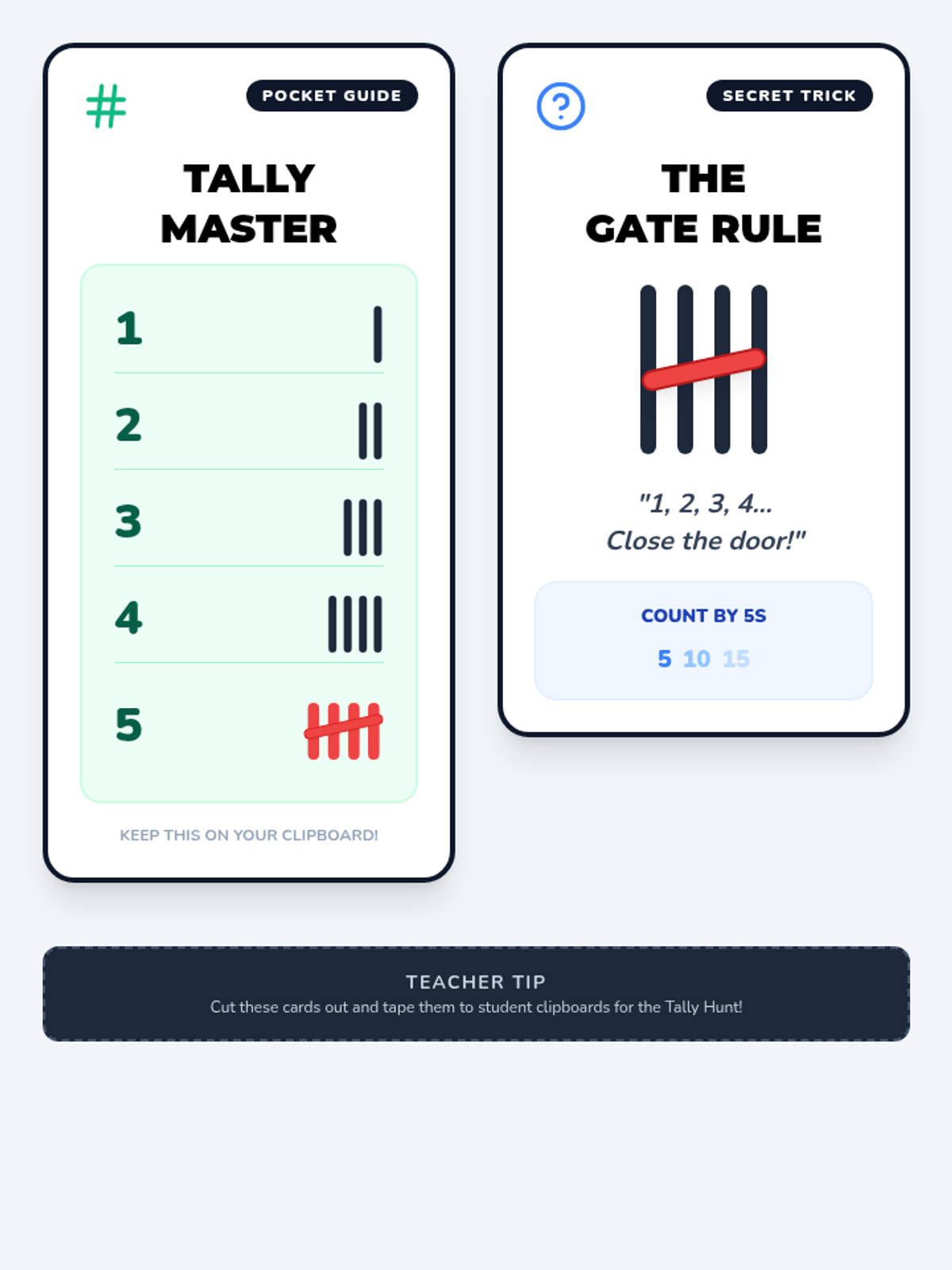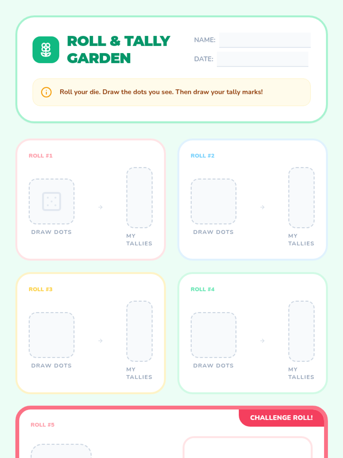 A Kindergarten to 1st Grade lesson introducing tally marks through a flower-themed video and a hands-on classroom scavenger hunt. Students learn the "diagonal gate" rule for groups of five and practice collecting real-world data.