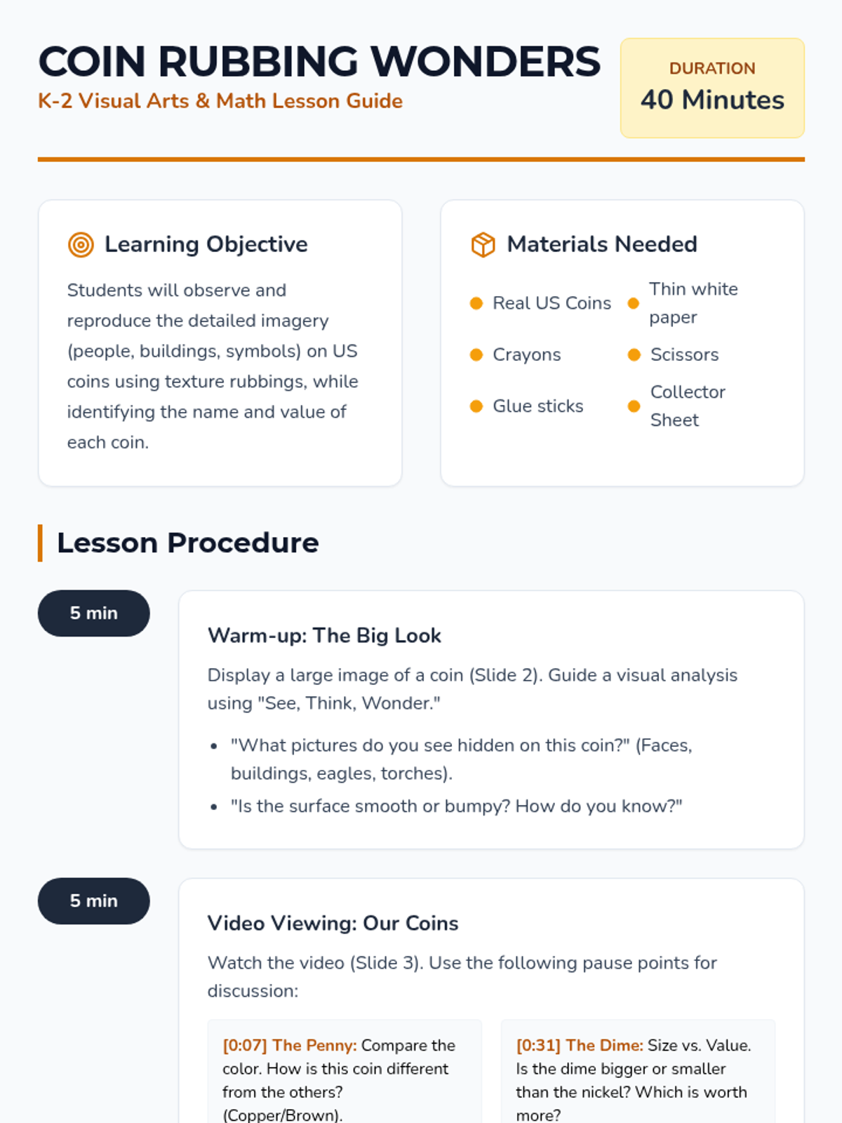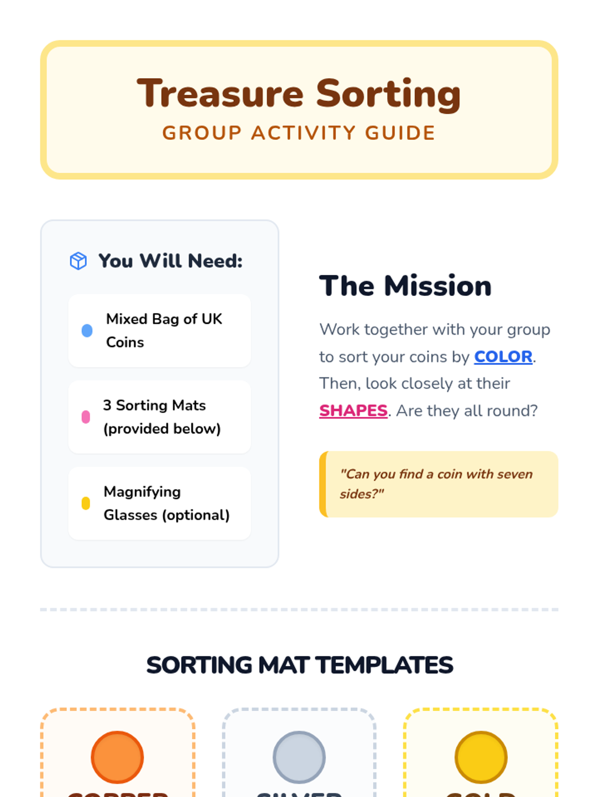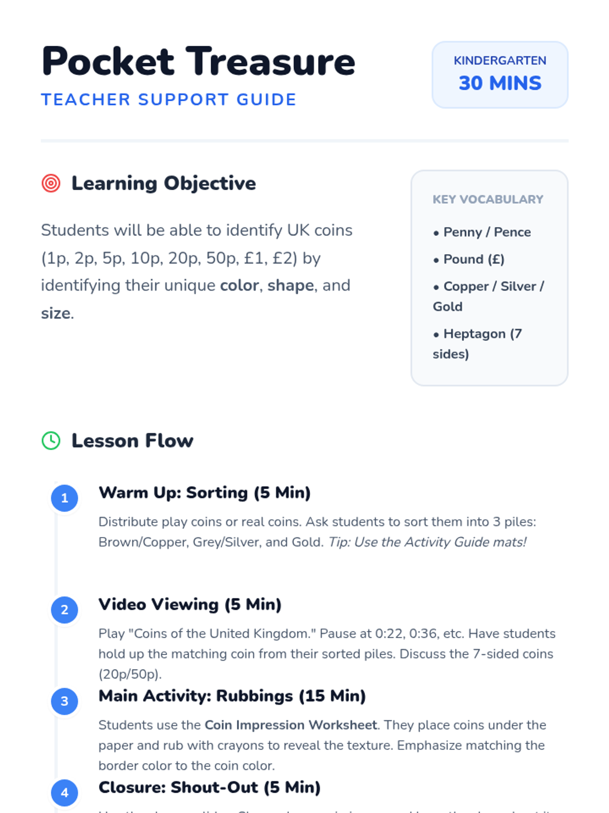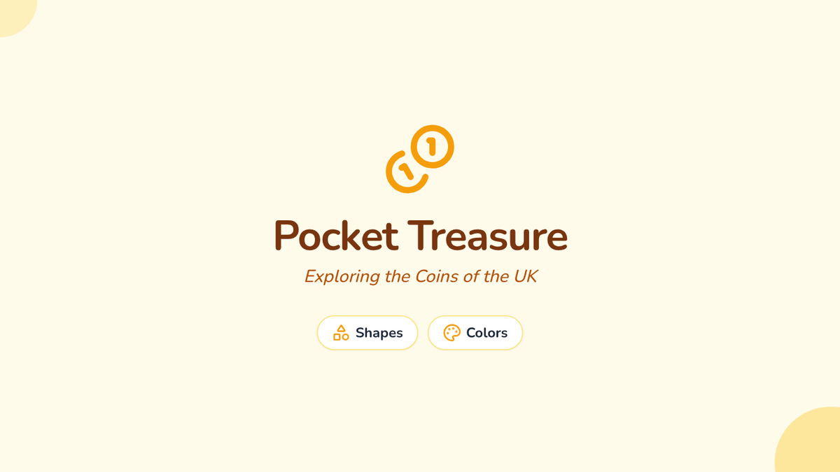 A hands-on introduction to UK currency for Kindergarten students, focusing on identifying coins by their physical characteristics like color and shape. Students sort real coins, watch an interactive video, and create 'coin rubbings' to explore textures and designs.