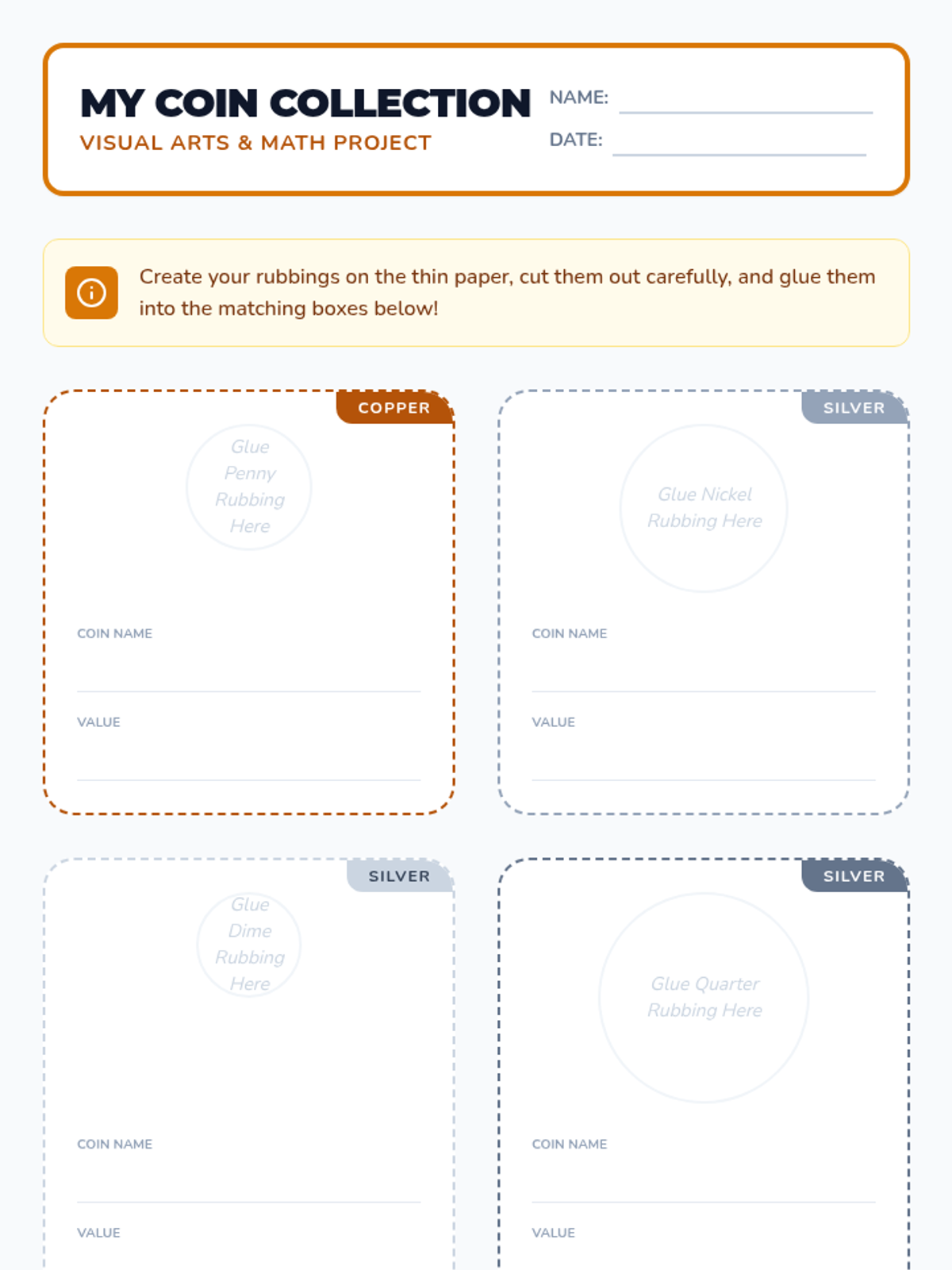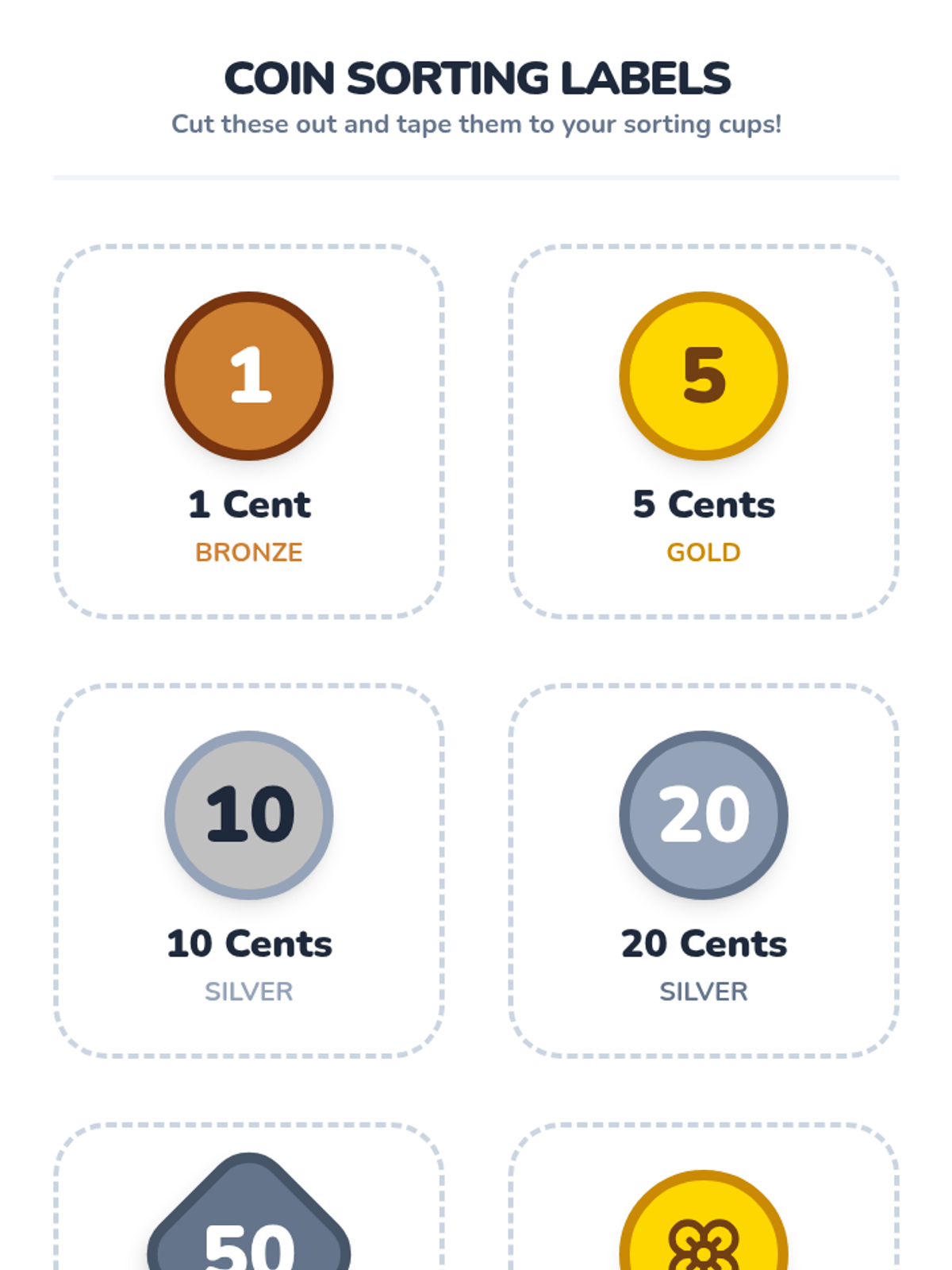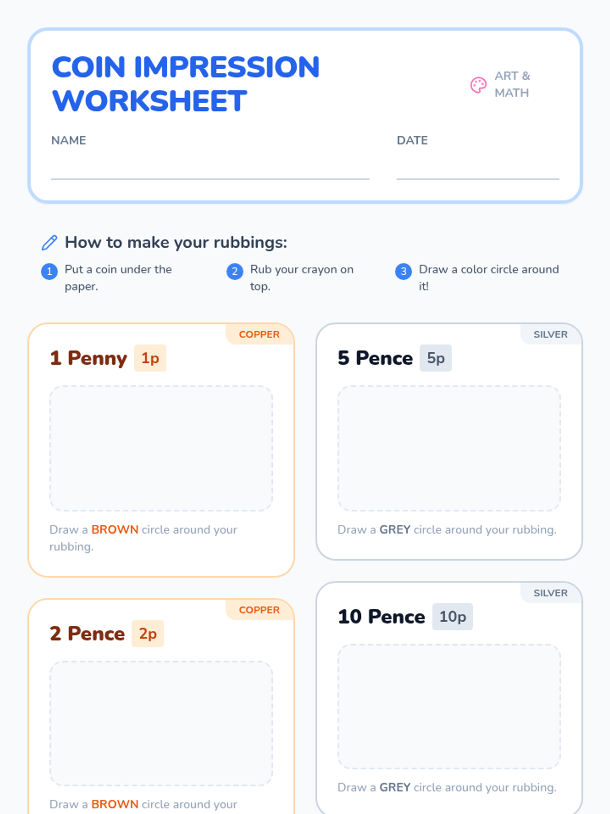 A hands-on introduction to UK currency for Kindergarten students, focusing on identifying coins by their physical characteristics like color and shape. Students sort real coins, watch an interactive video, and create 'coin rubbings' to explore textures and designs.