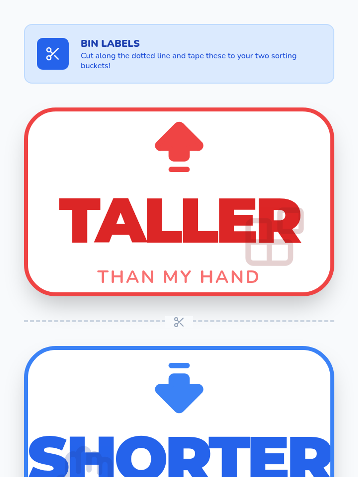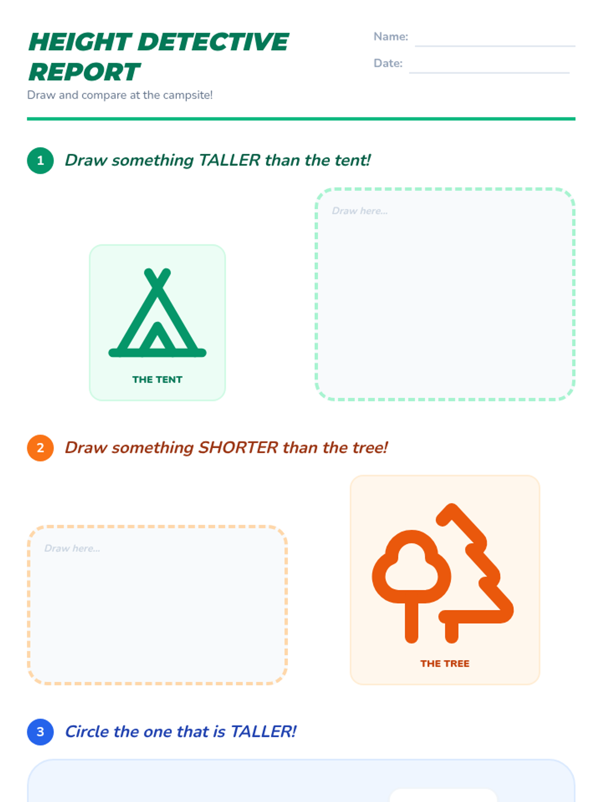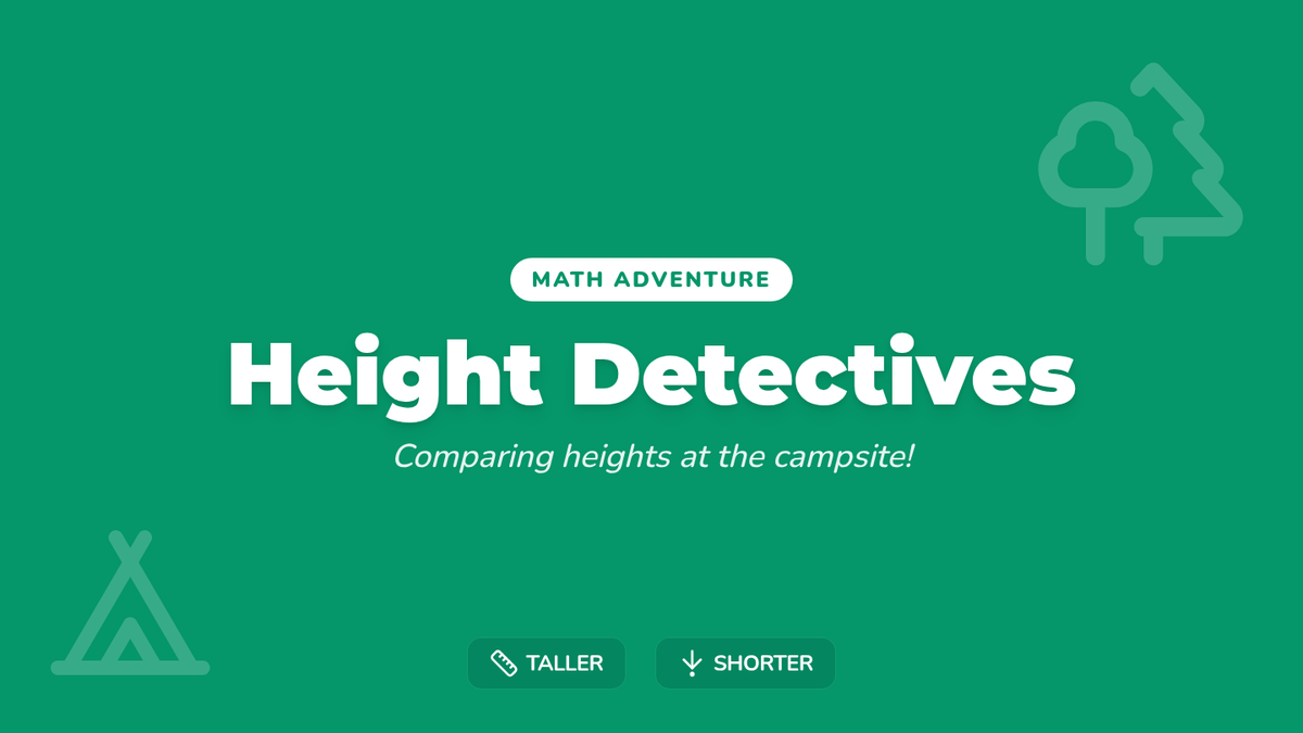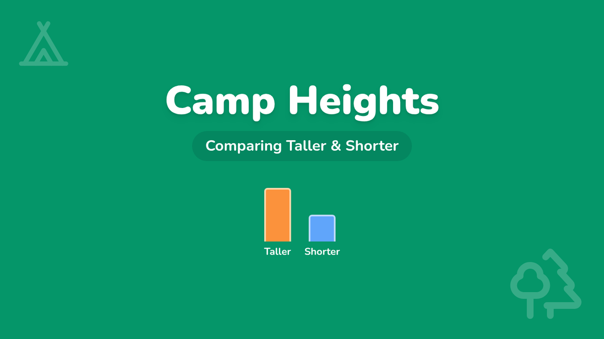 A Kindergarten math lesson where students learn to compare and sort objects by height using a reference object, set against a fun campsite theme.