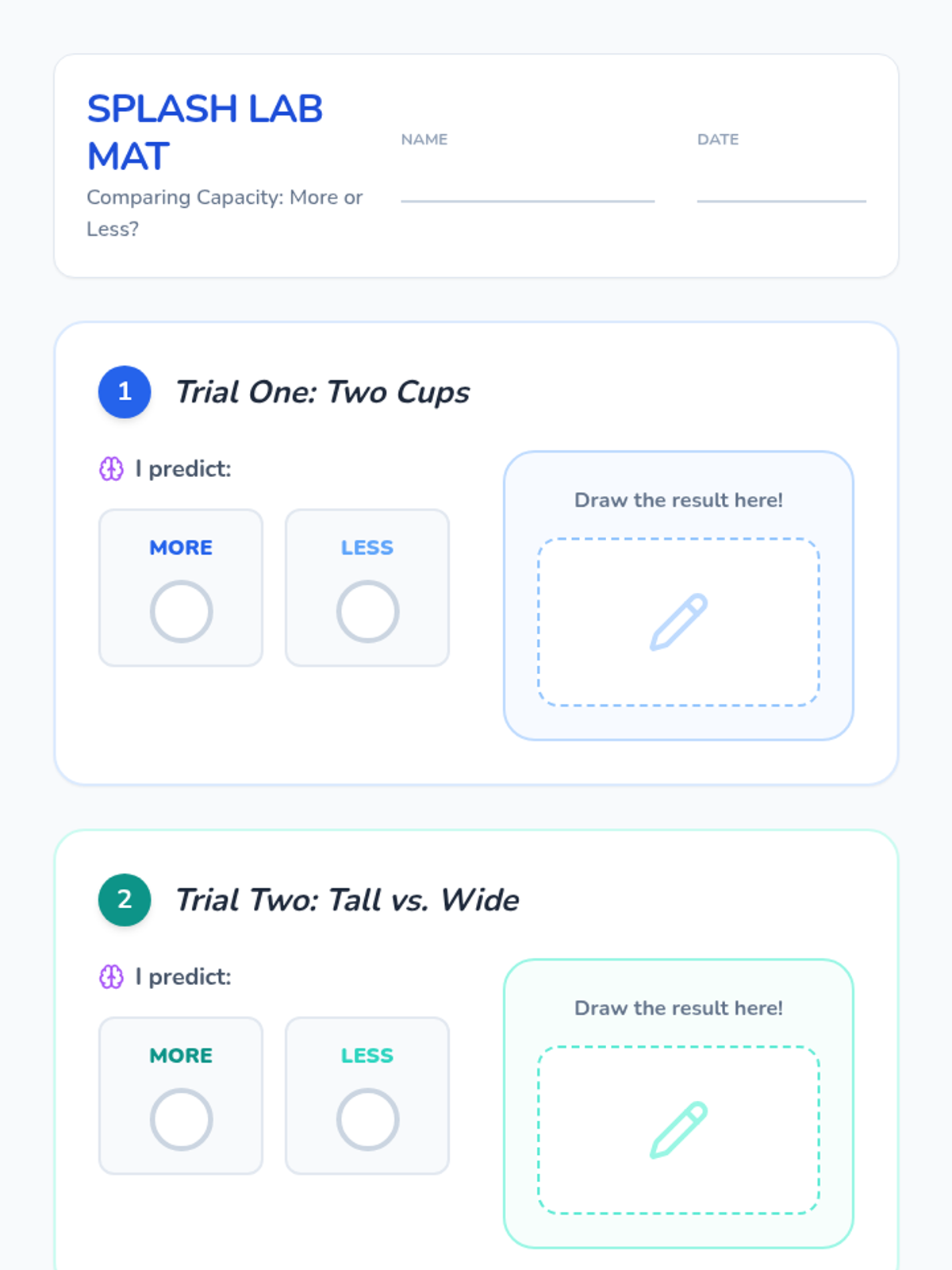A targeted Tier 2 intervention lesson focusing on comparing capacity through hands-on water play, prediction, and sentence frames. Students will explore which containers hold 'more' or 'less' through direct comparison.