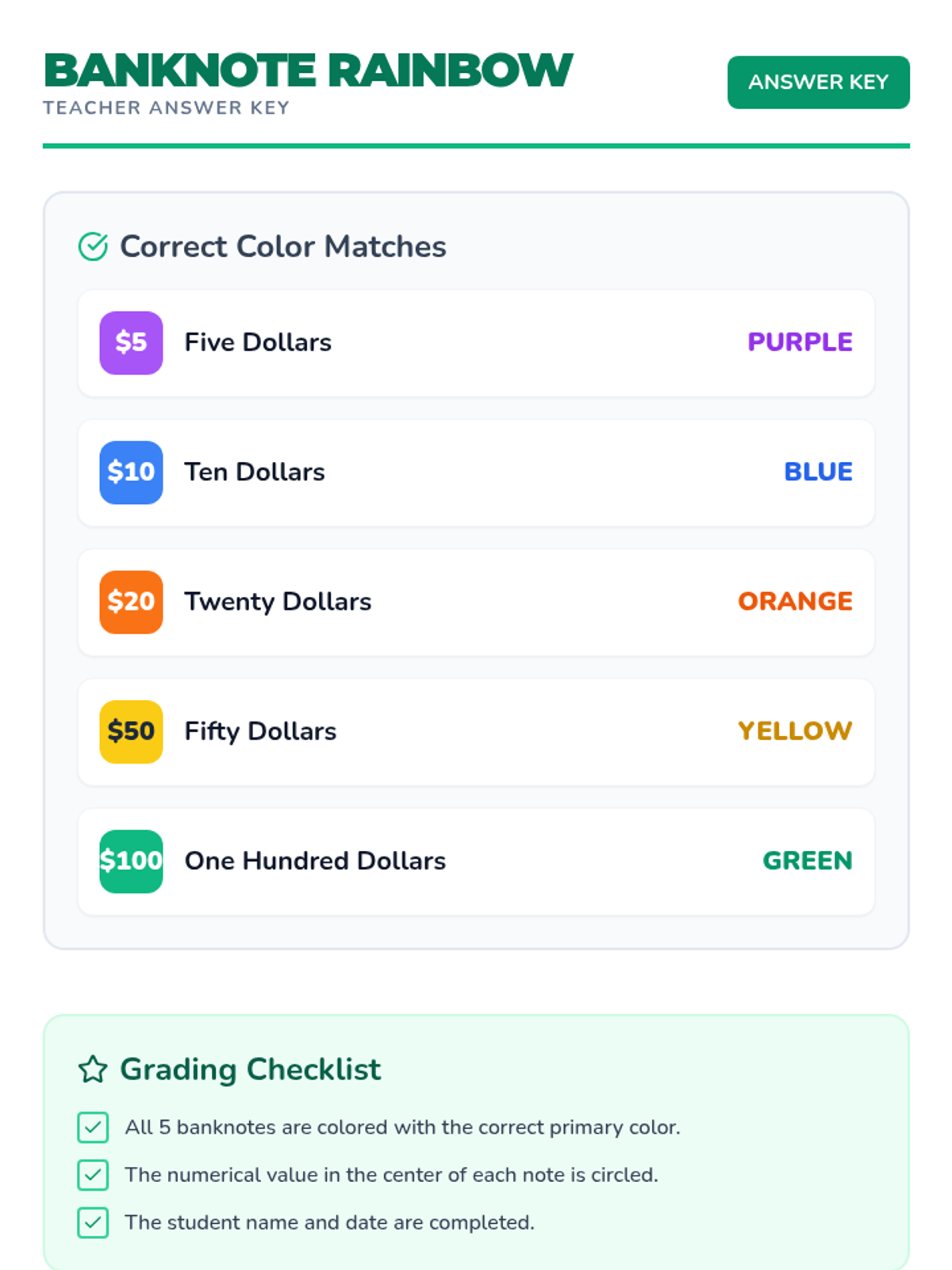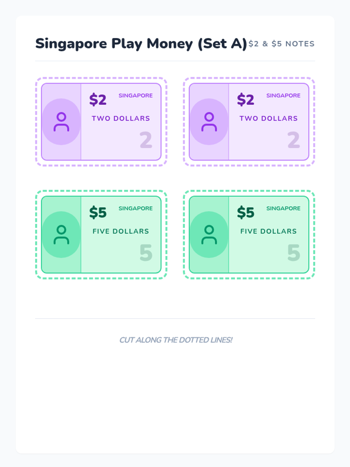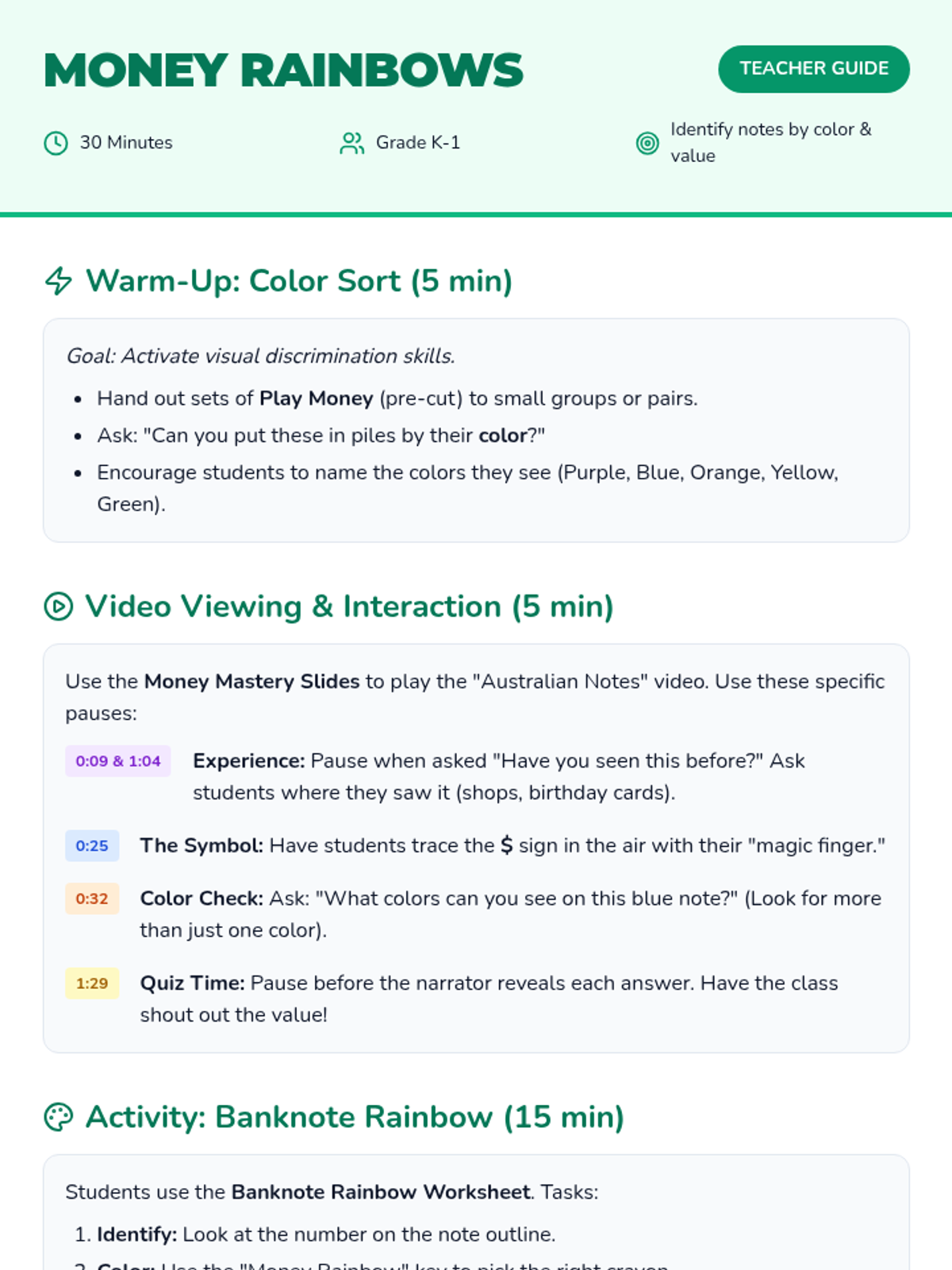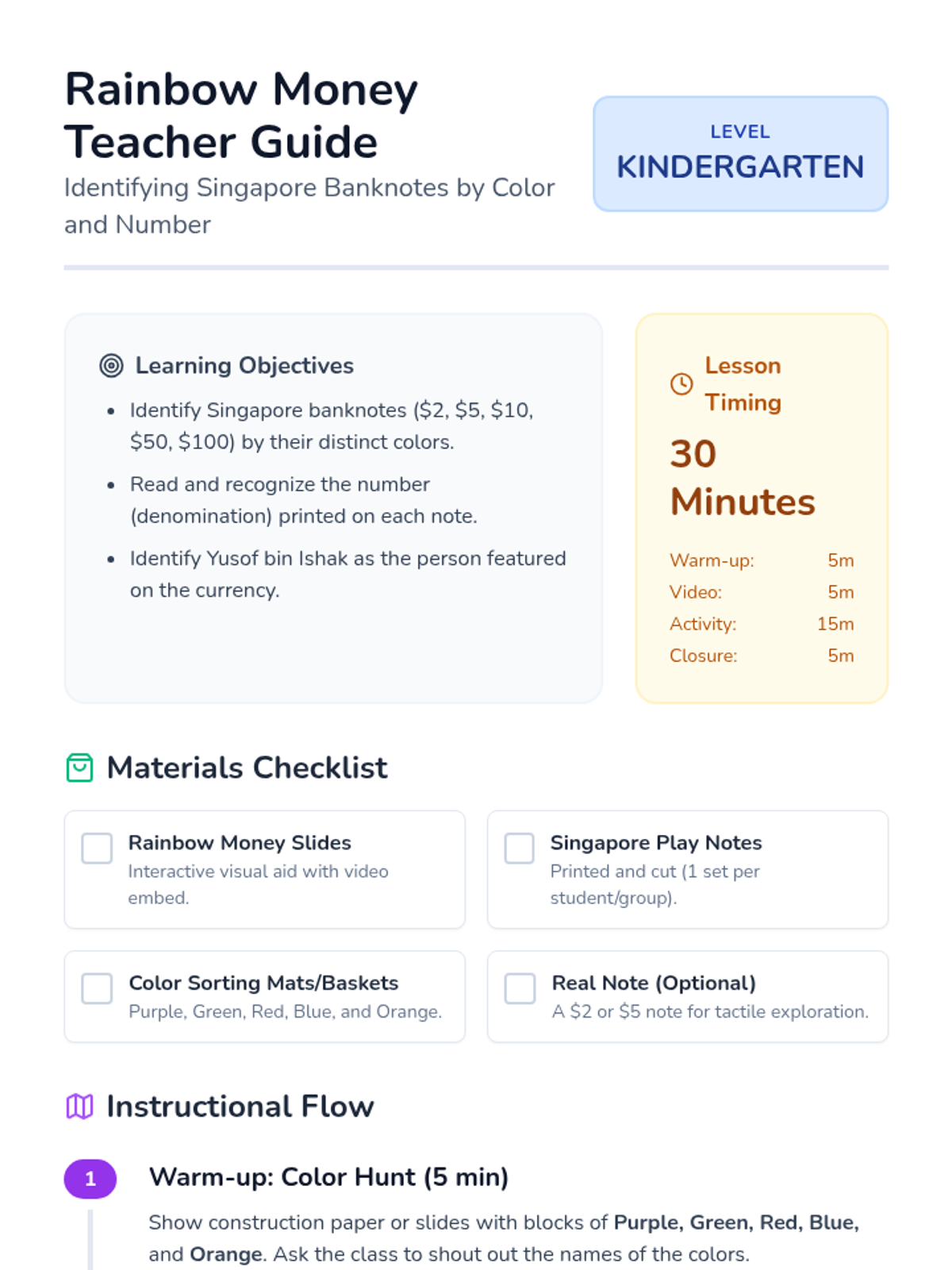 A vibrant lesson for Kindergarten students to identify Singapore banknotes by their distinctive colors and denominations through a video study and a hands-on sorting activity.