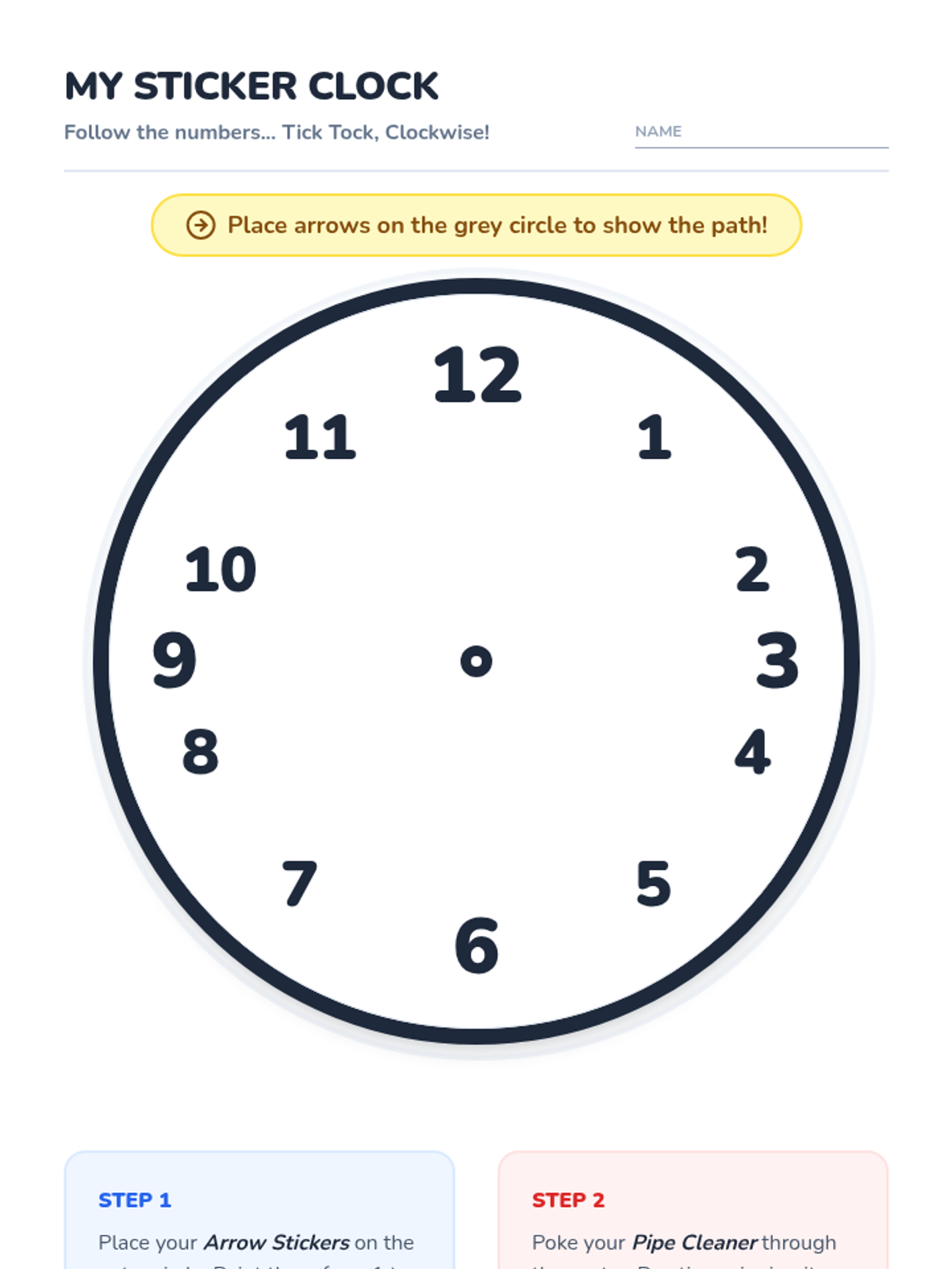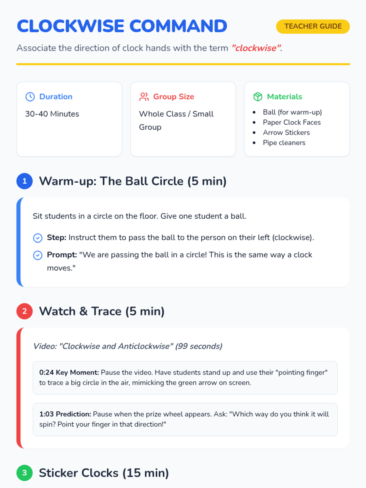 A foundational lesson for Pre-K and Kindergarten students to understand the concept of clockwise movement through video, physical play, and a hands-on clock-making activity.