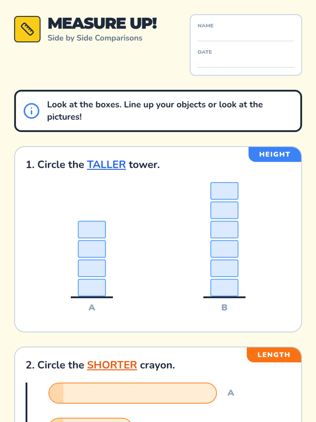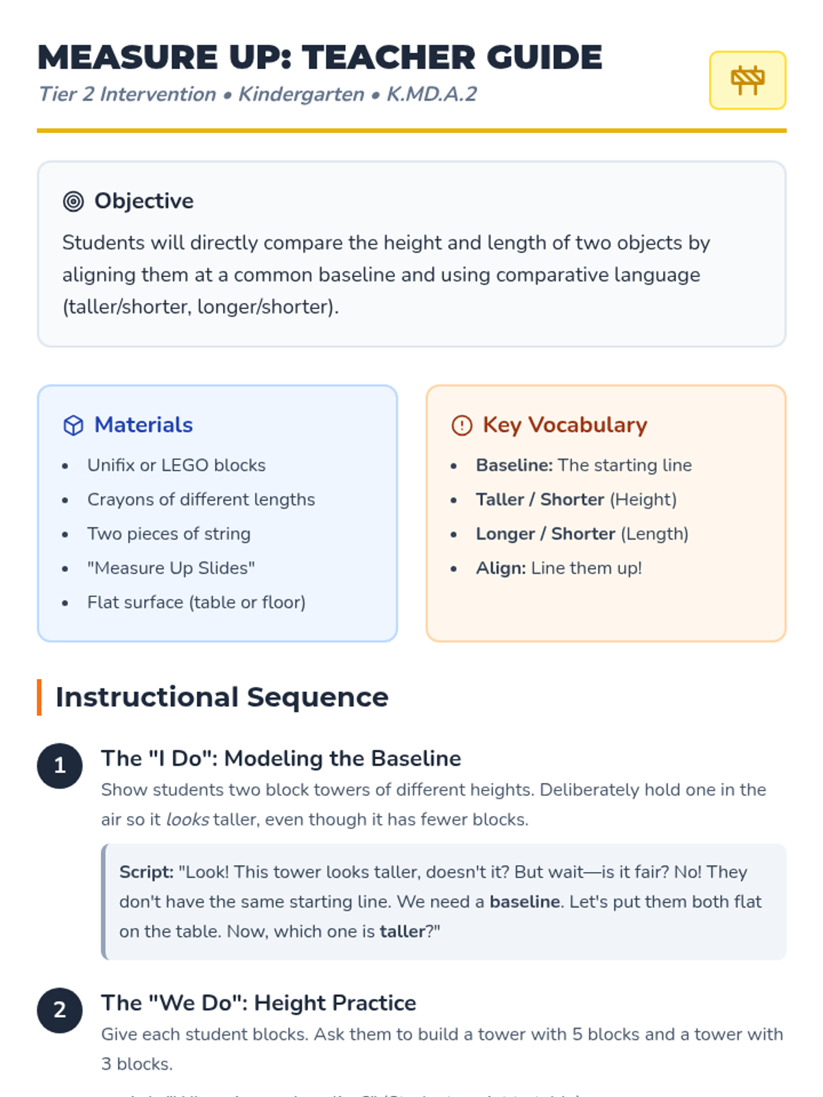 A targeted Tier 2 intervention lesson focusing on comparing height and length using a common baseline, designed for Kindergarten small groups. Students will learn to align objects and use comparative language like taller, shorter, longer, and same.