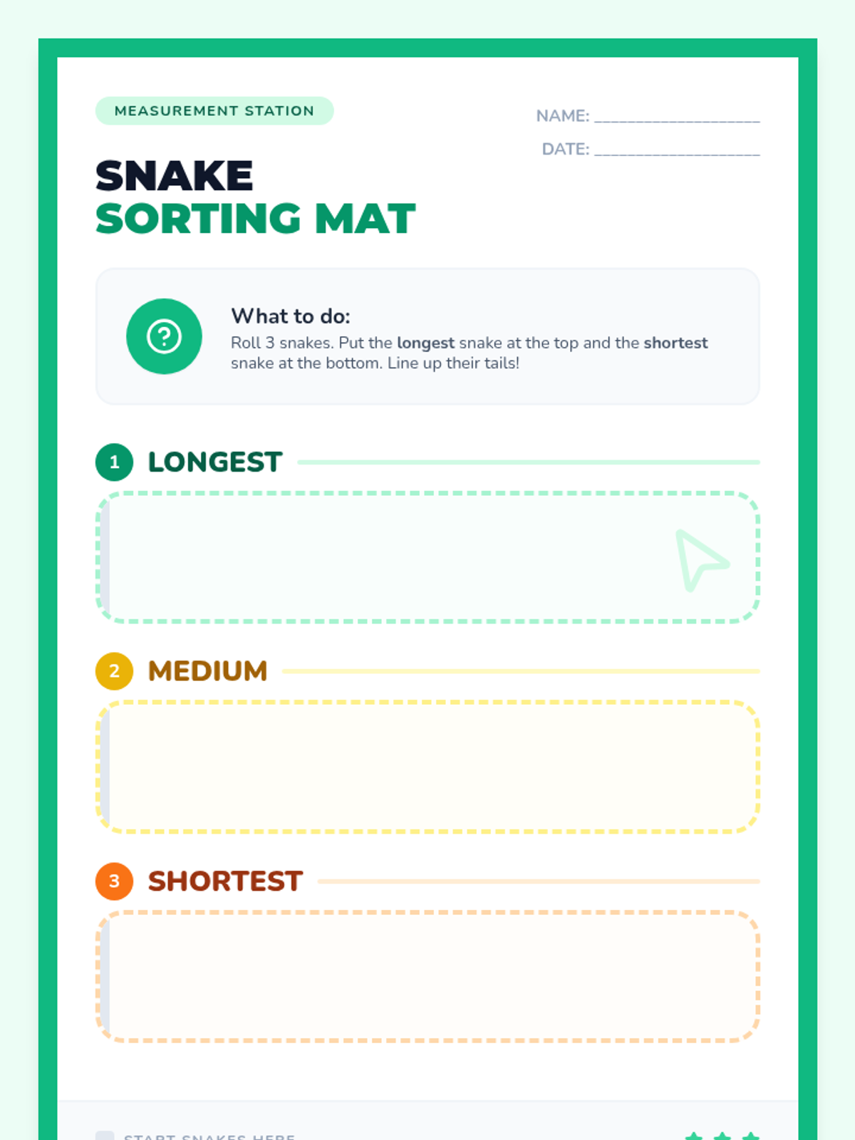 A hands-on measurement lesson for Pre-K and Kindergarten students using playdough to explore the concepts of 'longer' and 'shorter'. Students watch a zoo-themed video, compare snake lengths, and create their own playdough snakes on aligned mats.