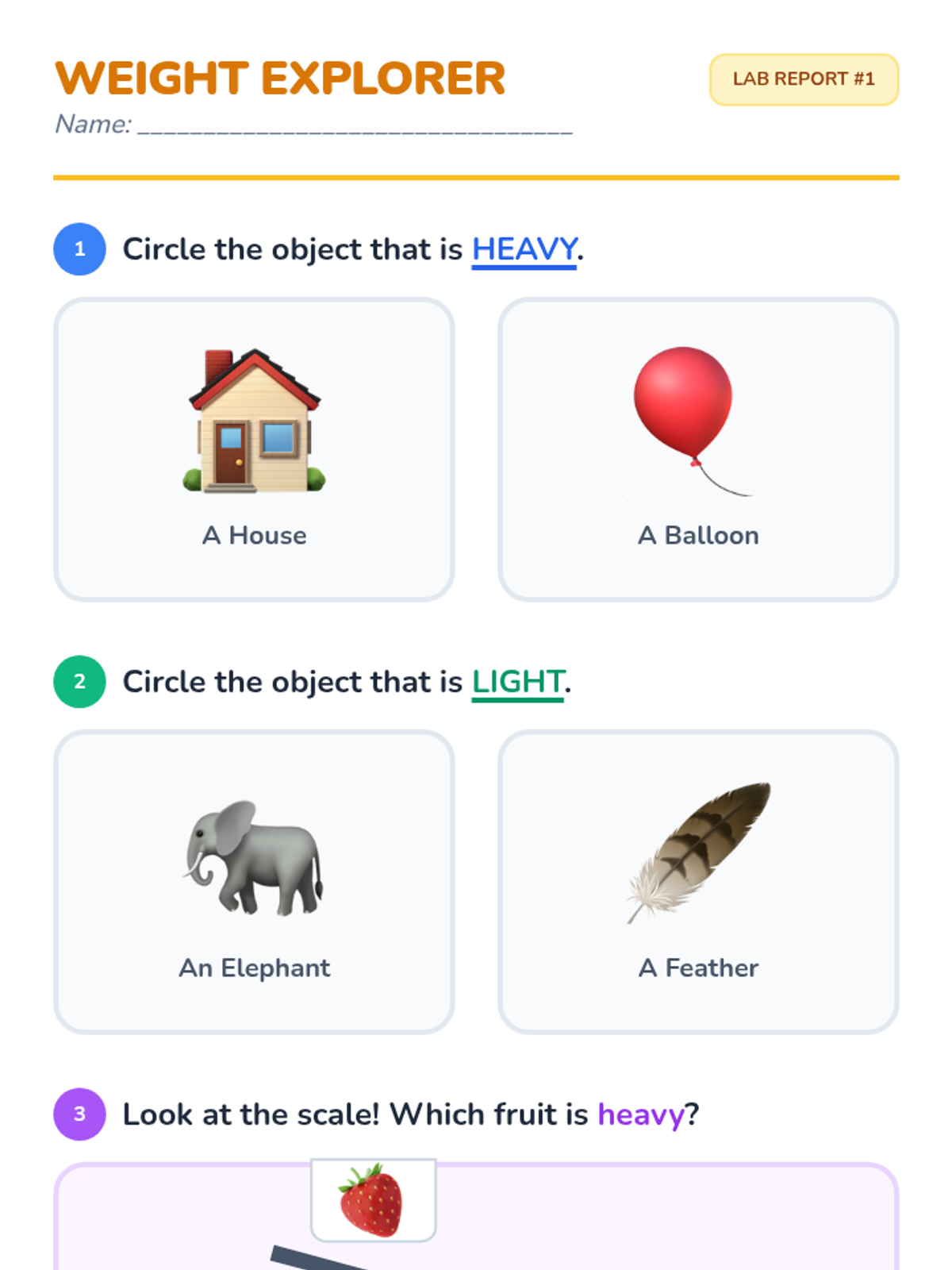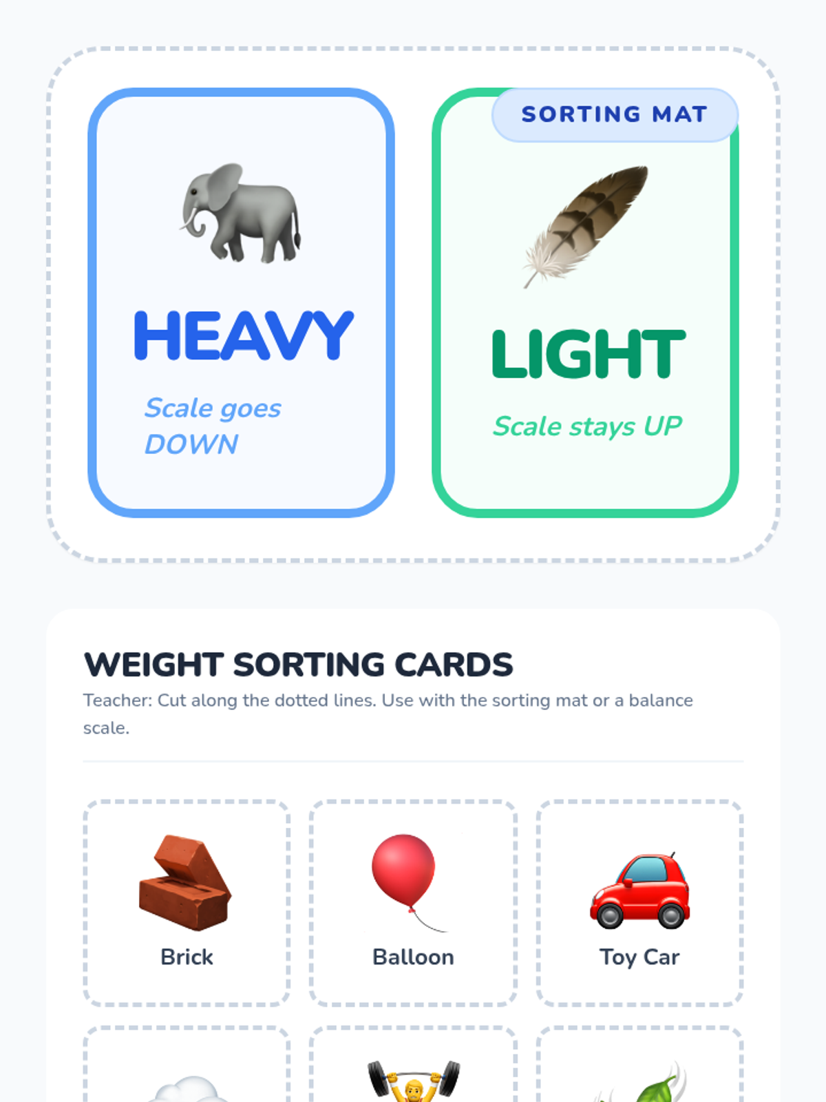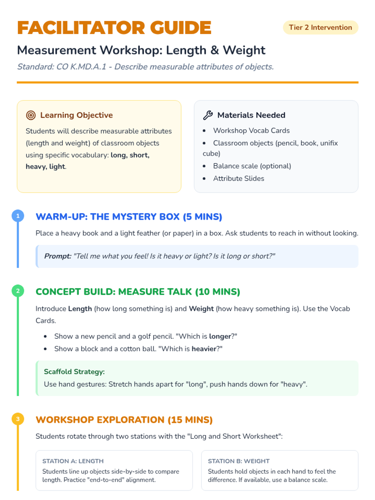 A Tier 2 small group intervention lesson focused on understanding and describing weight using balance scales. Students explore the concepts of 'heavy' and 'light' through concrete hands-on activities, visual aids, and scaffolded practice.