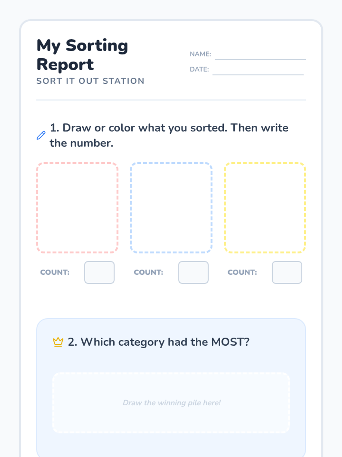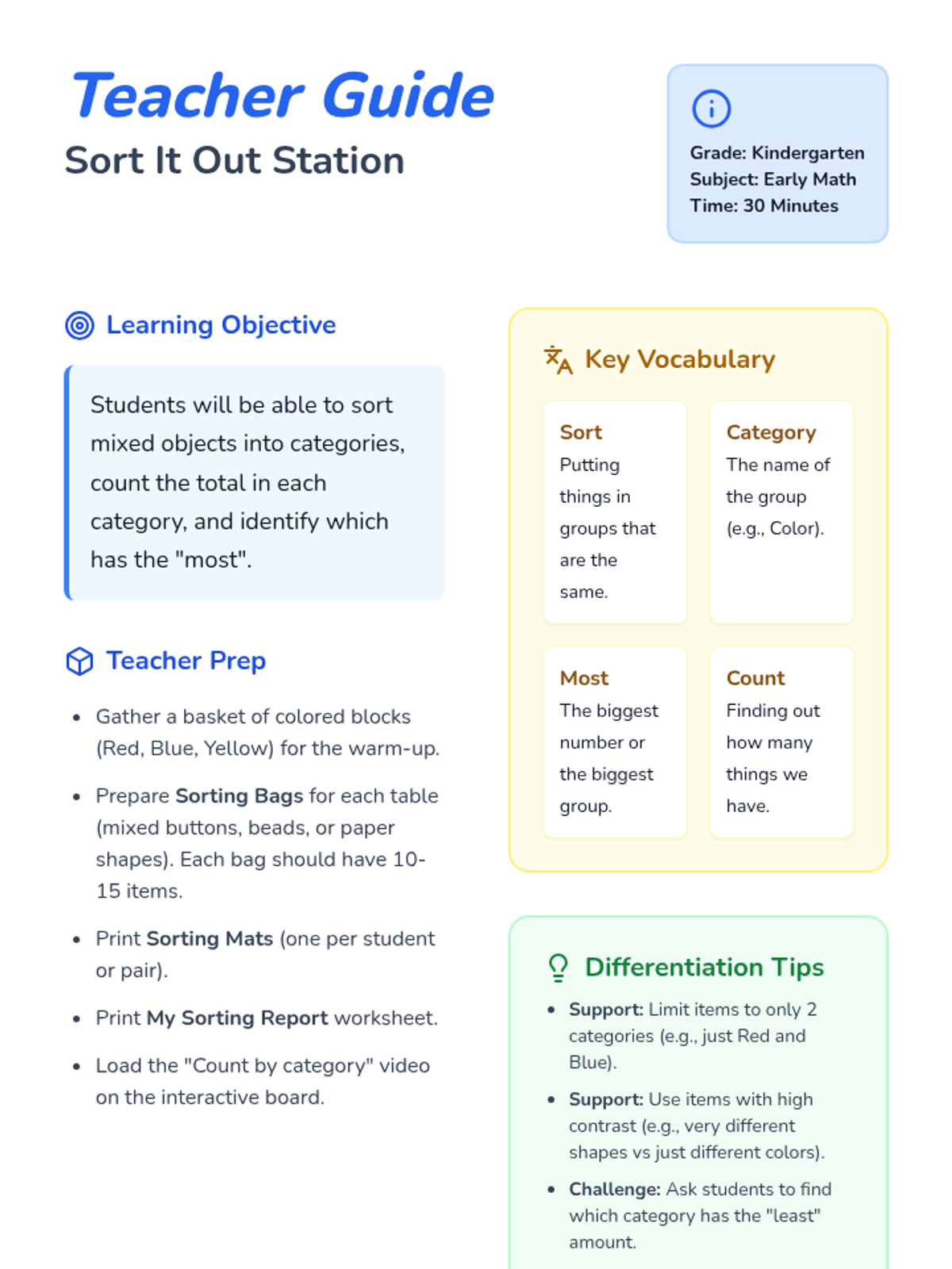 A Kindergarten lesson focused on sorting objects into categories, counting totals, and identifying which group has the 'most'. Includes interactive slides with a video, sorting mats, and a recording worksheet.