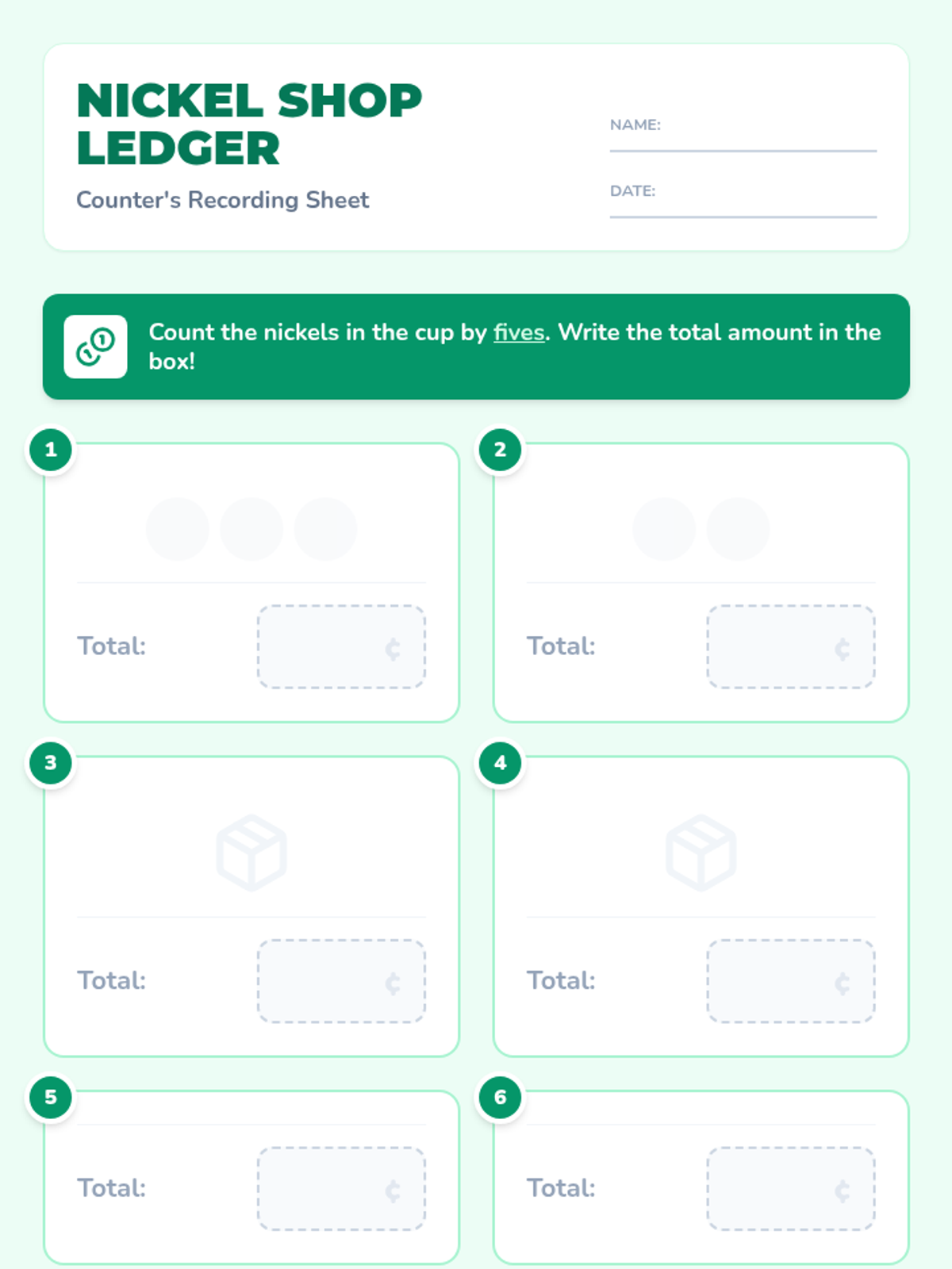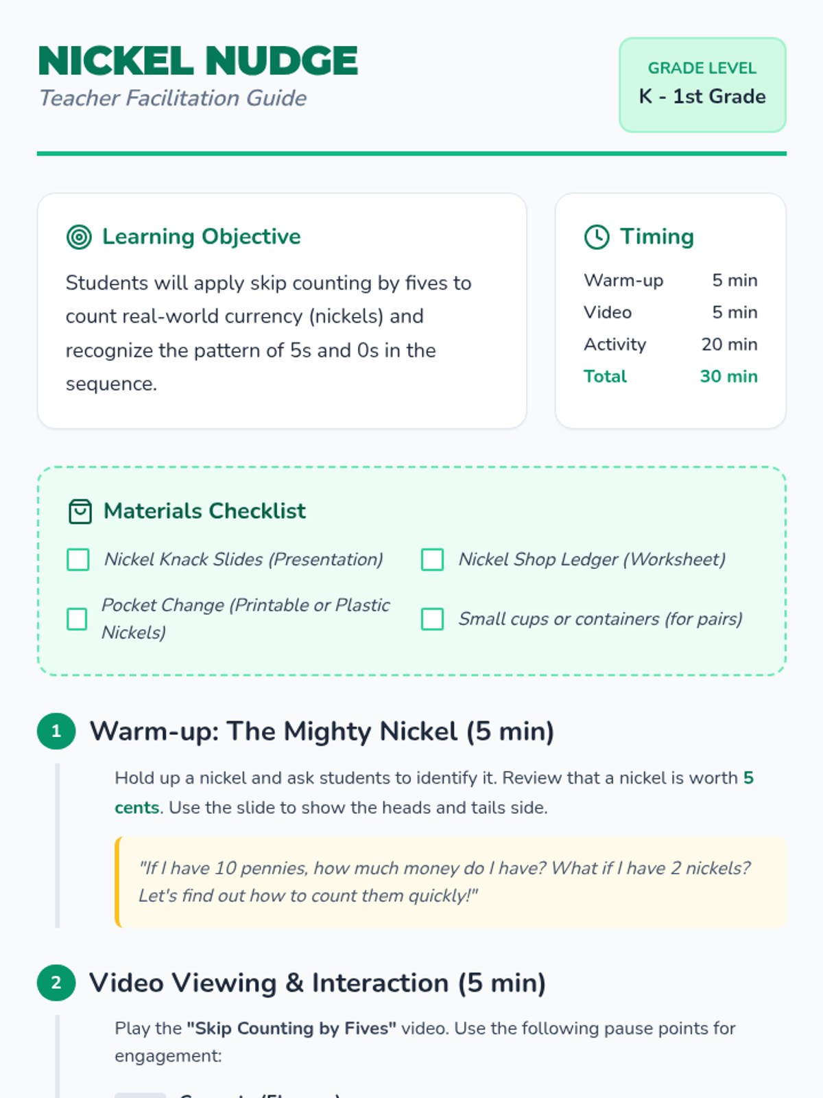 A Kindergarten and 1st Grade lesson that introduces skip counting by fives through the lens of counting nickels, utilizing concrete, pictorial, and abstract representations.