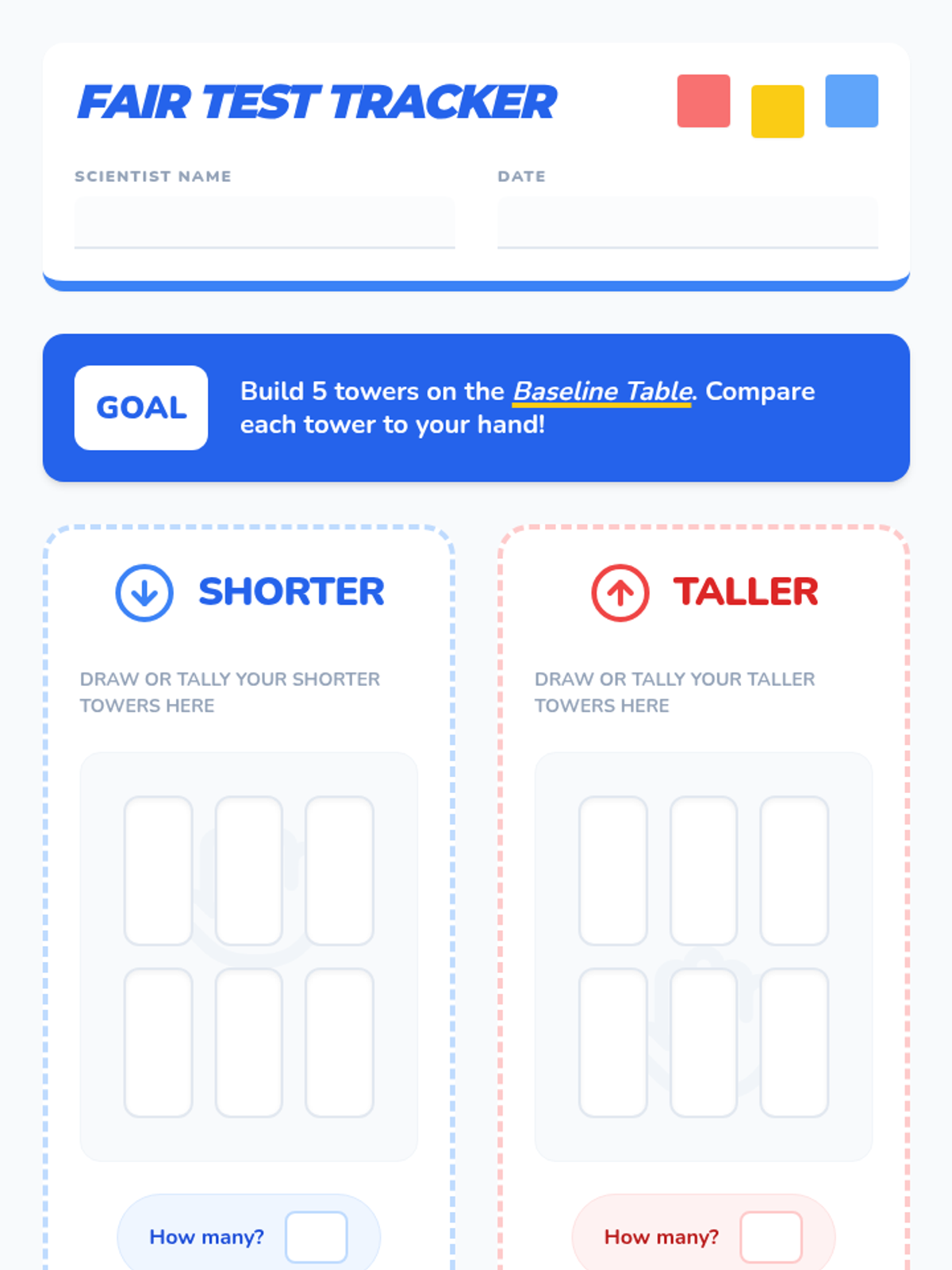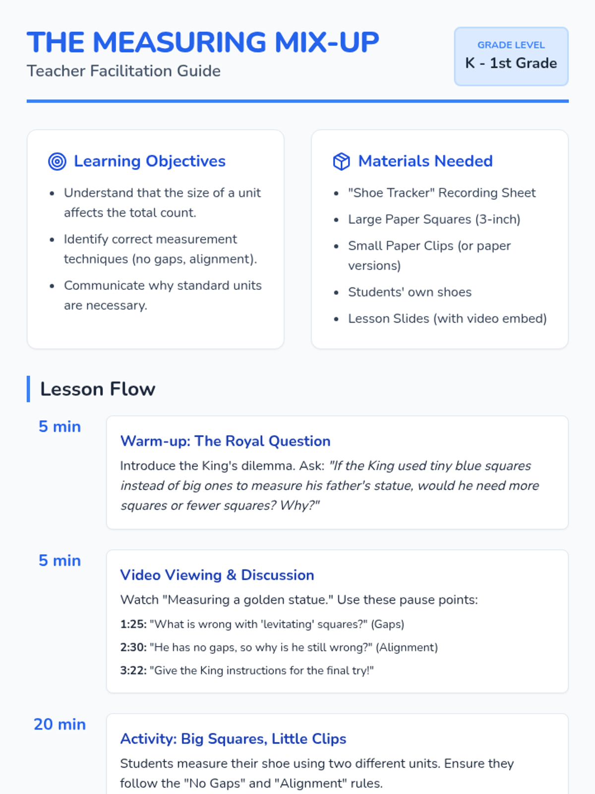 A hands-on measurement lesson for K-1 students focusing on the importance of a common baseline when comparing heights. Includes a warm-up, video analysis, and a 'Fair Test' block-building activity.