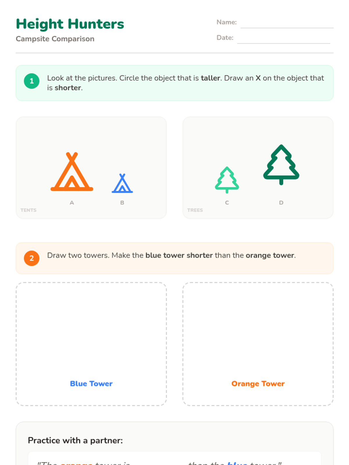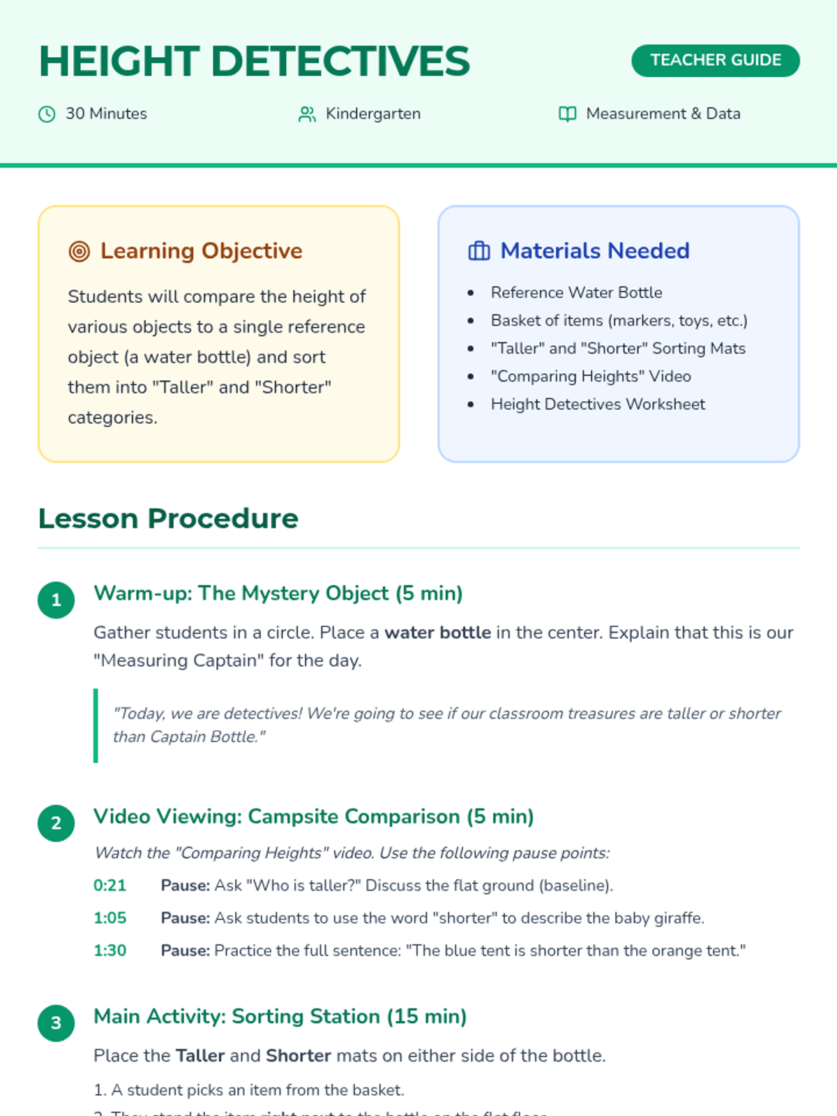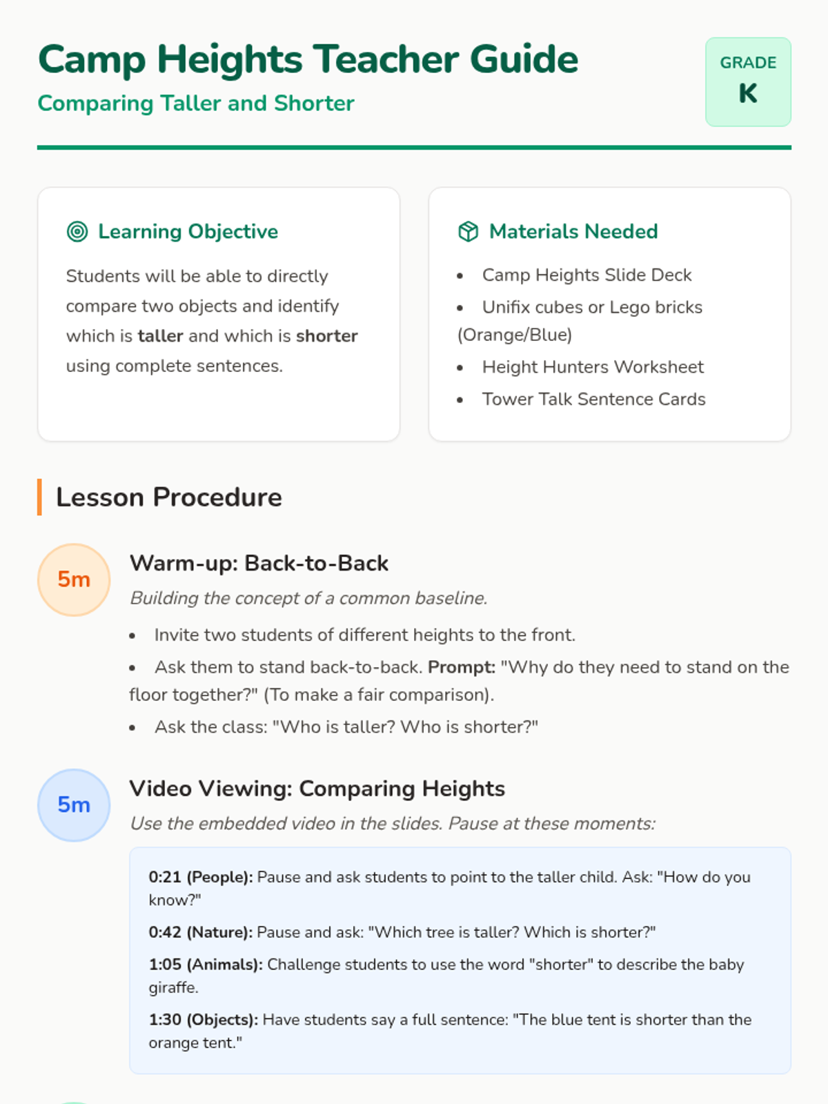 A Kindergarten math lesson where students compare the heights of objects using a campsite theme. Students use direct comparison and building blocks to master 'taller' and 'shorter' vocabulary.