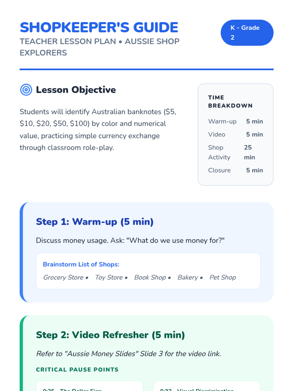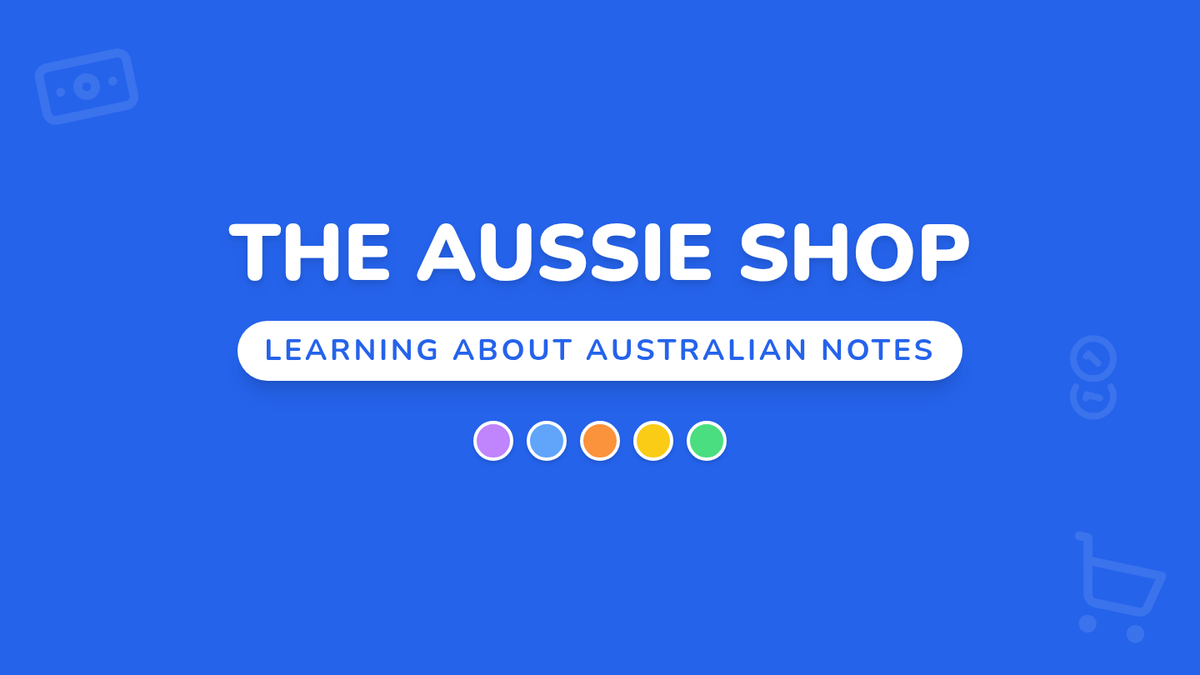 A hands-on introduction to Australian banknotes for K-2 students, featuring a role-play activity where students practice identifying and exchanging money in a classroom shop setting.