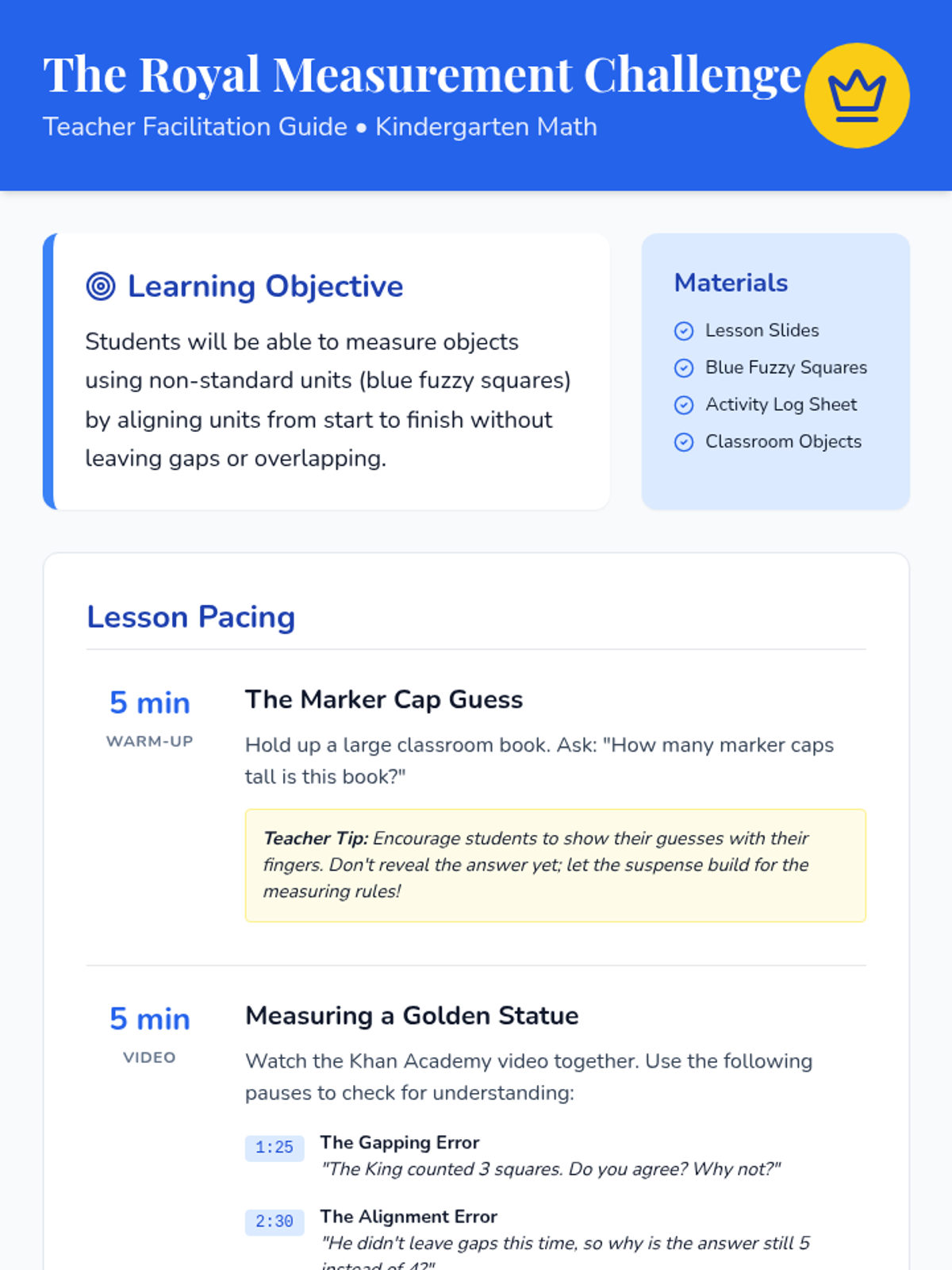 A Kindergarten math lesson focused on non-standard measurement. Students learn to measure objects using 'fuzzy squares' while avoiding gaps and overlaps, guided by a royal emergency at the palace.