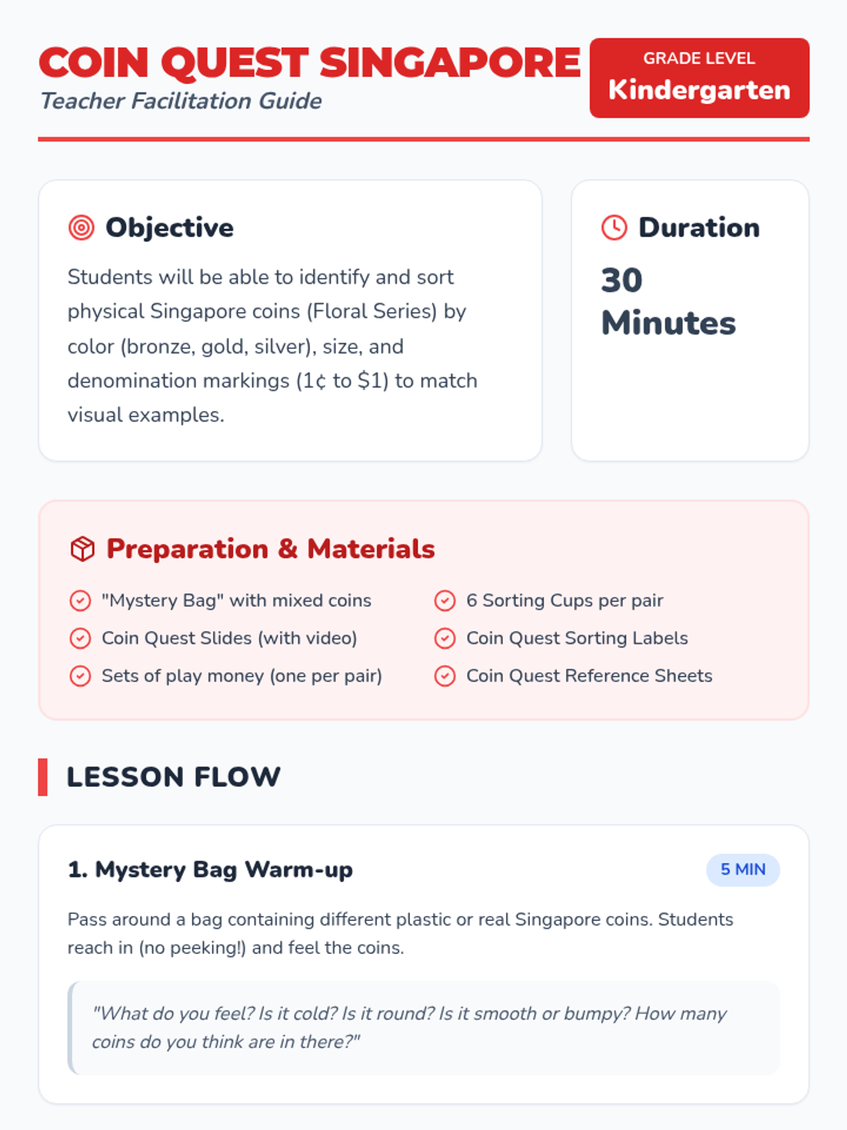 A Kindergarten lesson focused on identifying and sorting Singapore coins based on visual attributes like color, size, and markings, using the Floral Series coins as examples.