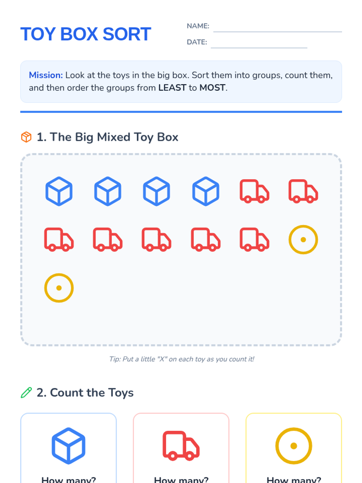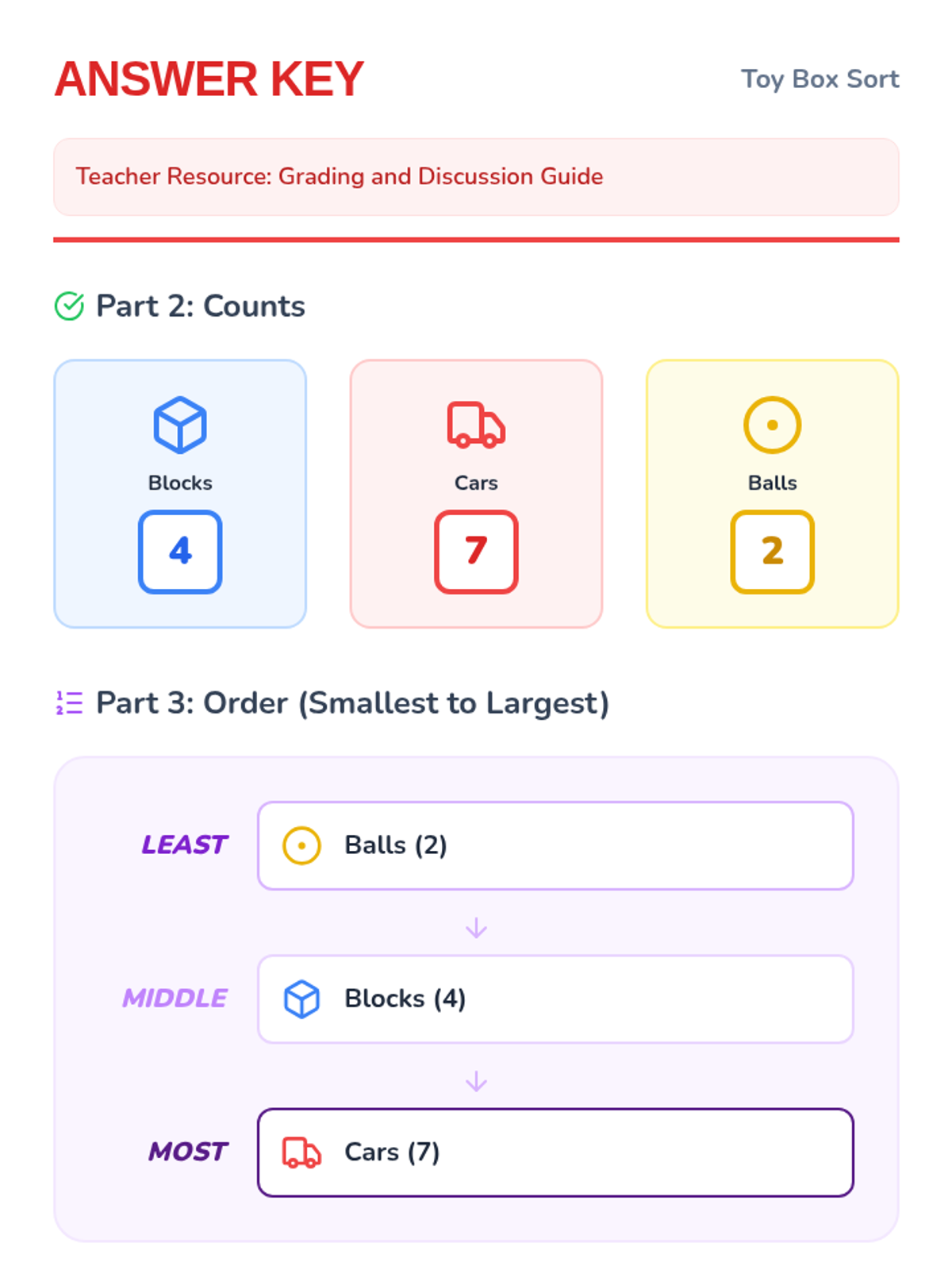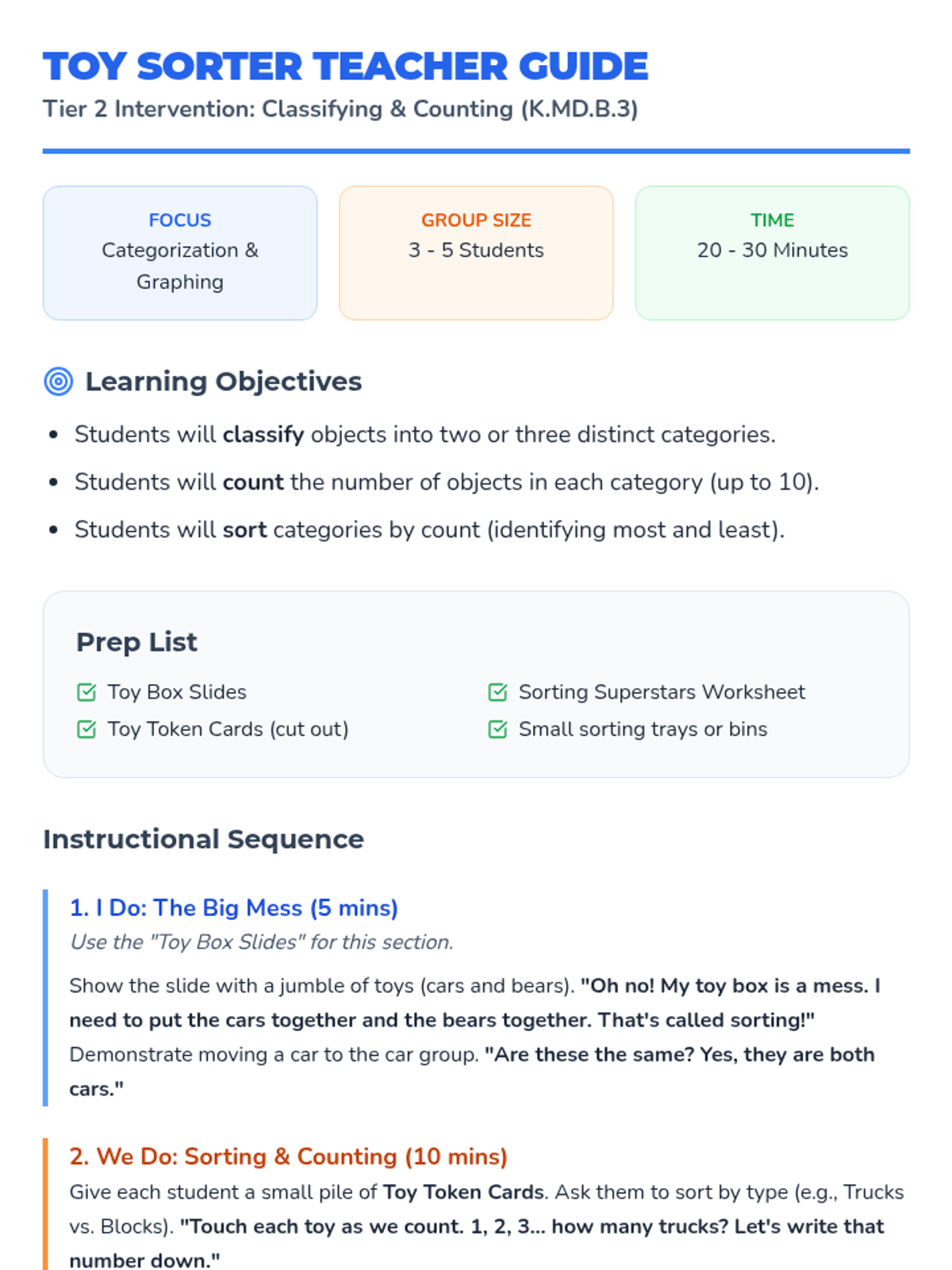 A targeted Tier 2 intervention lesson for Kindergarten students to master classifying objects, counting within categories, and sorting categories by count using a toy-themed approach.