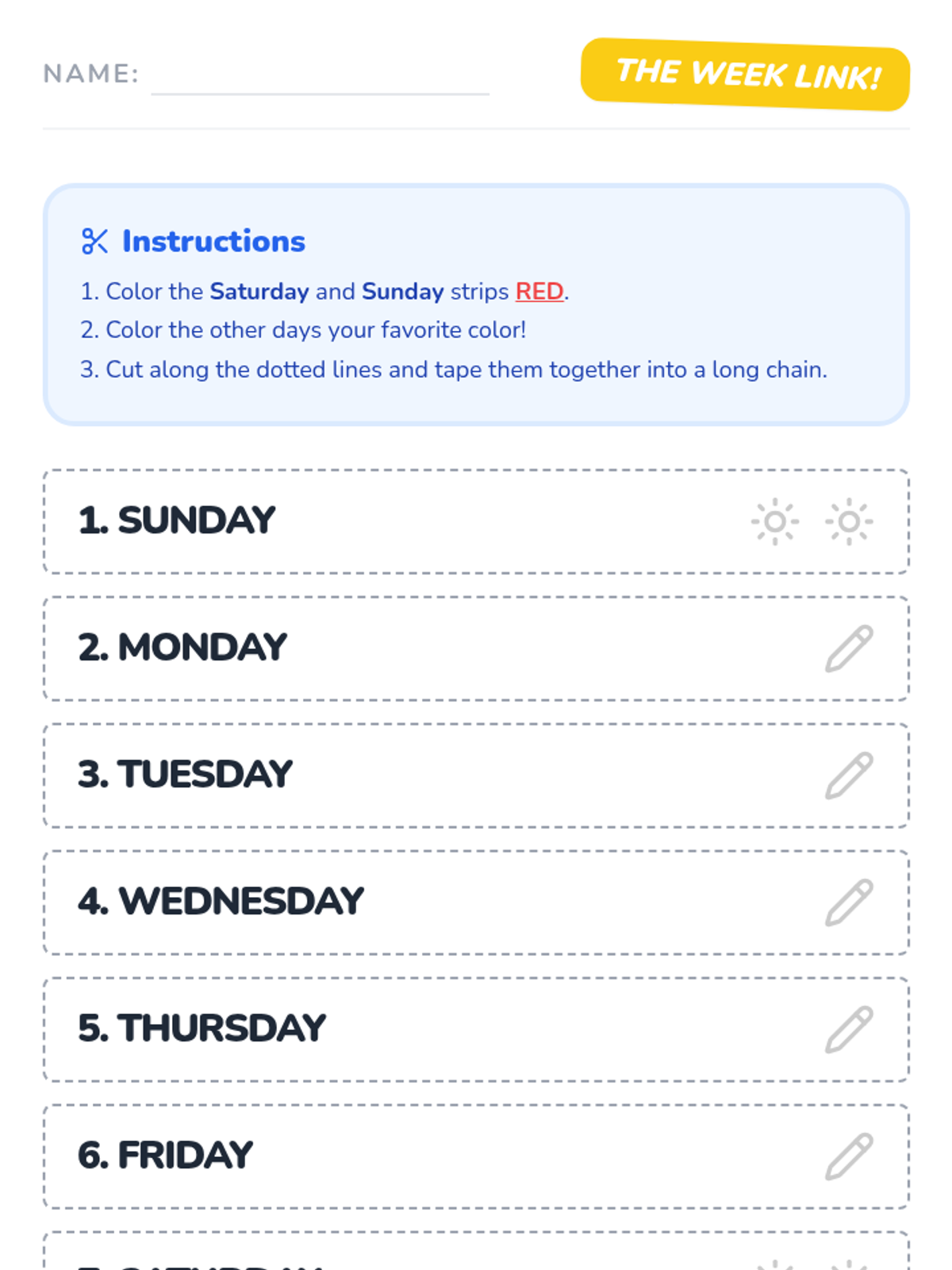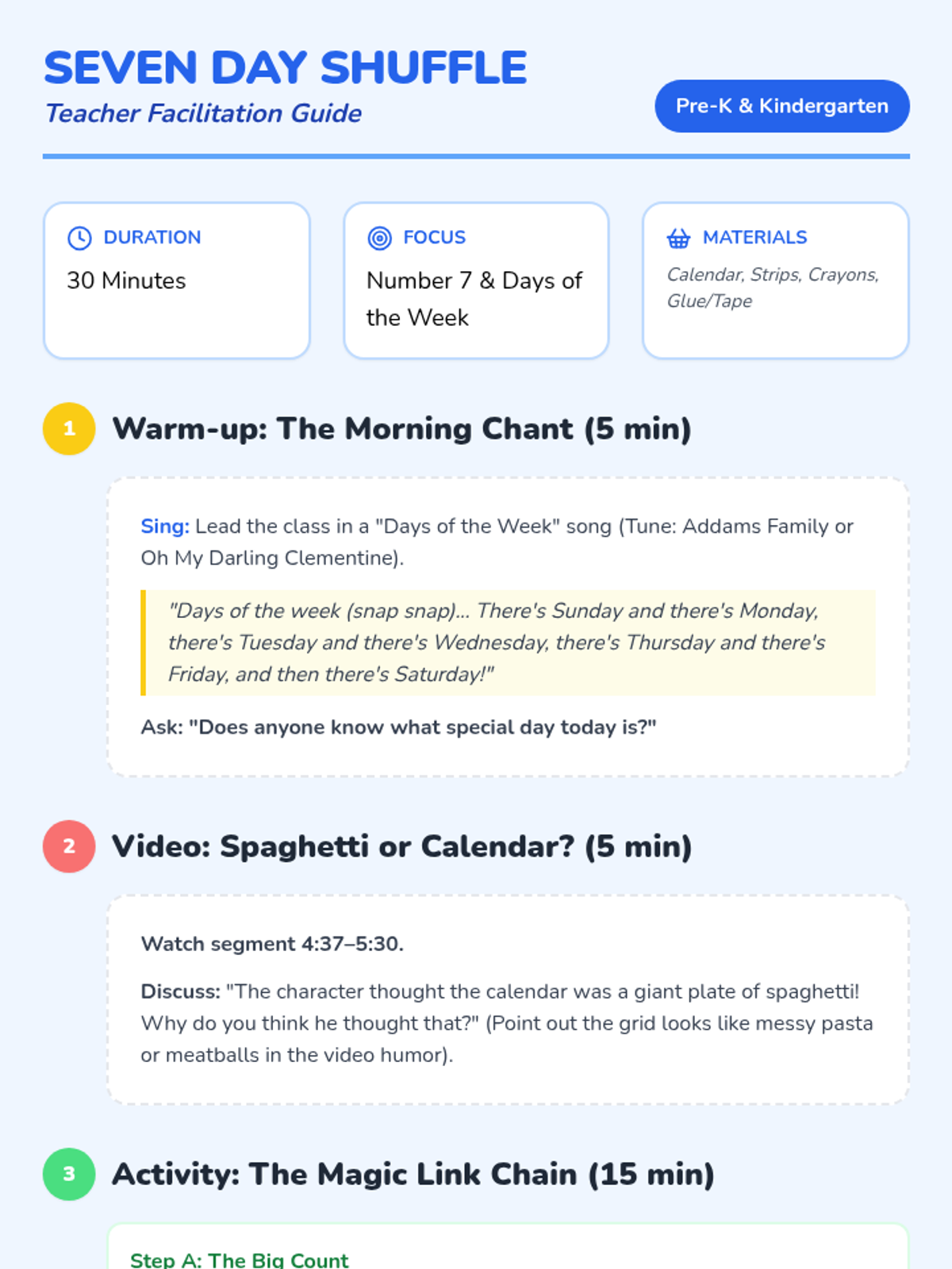 A fun, introductory lesson for Pre-K and Kindergarten students to learn the days of the week and the number 7 using a humorous calendar video and a hands-on paper chain activity.