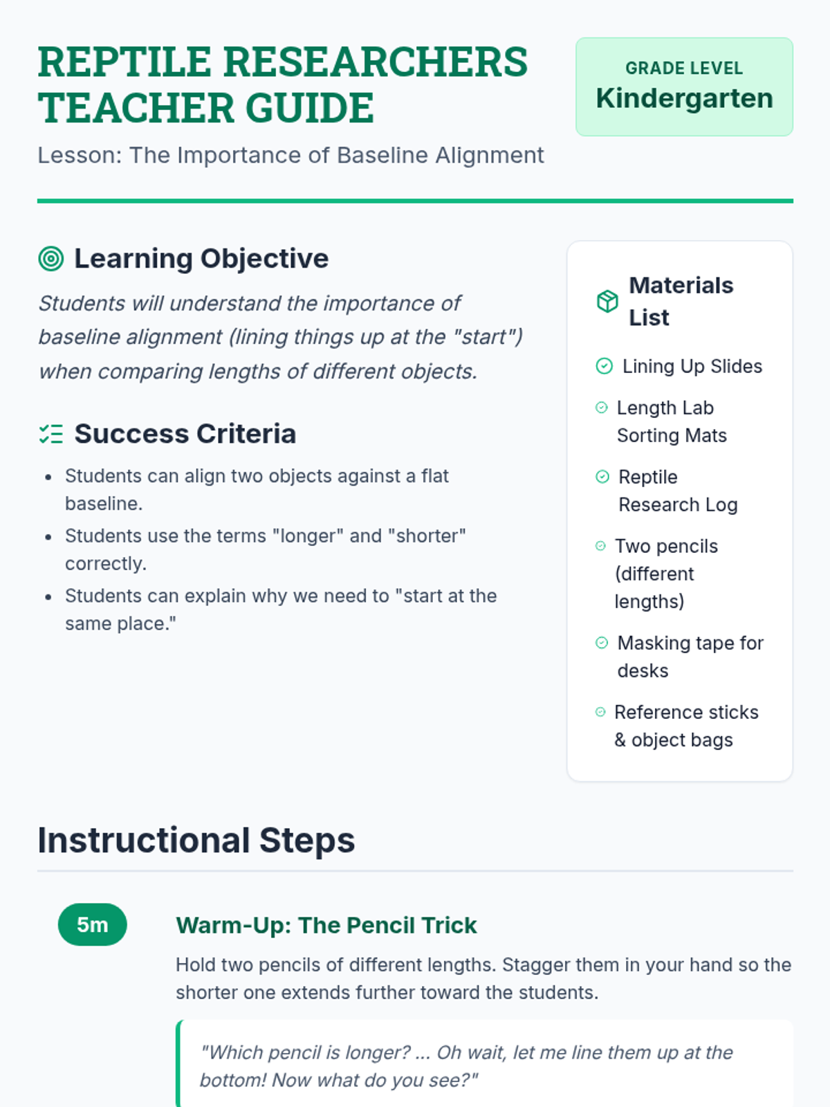 A Kindergarten math lesson focusing on length comparison and the critical importance of baseline alignment using a zoo/reptile theme. Students use visual cues from a video and hands-on sorting to master comparing objects.