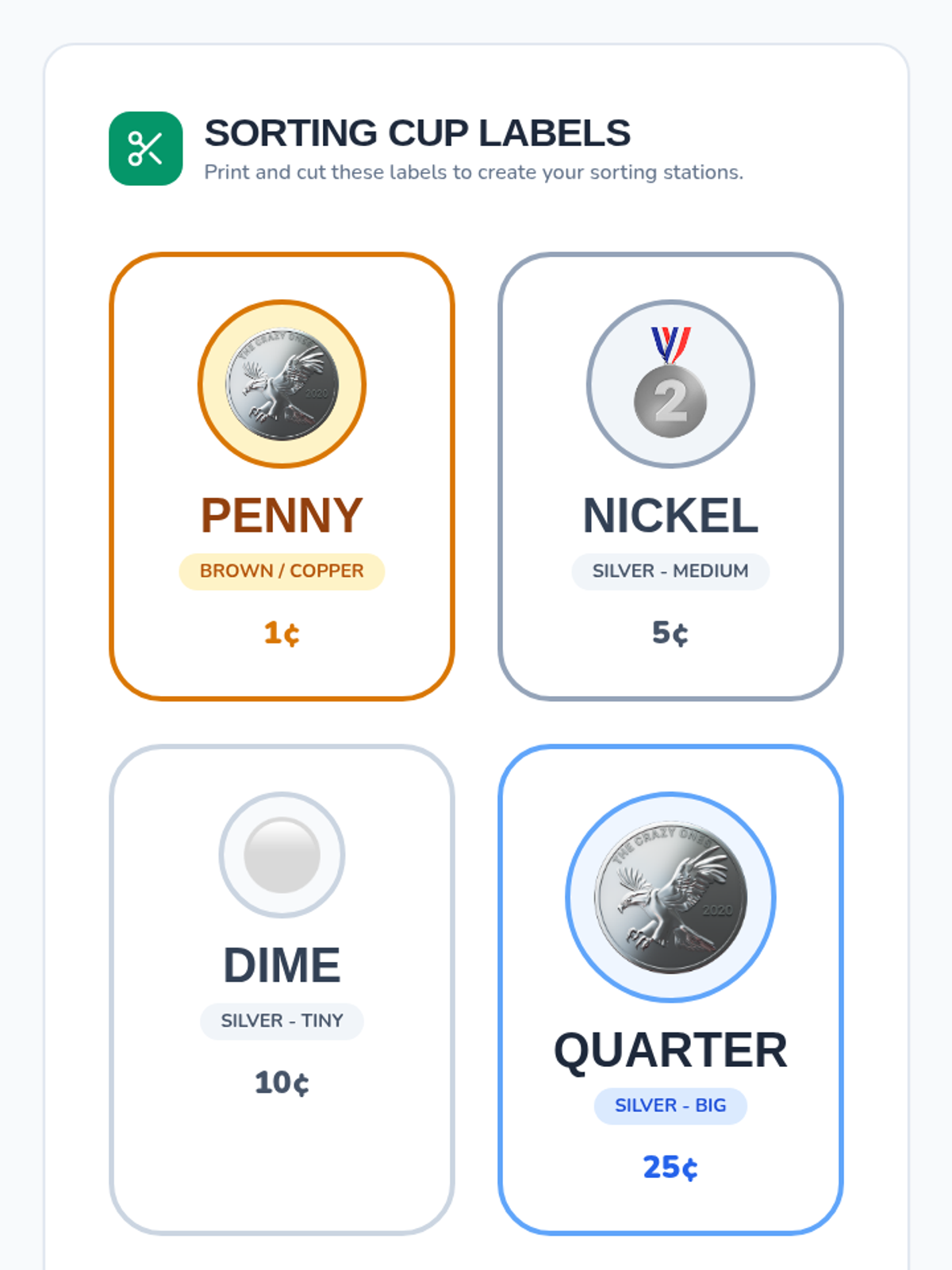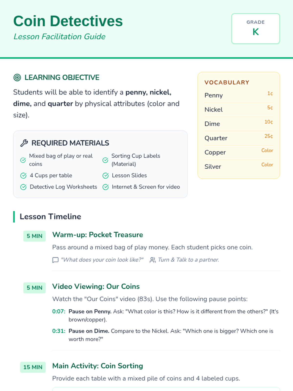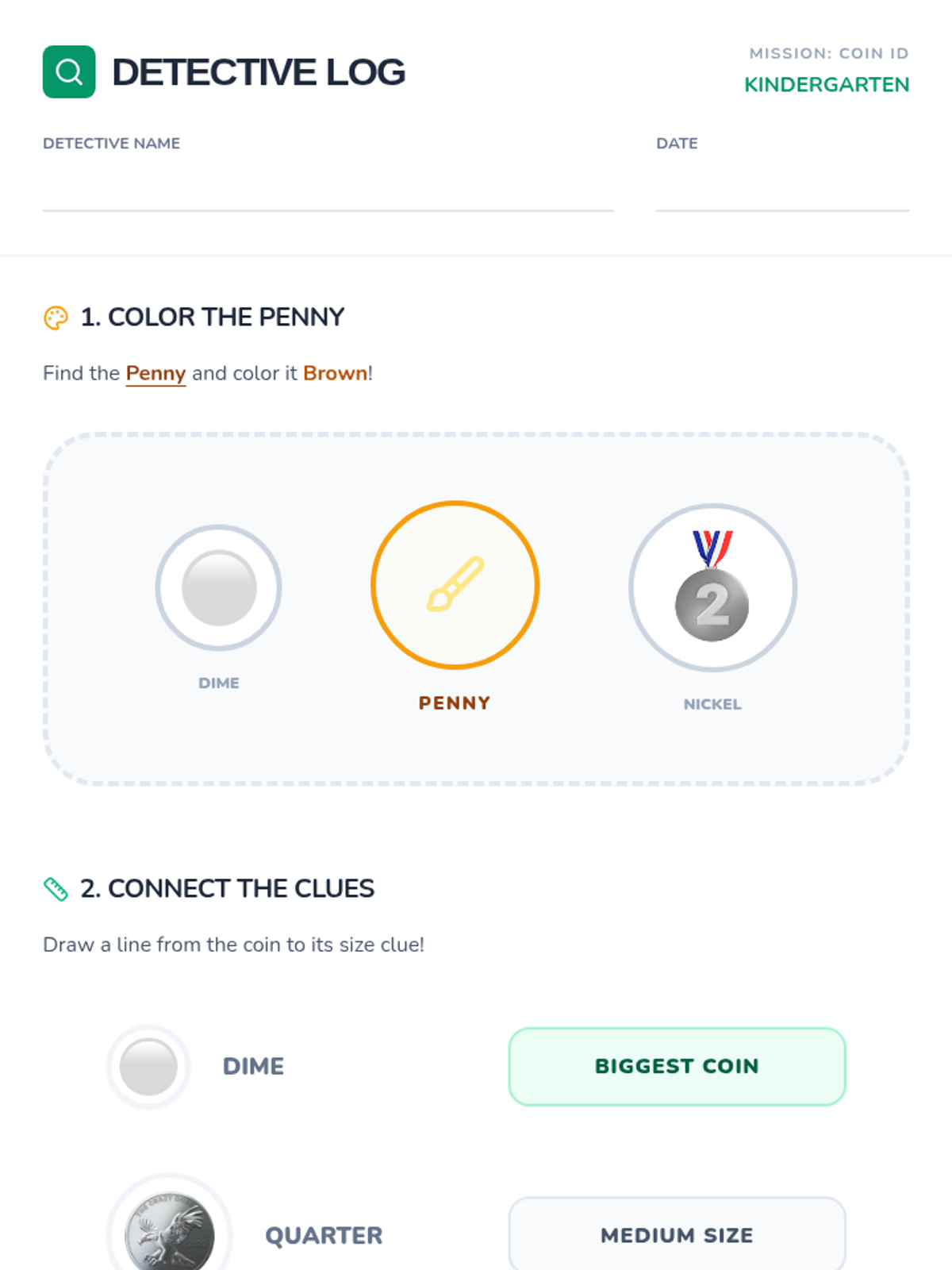 A hands-on introductory lesson where Kindergarten and 1st Grade students use their detective skills to identify U.S. coins by their color, size, and faces.