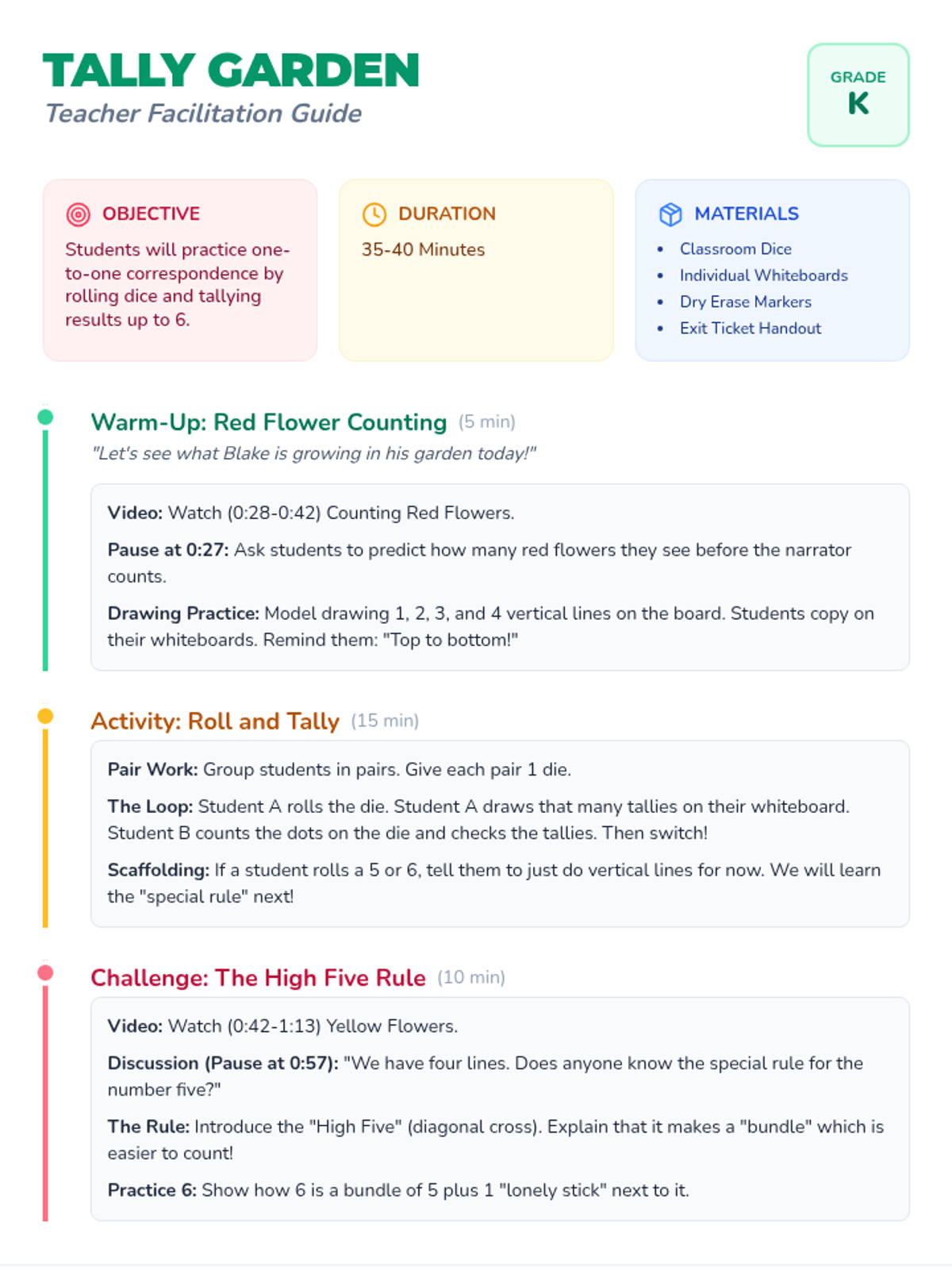 A Kindergarten math lesson on one-to-one correspondence and tally marks using a garden-themed video and dice activities. Students learn to draw vertical tally marks for 1-4 and the 'High Five' diagonal rule for groups of 5.