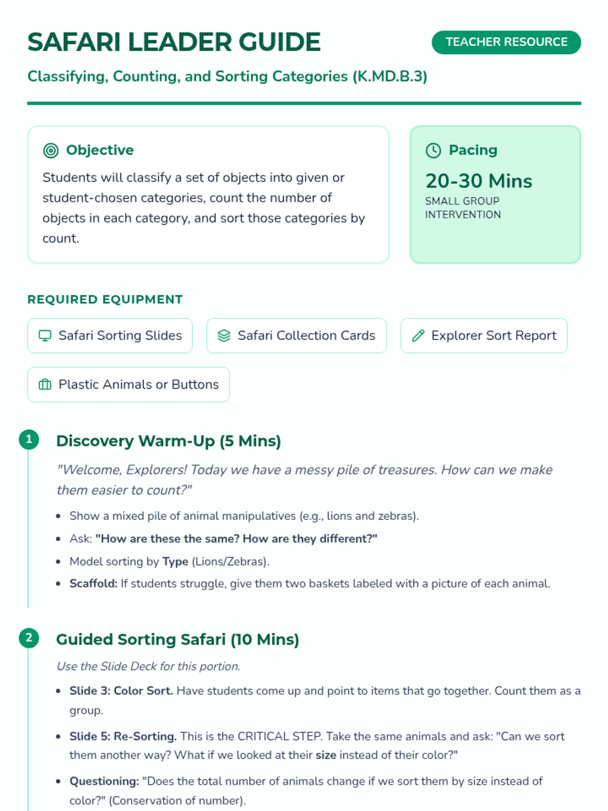 A Tier 2 intervention lesson for Kindergarteners focusing on classifying objects, counting categories, and re-sorting by different attributes. Students will explore multiple ways to organize the same set of objects to build flexible mathematical thinking.