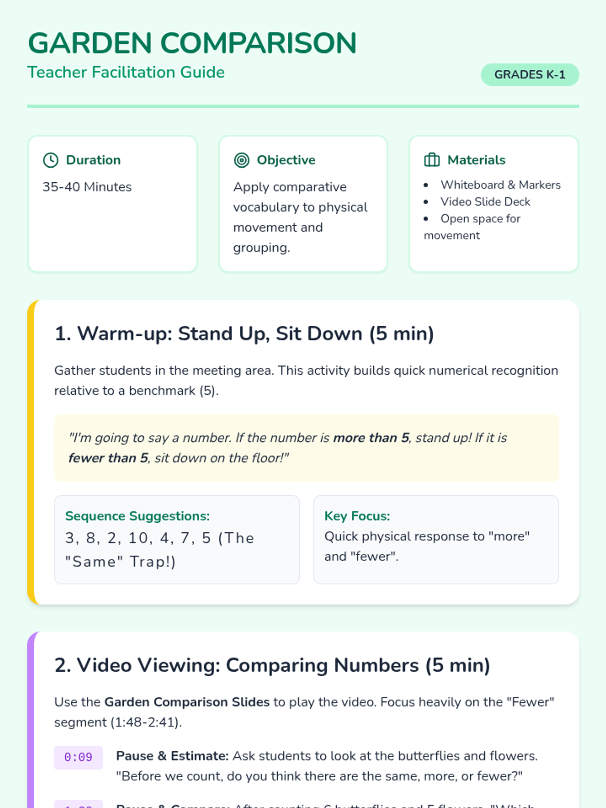 A Kindergarten and 1st Grade lesson focused on comparing groups of objects within 10 using the terms 'more than', 'fewer than', and 'the same'. Students engage in physical movement, video analysis, and human graphing.