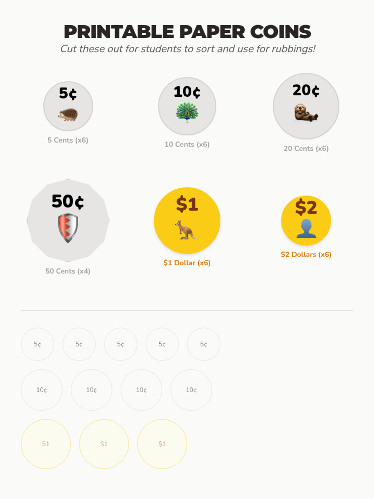 A Kindergarten lesson focused on identifying Australian coins by color (gold and silver) and the unique animals featured on their tails side. Students will use tactile activities like sorting and rubbing to reinforce their recognition skills.