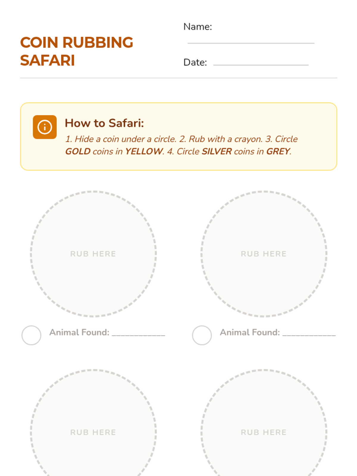 A hands-on introductory lesson for Pre-K students to explore the visual features of Singapore coins, focusing on color recognition (gold vs. silver) and pattern discovery through coin rubbings.