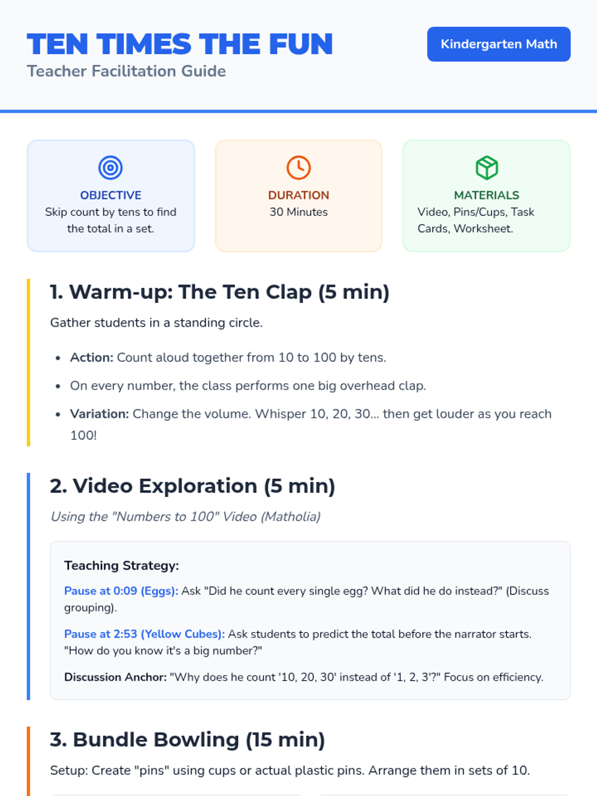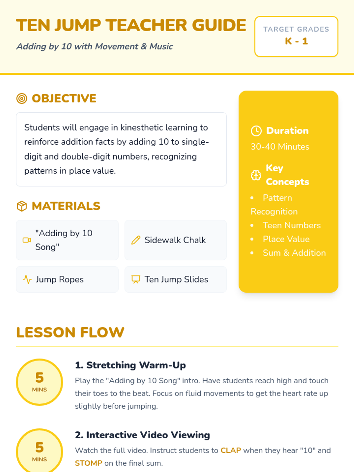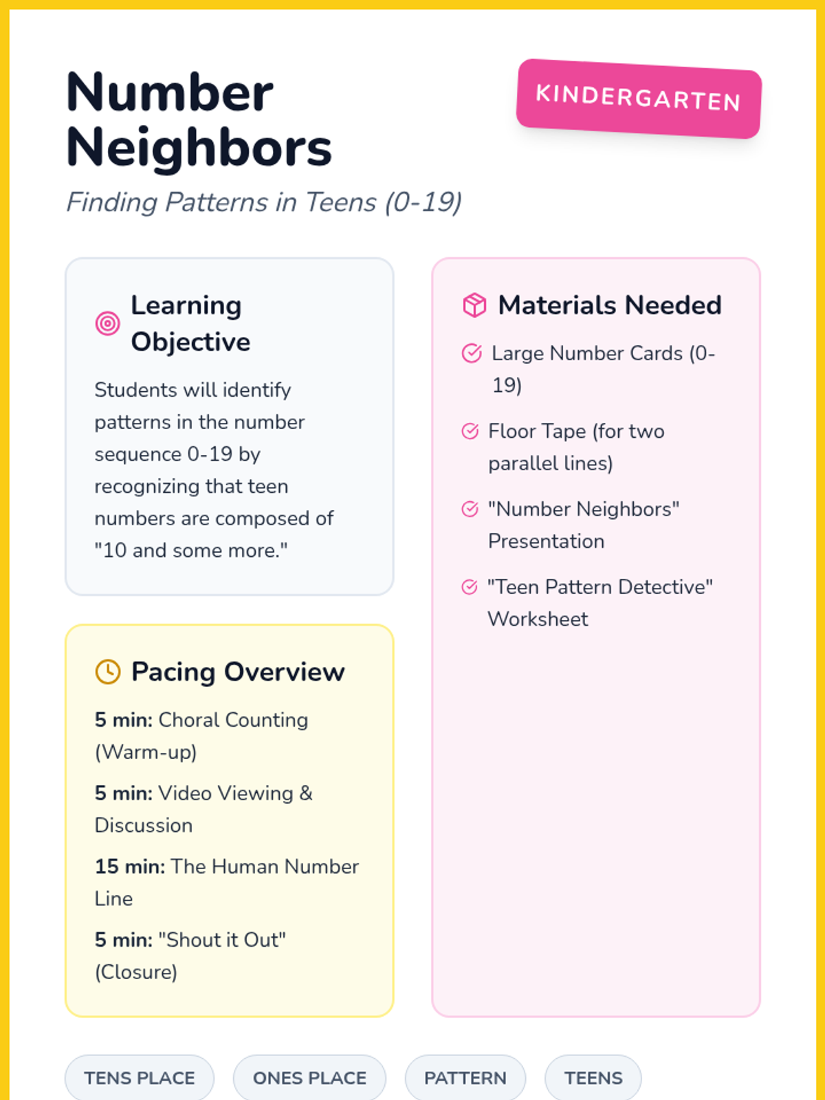 A high-energy, duck-themed 30-minute lesson focusing on counting 1-20, one-to-one correspondence, and number ordering. Students will use visual slides, hands-on counting cards, and practice worksheets to master number recognition and representation.