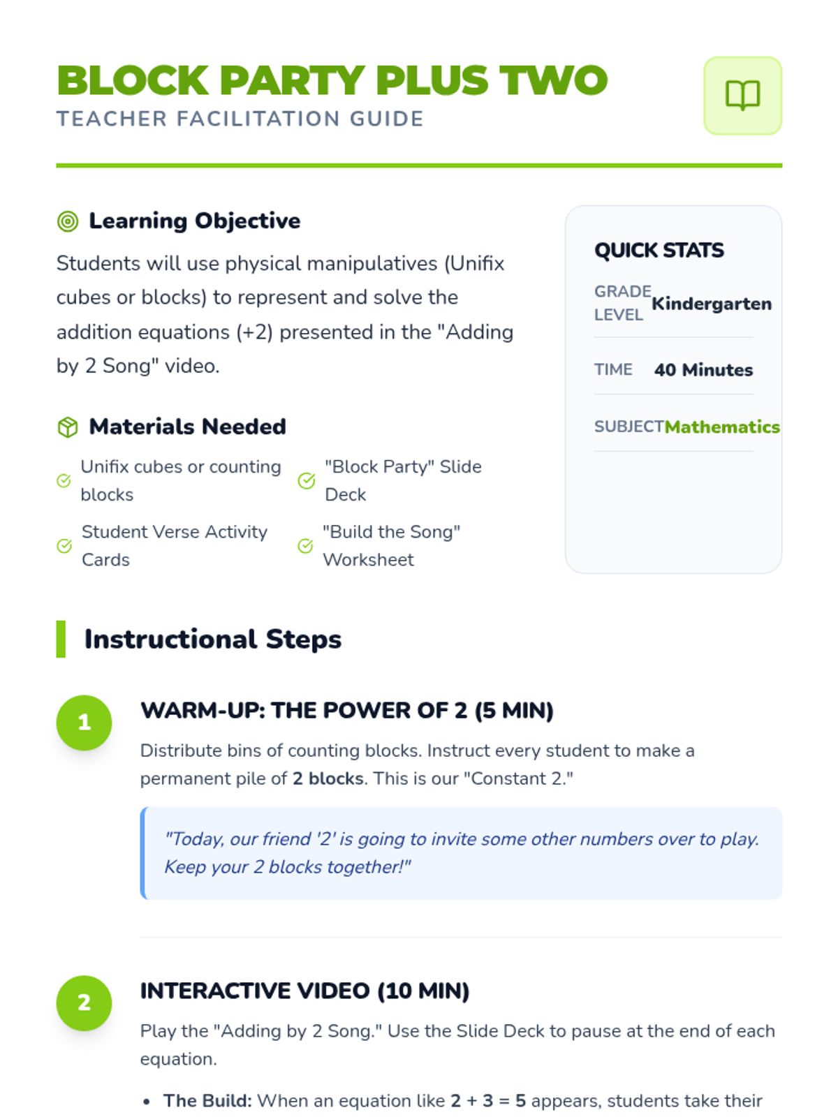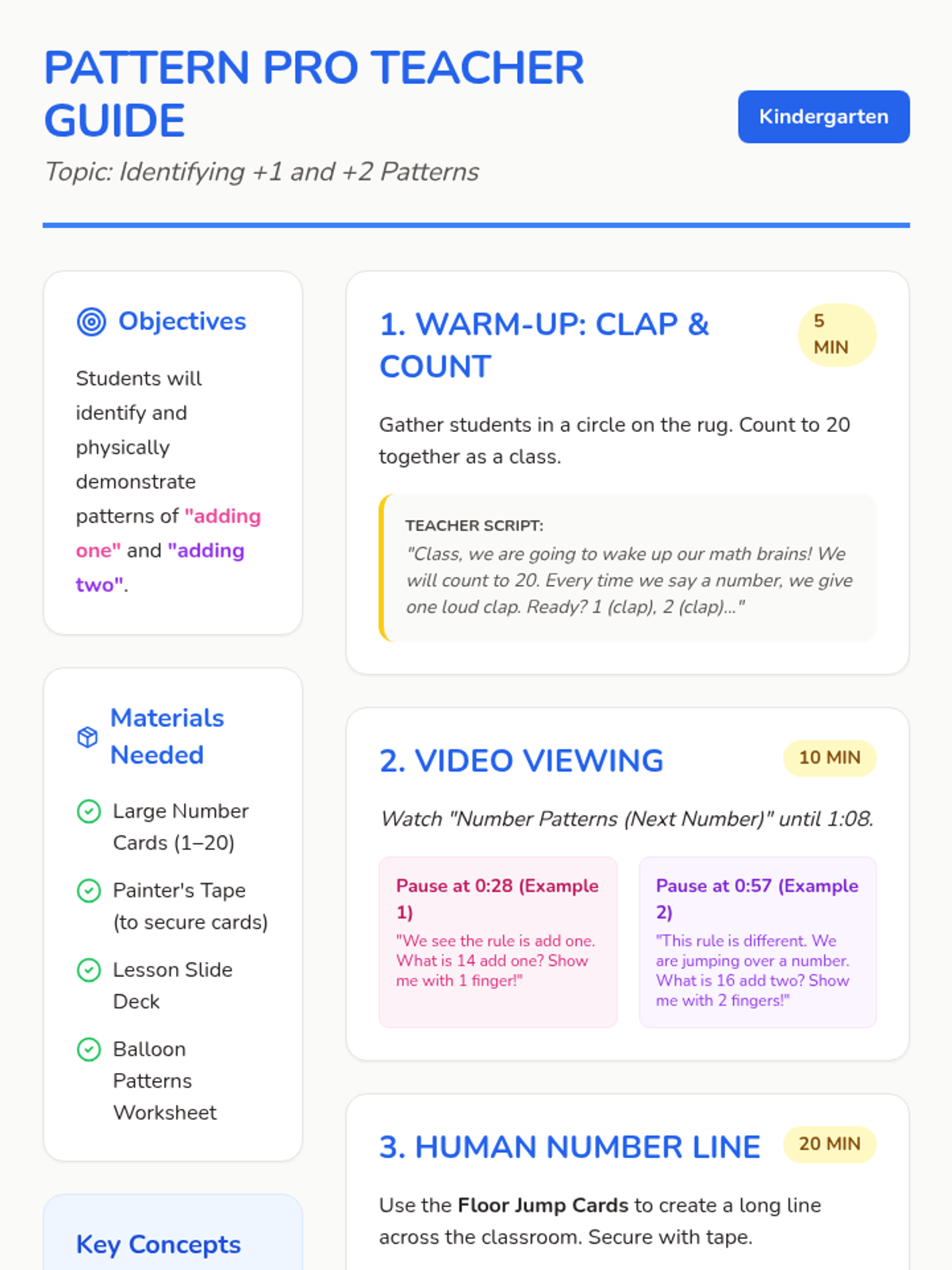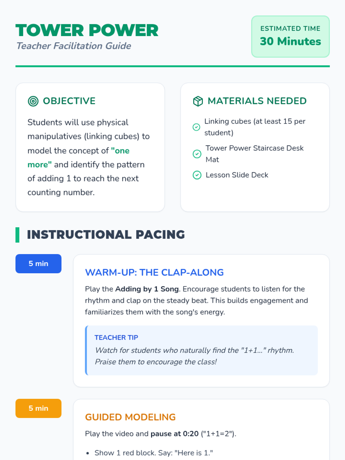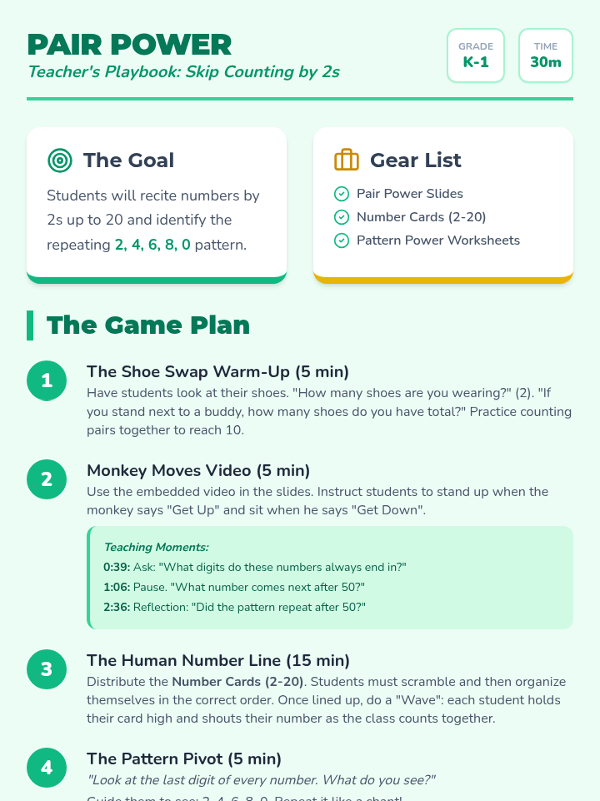A high-energy, duck-themed 30-minute lesson focusing on counting 1-20, one-to-one correspondence, and number ordering. Students will use visual slides, hands-on counting cards, and practice worksheets to master number recognition and representation.
